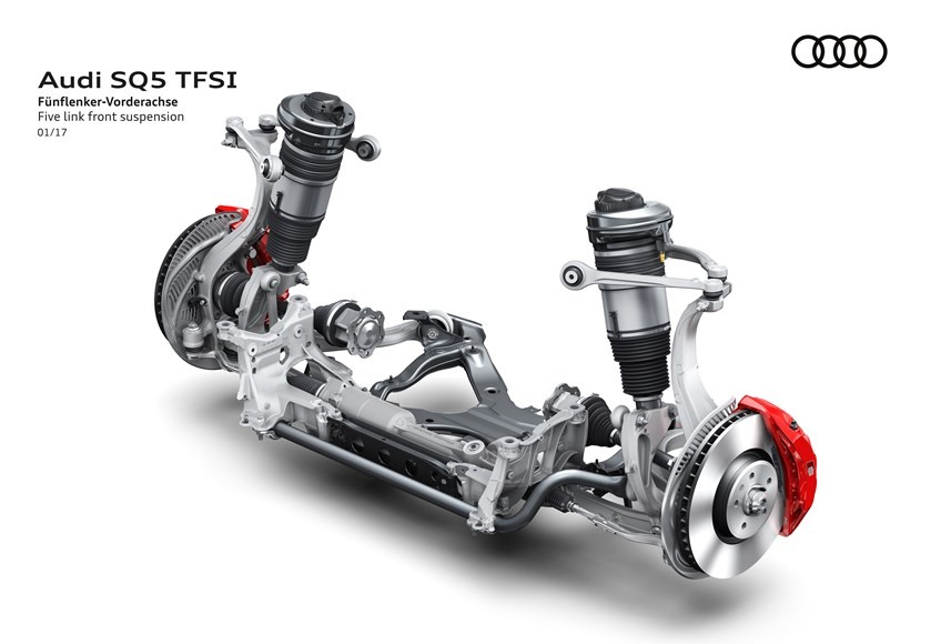 La suspensión de cinco brazos en los ejes delantero y trasero establece las bases para el comportamiento deportivo del Audi SQ5. Su elaborado diseño proporciona mayor estabilidad al límite y combina agilidad con un gran confort. El sistema de amortiguación controlada electrónicamente ofrece una distribución particularmente amplia entre los tarados más confortable y más dinámico. La amortiguación adaptativa CDC (control continuo de la amortiguación) se integra en el sistema Audi drive select junto con el motor, la dirección, el cambio tiptronic y el diferencial deportivo opcional. Esto permite al conductor controlar las características del motor y de la suspensión en base a diferentes programas. La suspensión neumática S está disponible como opción. Permite al conductor adaptar no sólo la amortiguación, sino también la altura de la carrocería en función de cada situación de conducción.