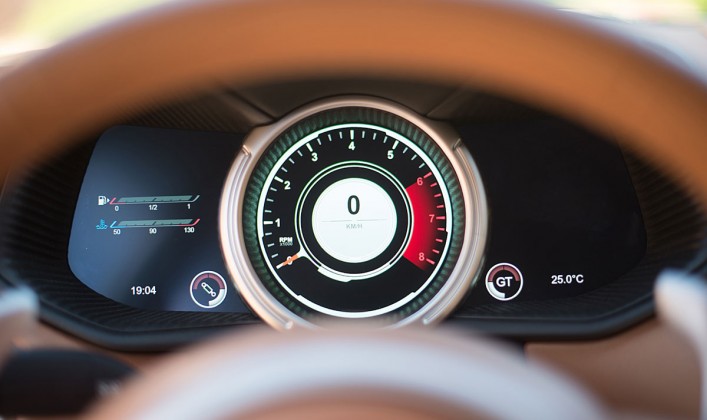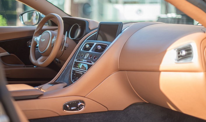 En el interior, es quizás dónde más cambios vemos con respecto al resto de la gama Aston Martin. Estrena un cuadro digital de 12,3 pulgadas, desarrollado en combinación con Daimler y una nueva pantalla situada en el centro de la consola de 8 pulgadas que agrupa todo el sistema de info entretenimiento. Los mandos del climatizador así como el mando para manejar todo el sistema multimedia son herencia directa de la asociáción con la marca germana.