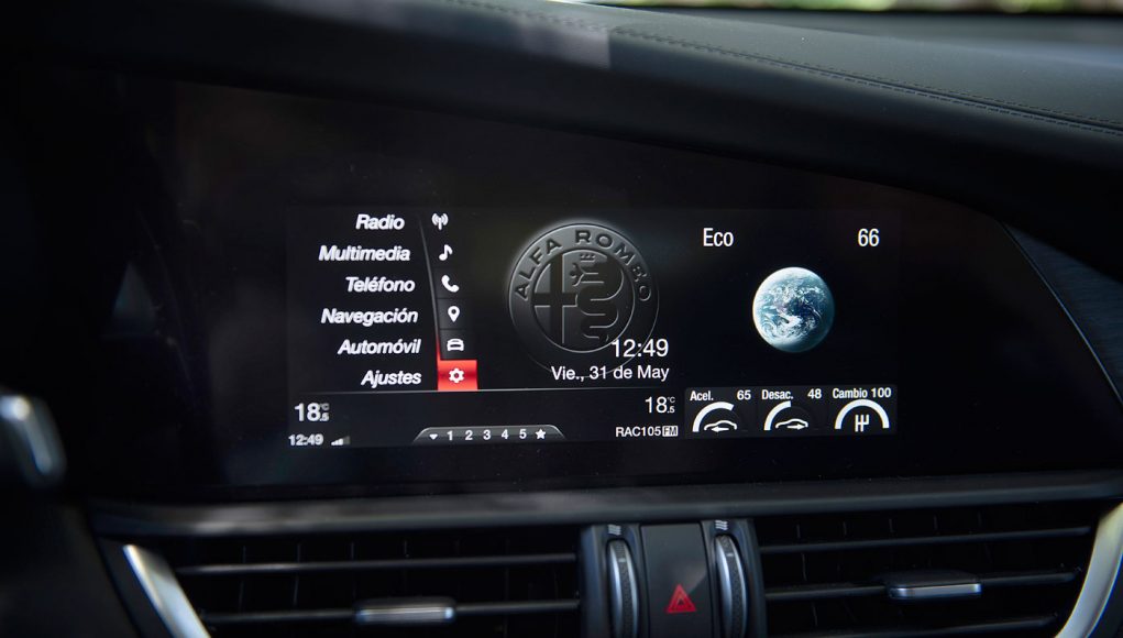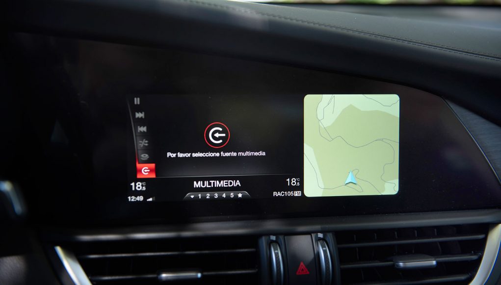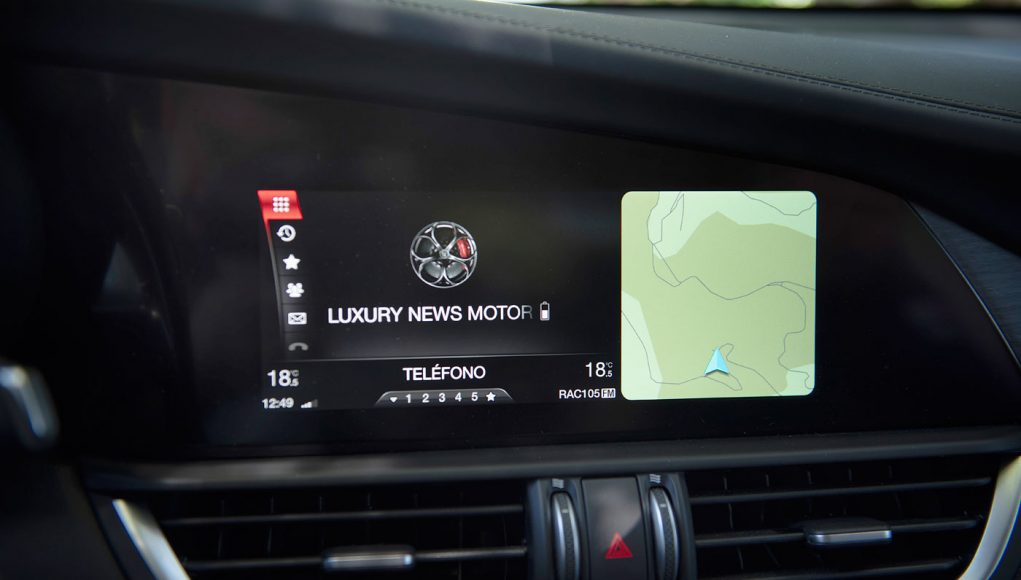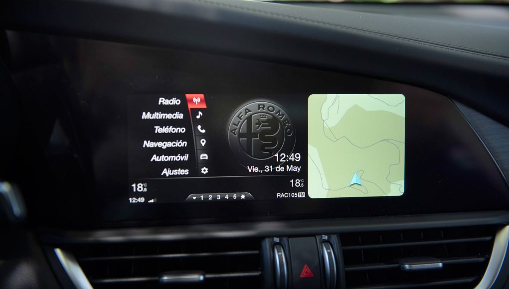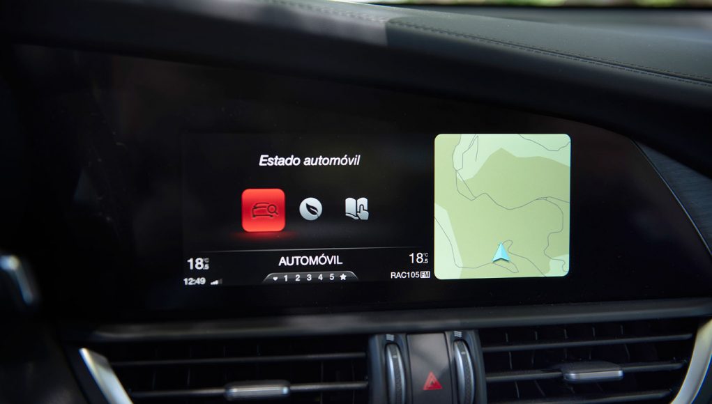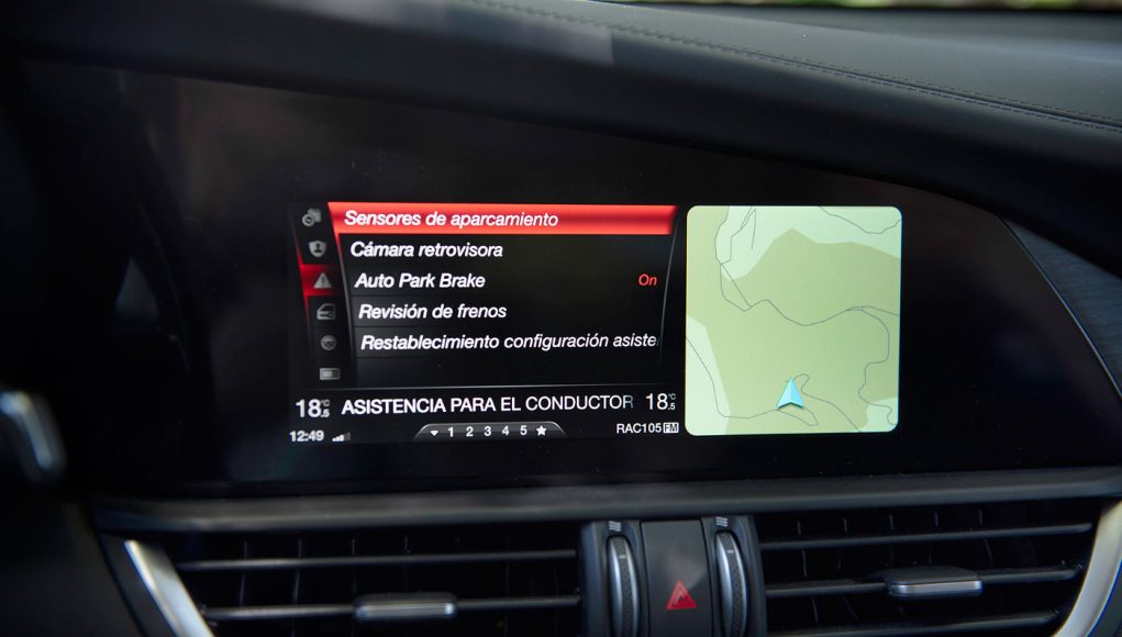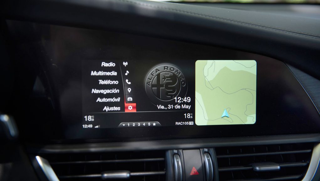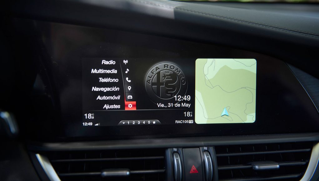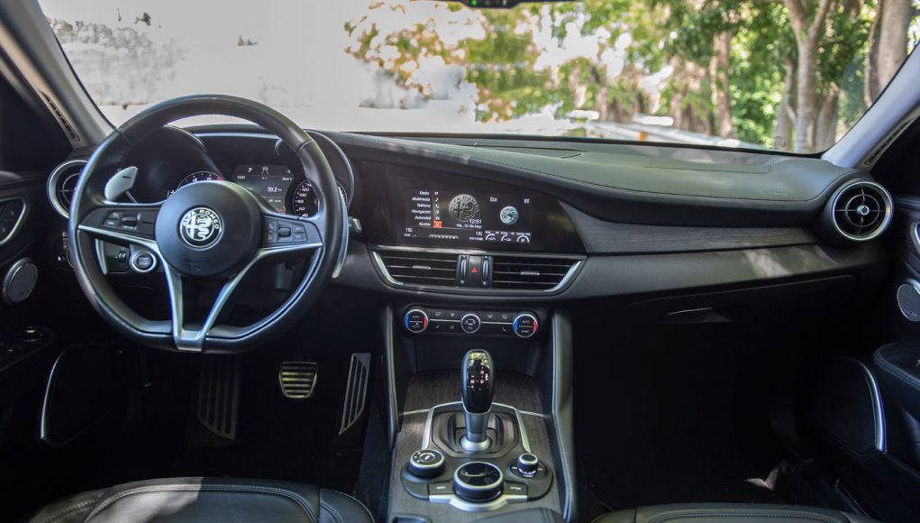 En el habitáculo, respira el aire sobrio de la marca, pero es dónde quizás, y con respecto a sus más directos competidores alemanes, le falte un poquito de calidad en algunos materiales para terminar de ser un “premium” al 100%, a la vez que equipamiento tecnológico. Parte del equipamiento de Giulia Veloce, son los nuevos asientos de corte deportivo denominados Sport y tapizados en piel negra con ajustes eléctricos y calefactados, que sujetan el cuerpo a la perfección, sobre todo en los apoyos laterales.