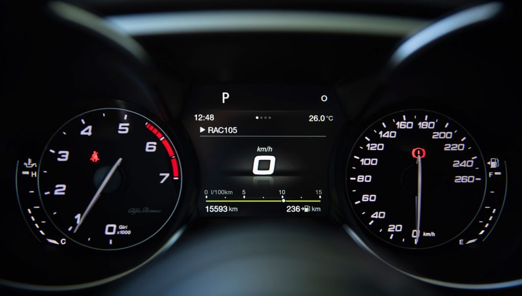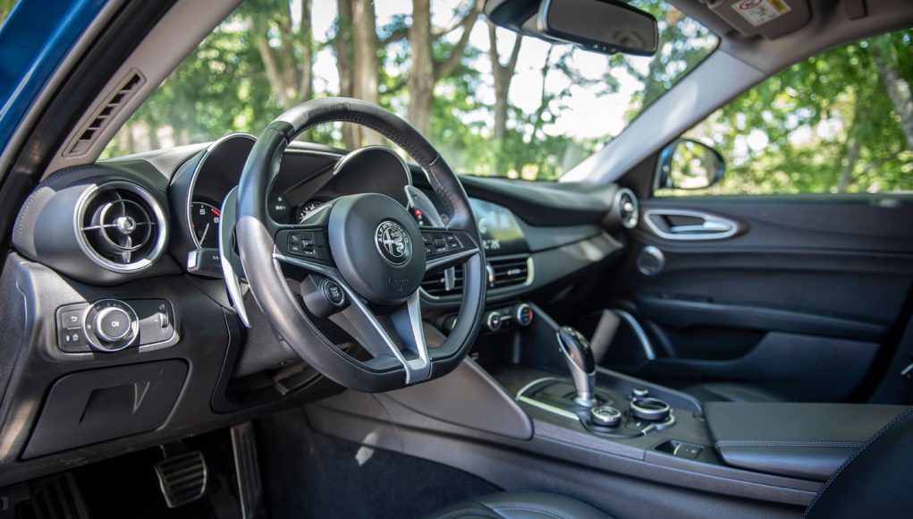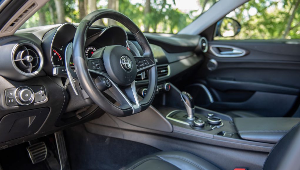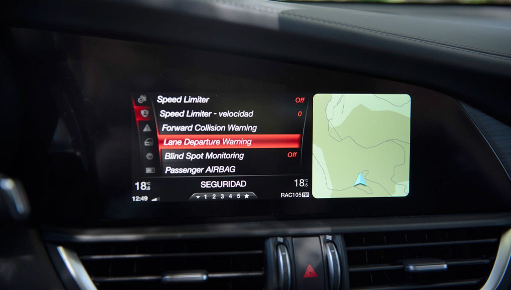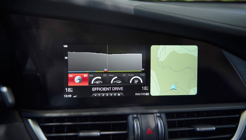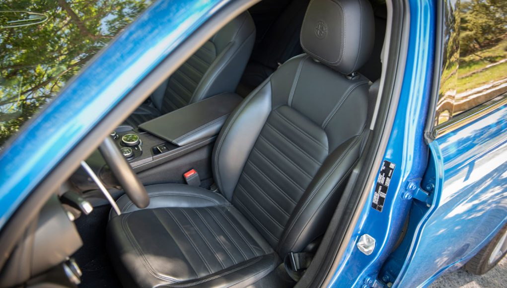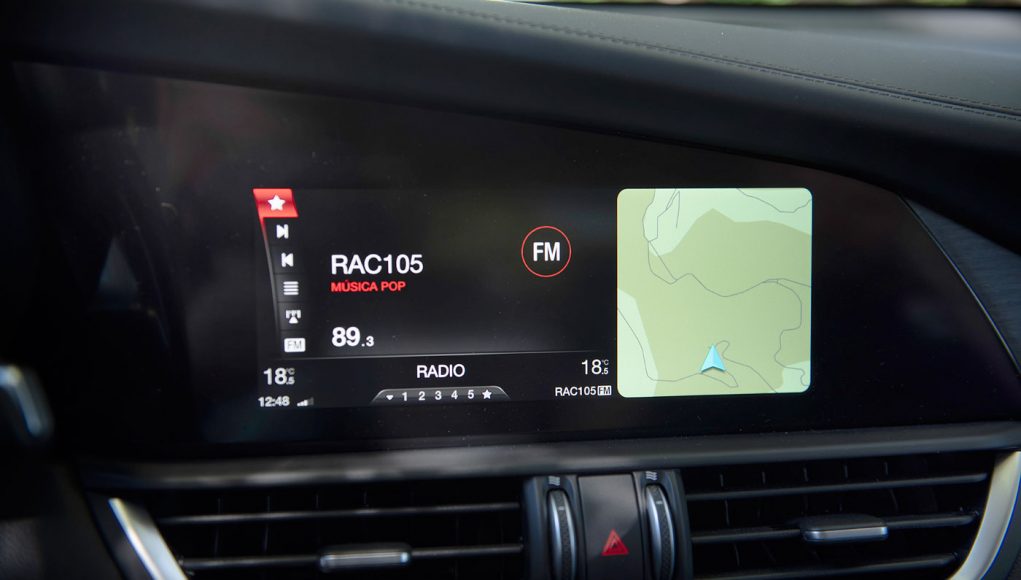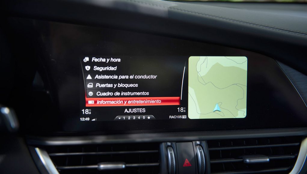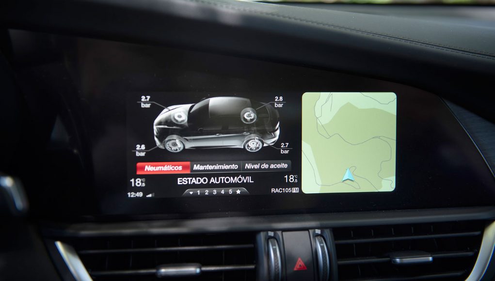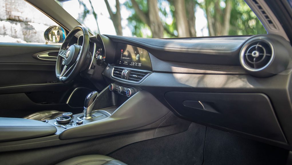 En el habitáculo, respira el aire sobrio de la marca, pero es dónde quizás, y con respecto a sus más directos competidores alemanes, le falte un poquito de calidad en algunos materiales para terminar de ser un “premium” al 100%, a la vez que equipamiento tecnológico. Parte del equipamiento de Giulia Veloce, son los nuevos asientos de corte deportivo denominados Sport y tapizados en piel negra con ajustes eléctricos y calefactados, que sujetan el cuerpo a la perfección, sobre todo en los apoyos laterales.
