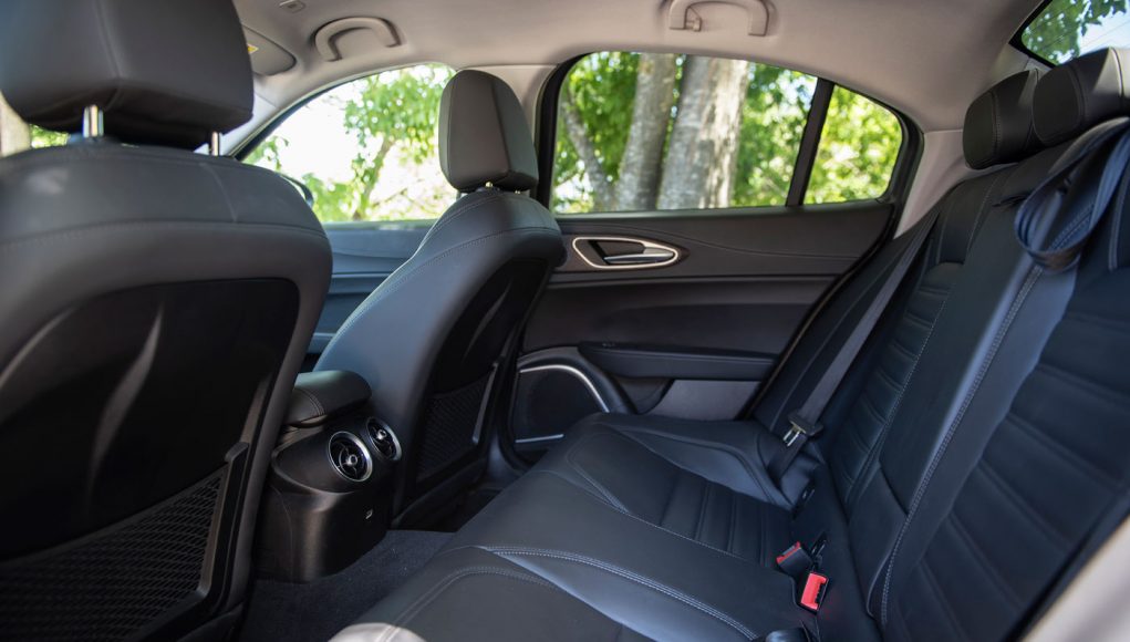 En las plazas traseras encontramos sitio para tres plazas, aunque como pasa en este tipo de berlinas, solo dos viajarán cómodamente, mientras que la de en medio verá penalizada su comodidad por el volumen que ocupa el túnel de la transmisión. Ahora bien, las dos plazas laterales, gracias a la enorme distancia entre ejes del Giulia, gozarán de un buen espacio para las piernas con respecto a los respaldos delanteros.
