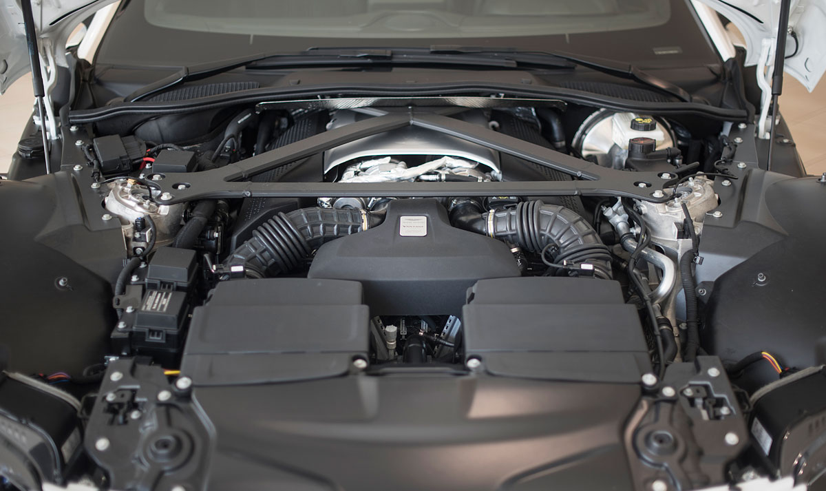 Bajo el capó delantero y en posición muy retrasada, encontramos un motor V8 de 4.0 litros biturbo de origen AMG, que rinde una potencia de 510 CV y ofrece un par motor de 685 Nm disponibles entre las 2.000 y las 5.000 rpm, siendo ahora 74 CV más potente que la versión Vantage S e igualando casi al Vantage V12 que disponía unos generosos 517 CV.