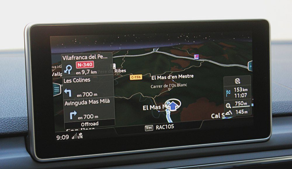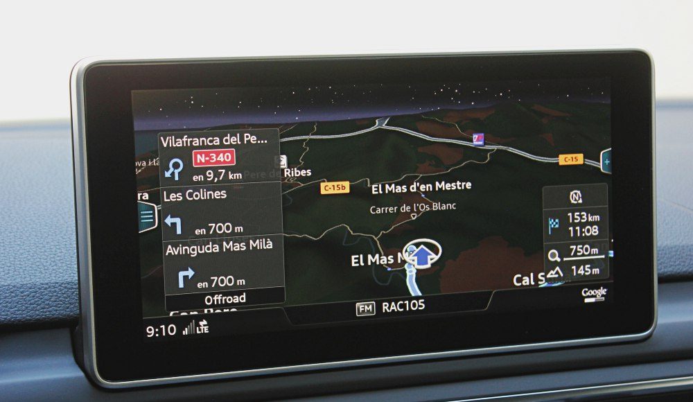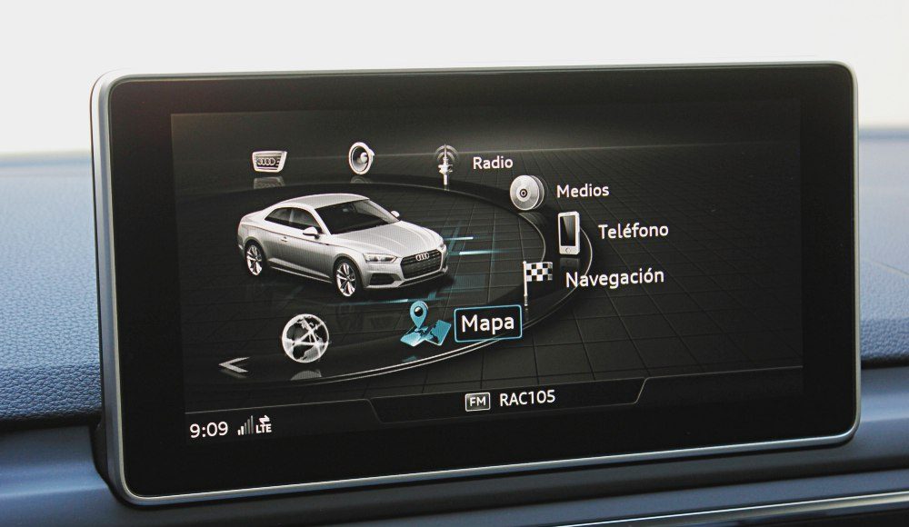 El centro de la consola lo preside la pantalla del sistema de navegación MMI Plus de 8,3”, desde la que se maneja todo el sistema de Info entretenimiento, así como el Audi smartphone interface, que te permite conectar tu smartphone, para disfrutar por ejemplo de Spotify para escuchar música, o bien de la cartografía de Google maps para poder llegar a tu destino previamente escogido en Google. Lástima que no sea táctil, pues ya sería perfecta.