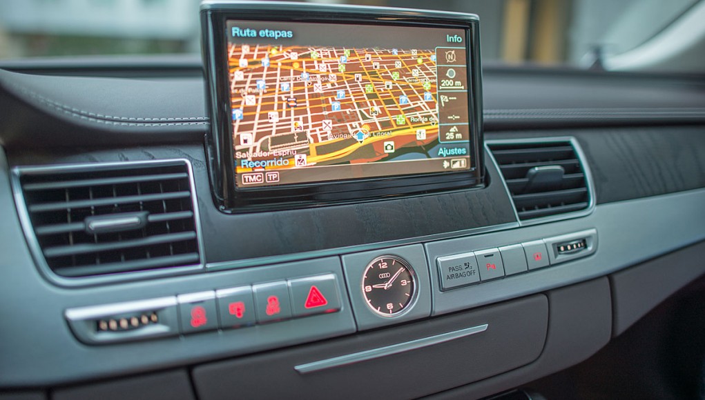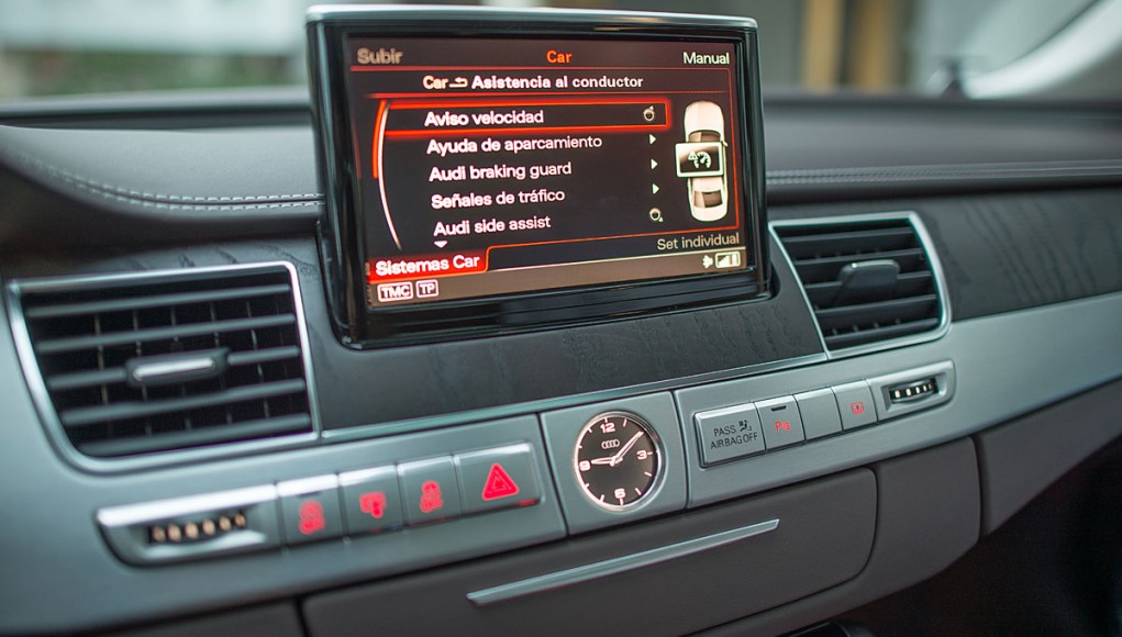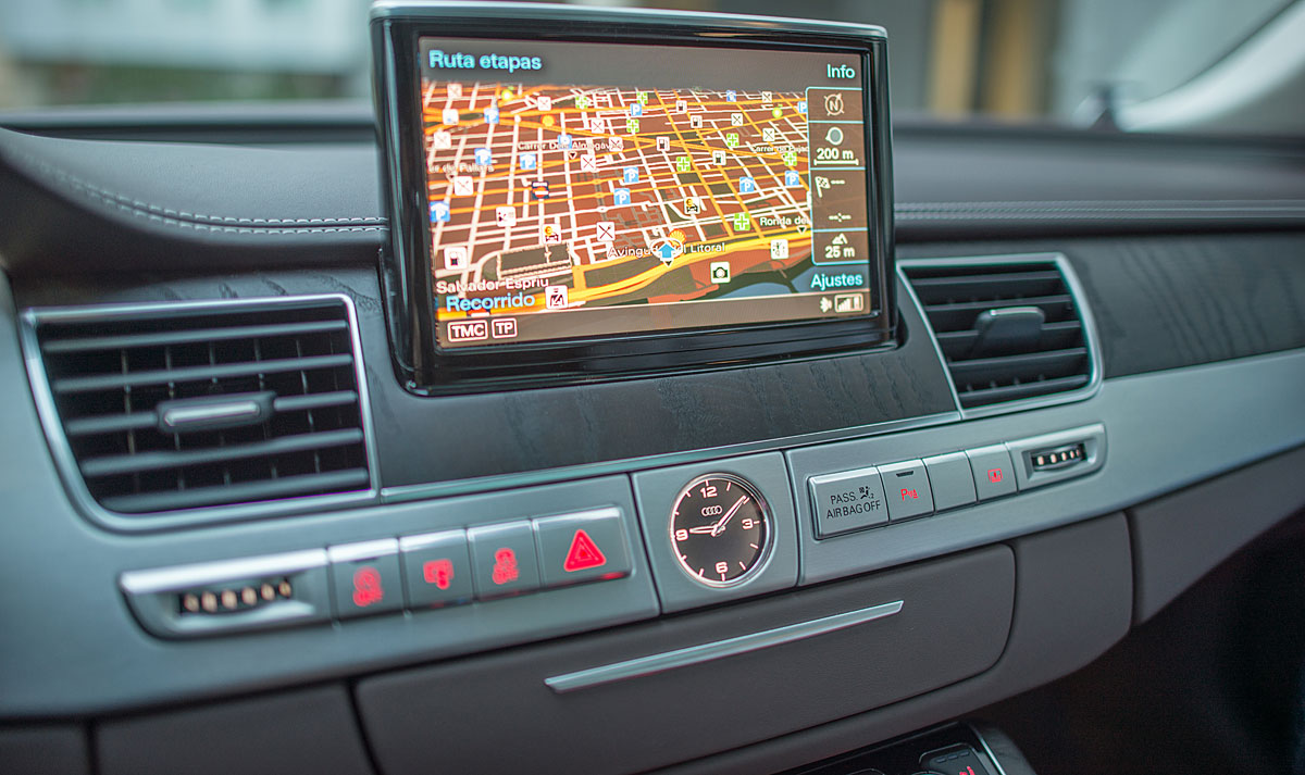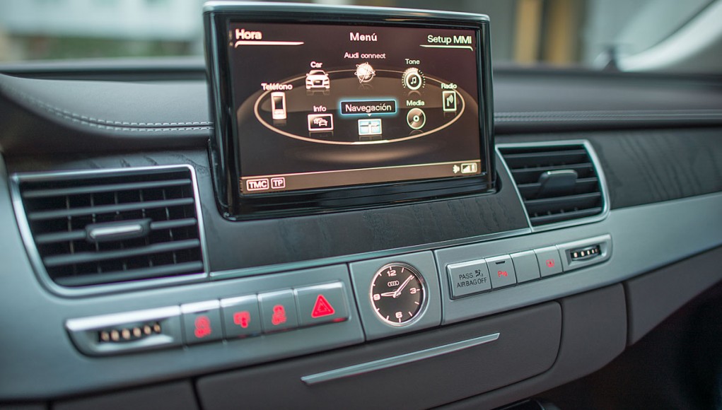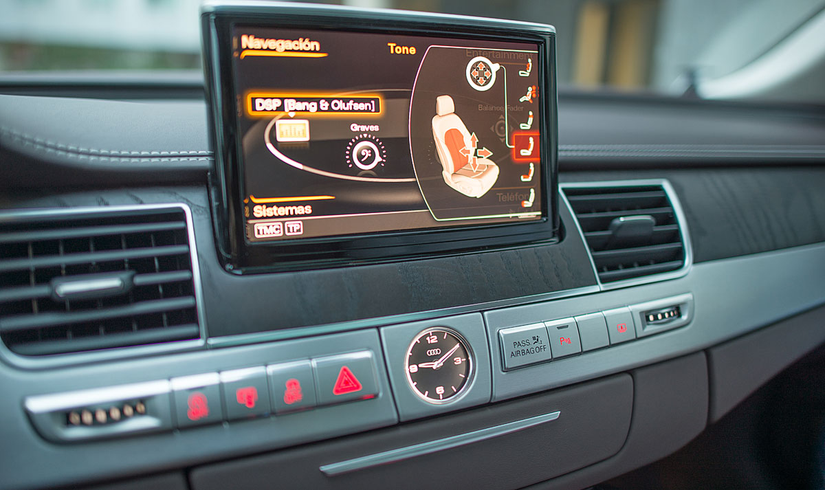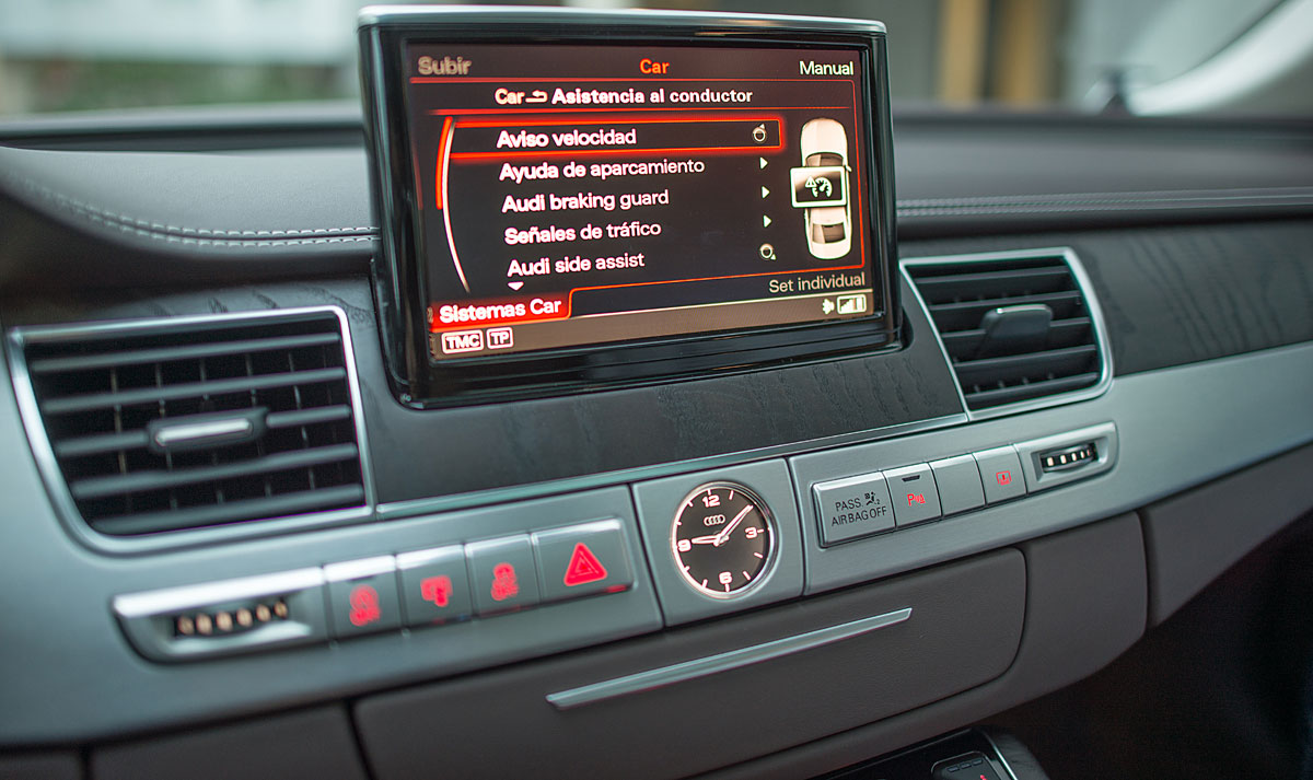 La parte central está presidida por una pantalla de 8” que emerge a nuestra voluntad, y desde la que se maneja el sistema de audio, entretenimiento multimedia, el GPS o el teléfono entre otras cosas, cuyo manejo a través del MMI touch es más que intuitivo. El climatizador del Audi A8, está considerado como uno de los mejores del mundo, por su efectividad y funcionamiento, ofreciendo a todos los ocupantes una sensación climática que se adapta a cualquier estación del año.