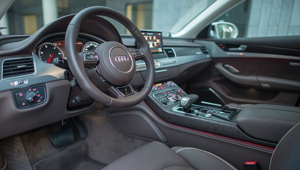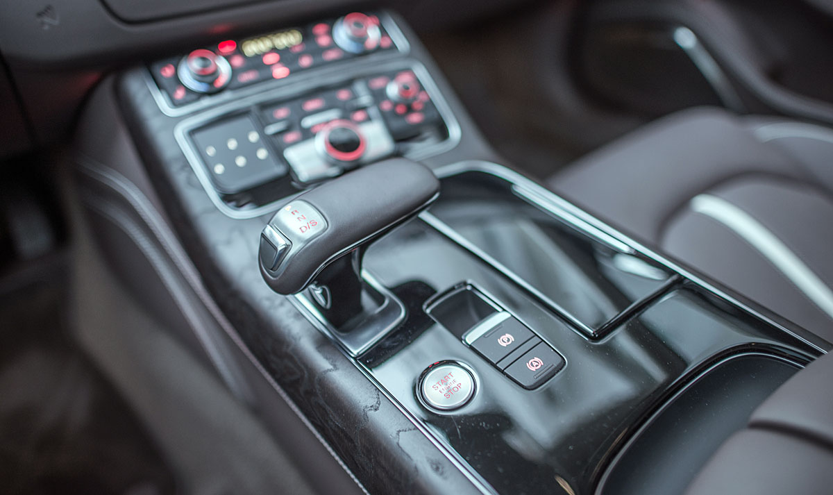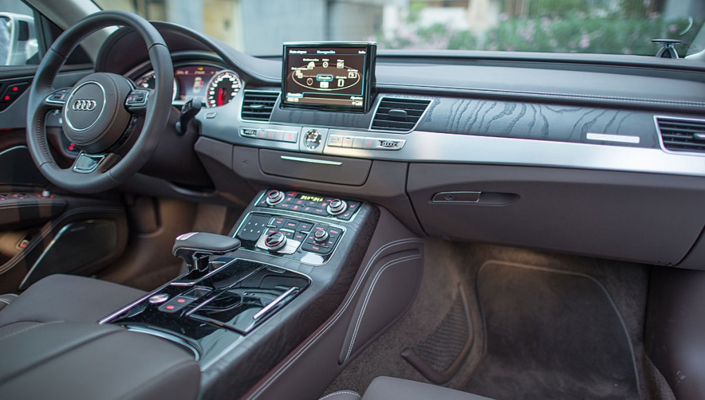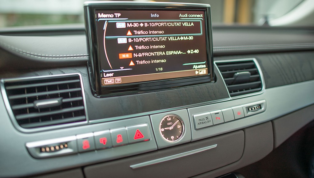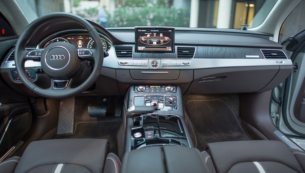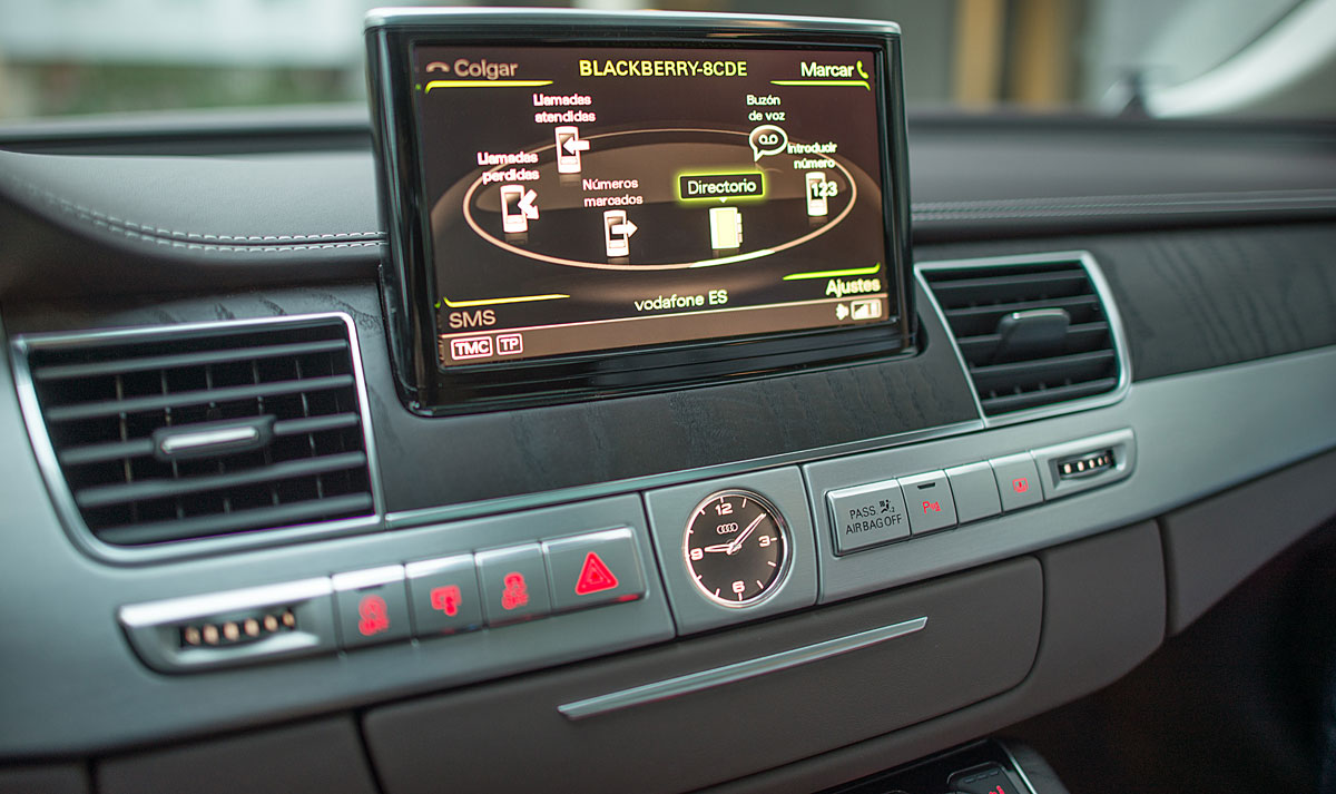 La parte central está presidida por una pantalla de 8” que emerge a nuestra voluntad, y desde la que se maneja el sistema de audio, entretenimiento multimedia, el GPS o el teléfono entre otras cosas, cuyo manejo a través del MMI touch es más que intuitivo. El climatizador del Audi A8, está considerado como uno de los mejores del mundo, por su efectividad y funcionamiento, ofreciendo a todos los ocupantes una sensación climática que se adapta a cualquier estación del año.