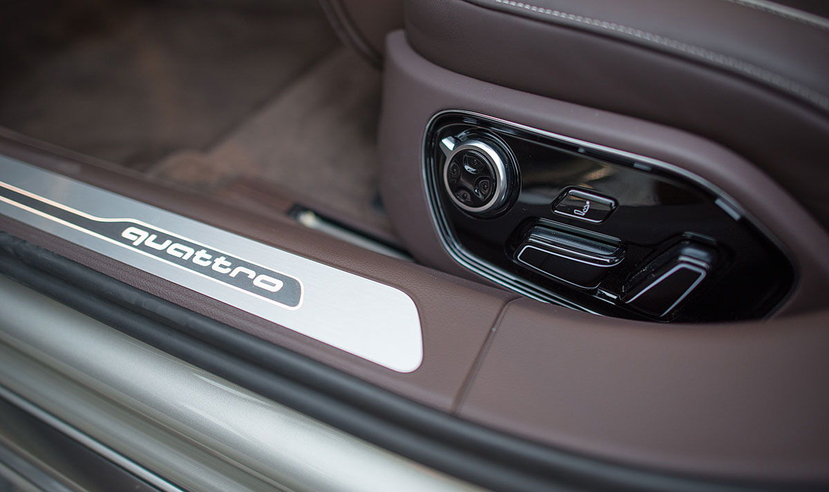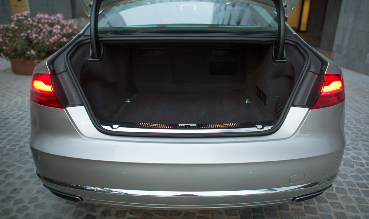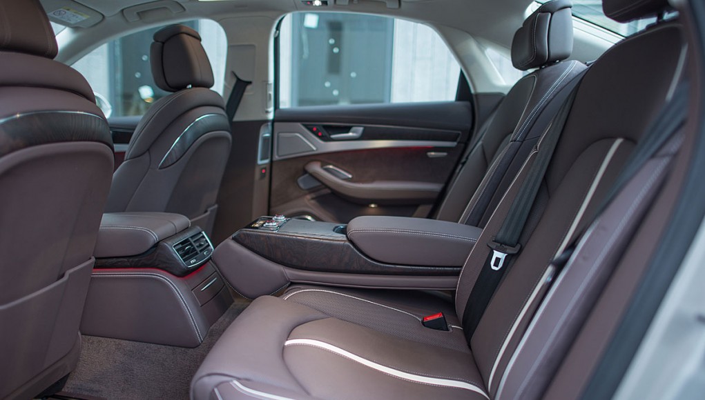 La parte trasera está configurada para dos ocupantes, que disponen de dos asientos independientes que pueden reclinarse para disfrutar cómodamente de cualquier largo viaje a bordo del A8. El reposabrazos, agrupa los mandos de los asientos, así como el sistema de climatización y calefacción para los asientos traseros que son independientes para esta zona del coche.