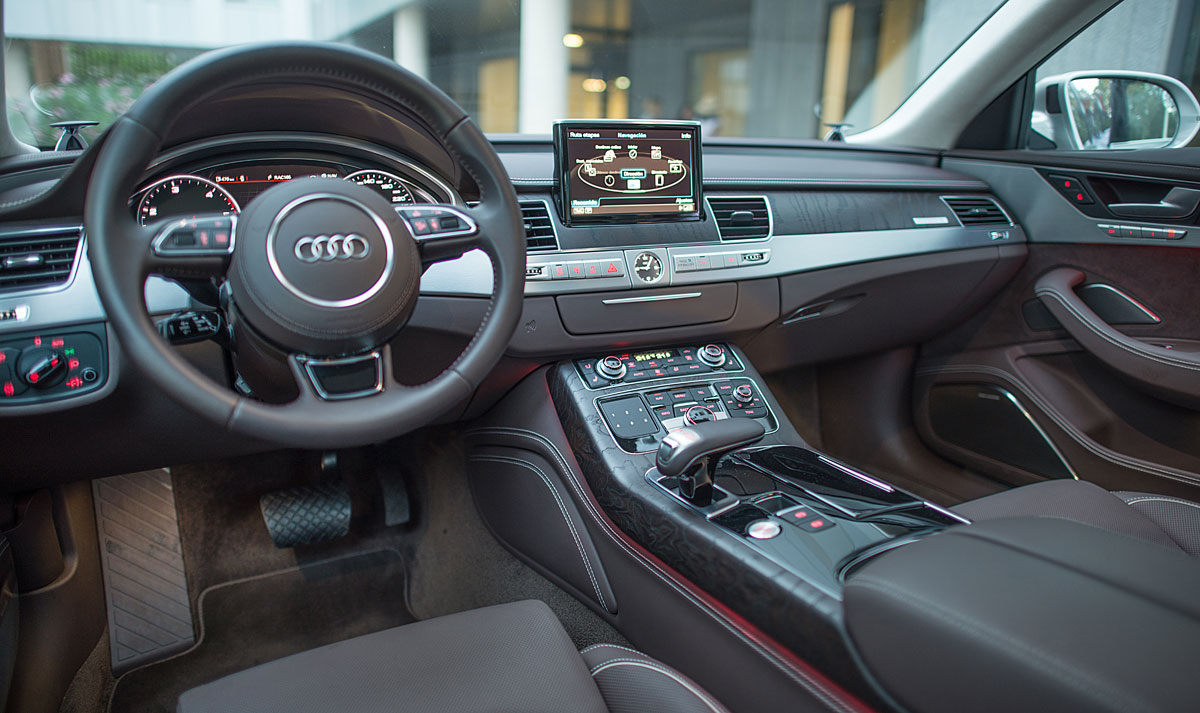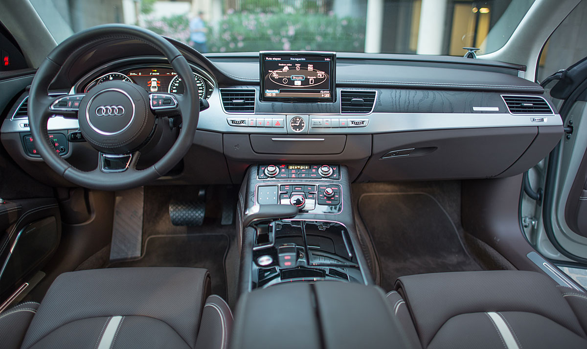 Cuando abres la puerta del A8, te das cuenta de que en el mercado hay muchos coches, y después están los Audi. La sobriedad, el lujo, la elegancia y la tecnología se aúnan en un interior repleto de infinitos detalles que nos recuerdan en todo momento porque este coche se ha convertido en el estandarte de una marca como Audi. El paquete Audi Design Selection, que pudimos ver en esta unidad, incluye elementos que le dan un toque artesanal al interior, como se merece, entre los que encontramos la tapicería de Cuero Valcona, el volante de piel, el techo revestido de alcántara o las maderas de fresno combinadas con el aluminio cepillado.