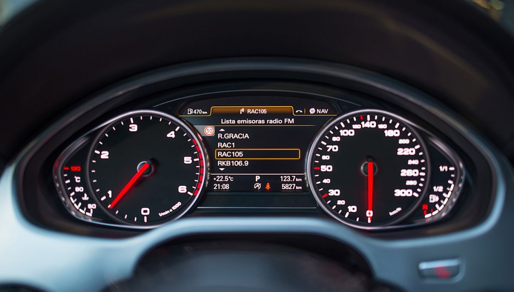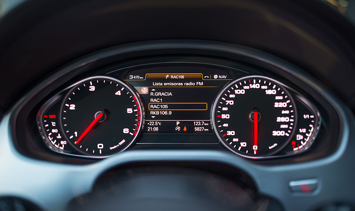 El cuadro de mandos, está presidido por dos enormes esferas separadas por una pantalla TFT que hace de ordenador de a bordo y de soporte a la pantalla central de la consola. En la parte más alta del salpicadero, encontramos el Head Display (opcional) donde se proyecta la información básica de la conducción. Uno de los sistemas que más interesantes nos ha parecido y equipaba este Audi es el asistente de visión nocturna y detección de peatones, aunque su función nos recuerde a algún que otro videojuego.