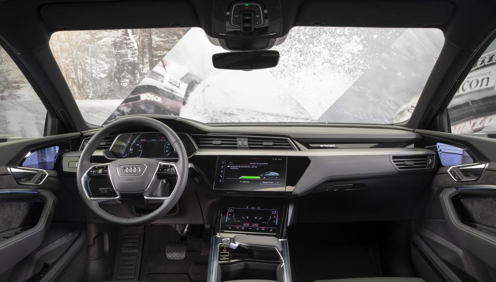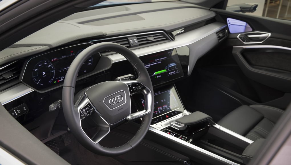 El habitáculo del Audi e-tron respira sobriedad, elegancia, pero sobre todo tecnología, heredada de sus hermanos mayores el Audi A8 y el Q8. Lo primero que salta a la vista tras abrir la puerta es el MMI Touch Response, así como el selector del cambio y las dos pantallas OLED situadas en las puertas para la vista de los retrovisores. Pocas son las diferencias que podemos encontrar en el interior del coche con respecto a los modelos de los que procede, salvo alguna grafía específica en el cuadro de mandos virtual cockpit o la pantalla del MMI desde la que se controla todo el sistema de infoentretenimiento, así como la configuración del coche.