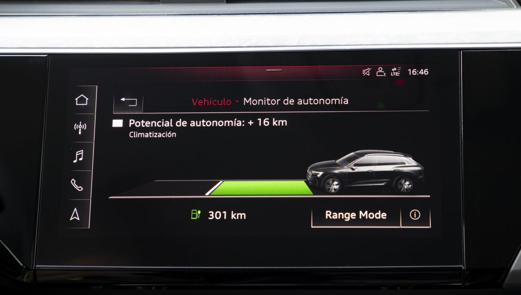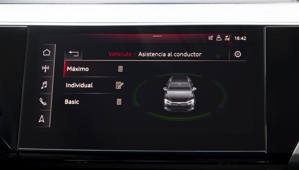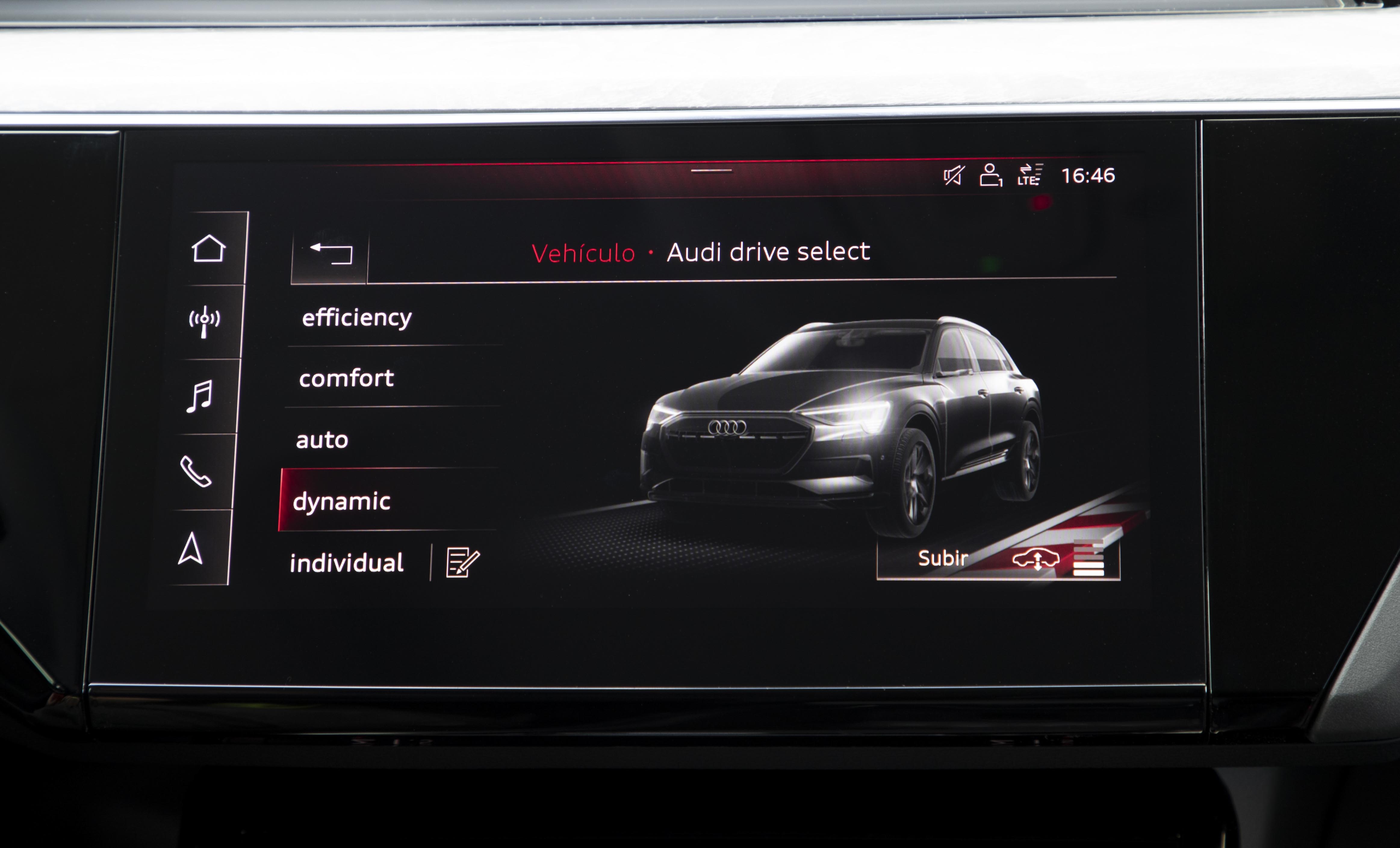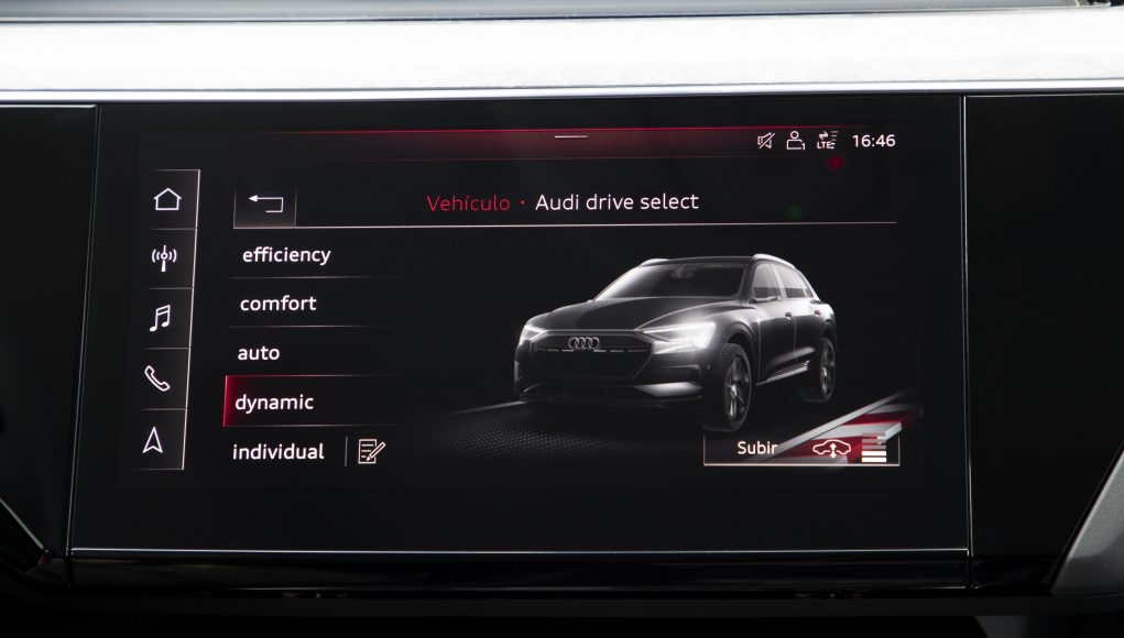 Para sacar lo mejor no solo en dinámica de conducción o eficiencia, o bien, y además para gestionar la autonomía, encontramos un selector de modos de conducción que nos permite escoger entre siete modos preseleccionados, de la misma forma que en los Audi de motor de combustión tradicional; Offroad, Allroad, Efficiency, Confort, Auto, Dynamic e Individual, presentado cada uno de ellos una gestión diferente para la conducción.