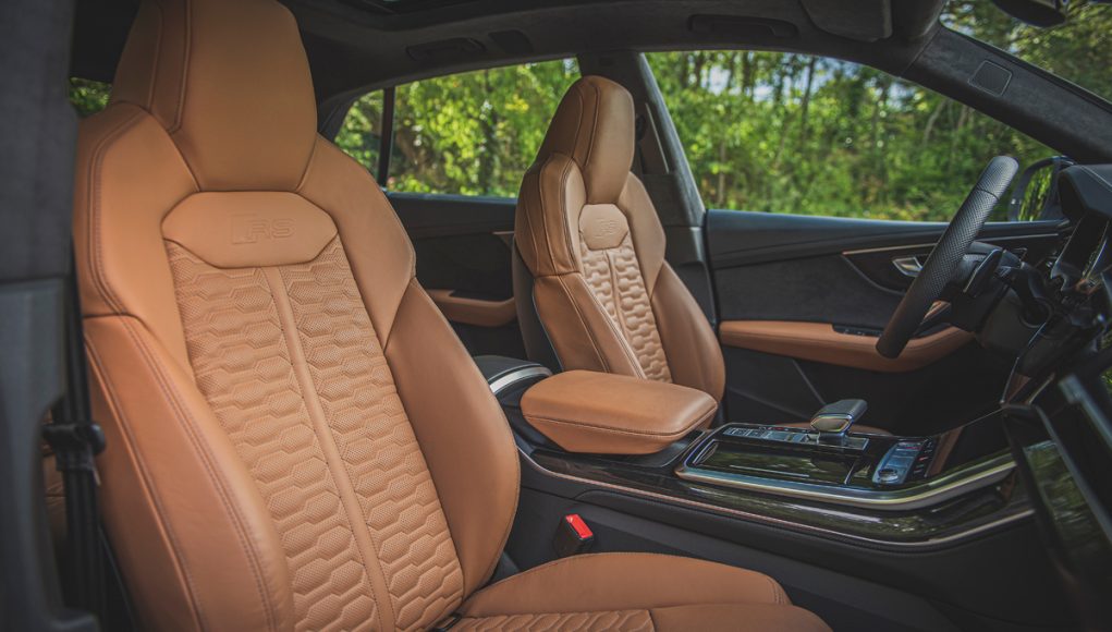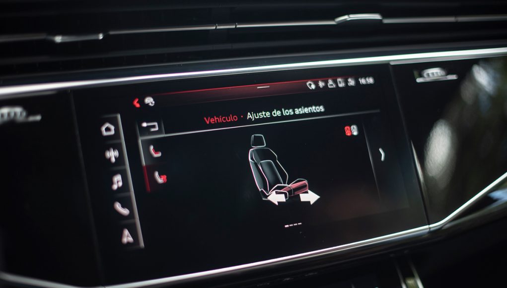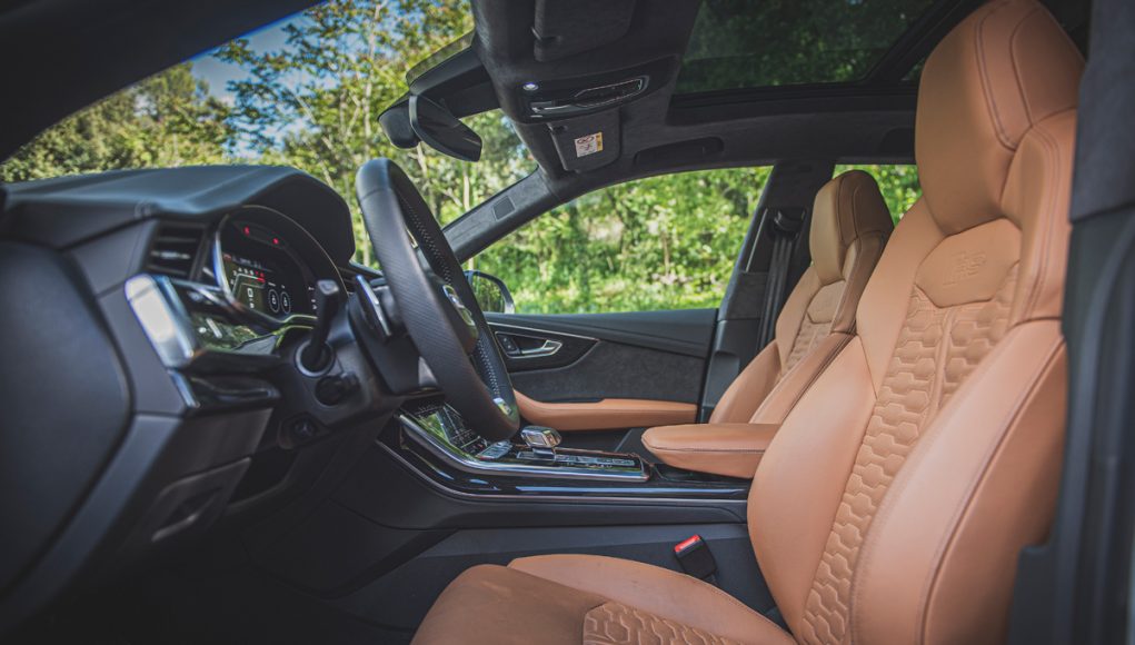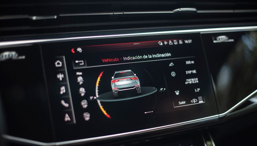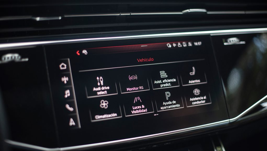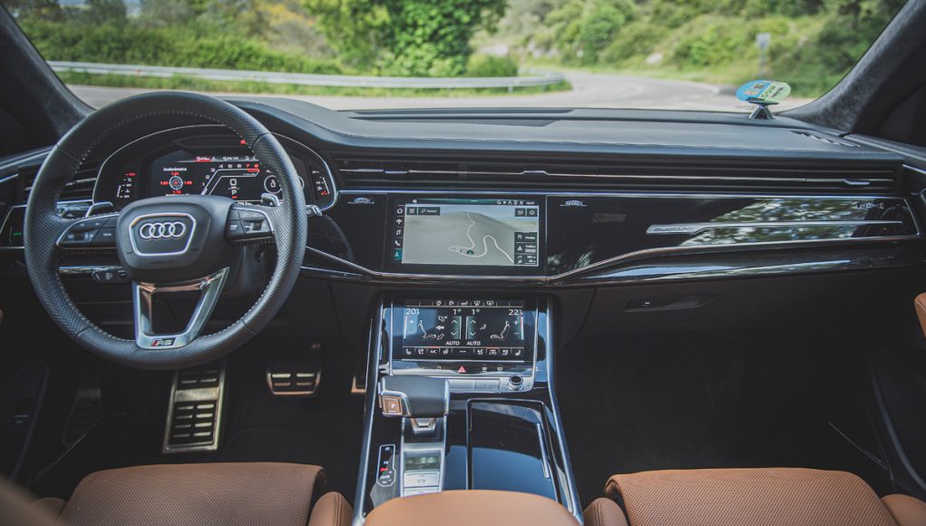Cuando abres la puerta del RS Q8, lo primero que salta a la vista son los asientos deportivos, que nuestra unidad de pruebas llevaba tapizados en cuero Valcona y en color Cognac, un perfecto contraste con el Blanco Glaciar Exterior. El resto, no difiere mucho de un Q8 convencional, algo que no nos acaba de entusiasmar, ya que teniendo en cuenta que nos encontramos ante la versión más radical de la gama, el habitáculo debería rezumar algo más de deportividad.