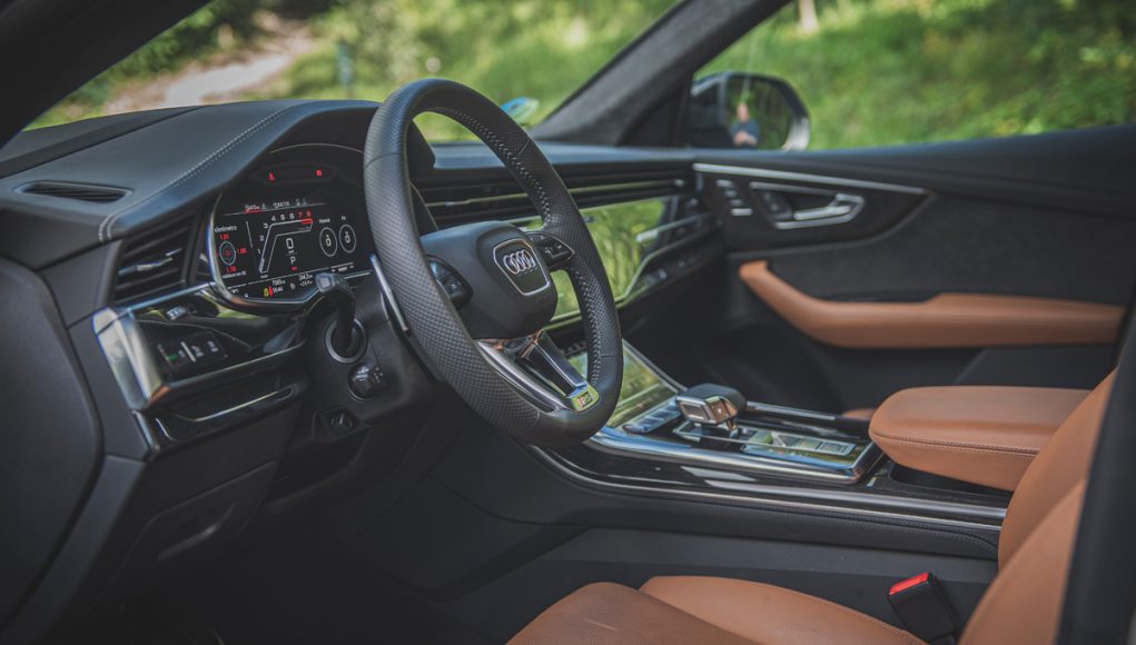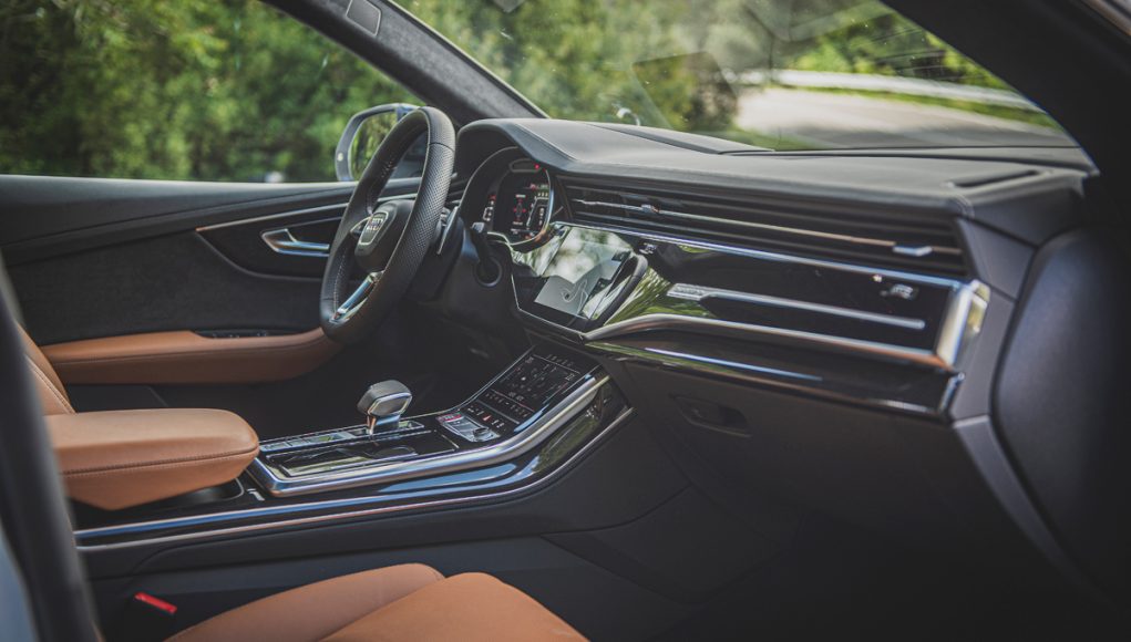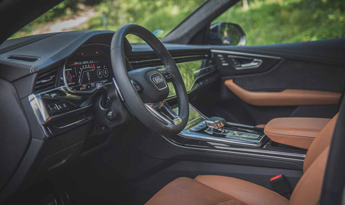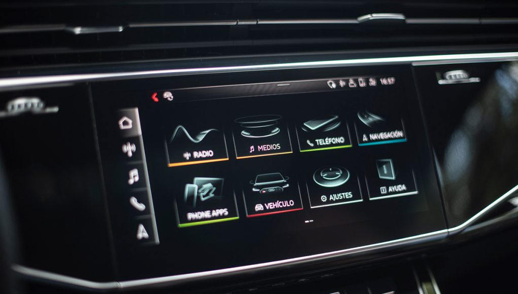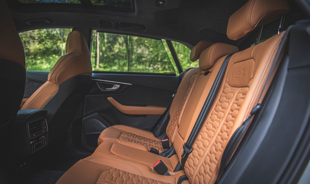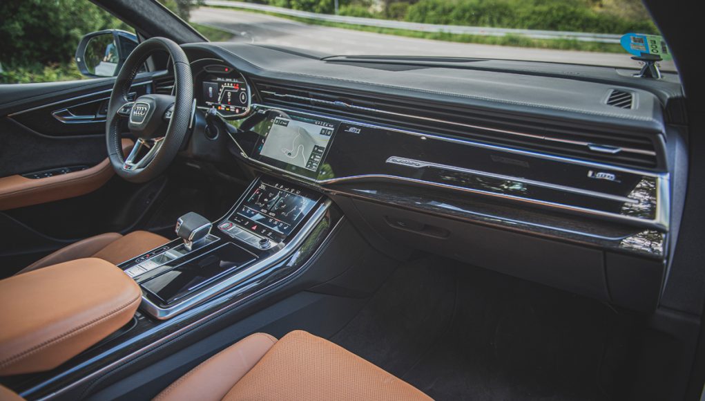 Cuando abres la puerta del RS Q8, lo primero que salta a la vista son los asientos deportivos, que nuestra unidad de pruebas llevaba tapizados en cuero Valcona y en color Cognac, un perfecto contraste con el Blanco Glaciar Exterior. El resto, no difiere mucho de un Q8 convencional, algo que no nos acaba de entusiasmar, ya que teniendo en cuenta que nos encontramos ante la versión más radical de la gama, el habitáculo debería rezumar algo más de deportividad.