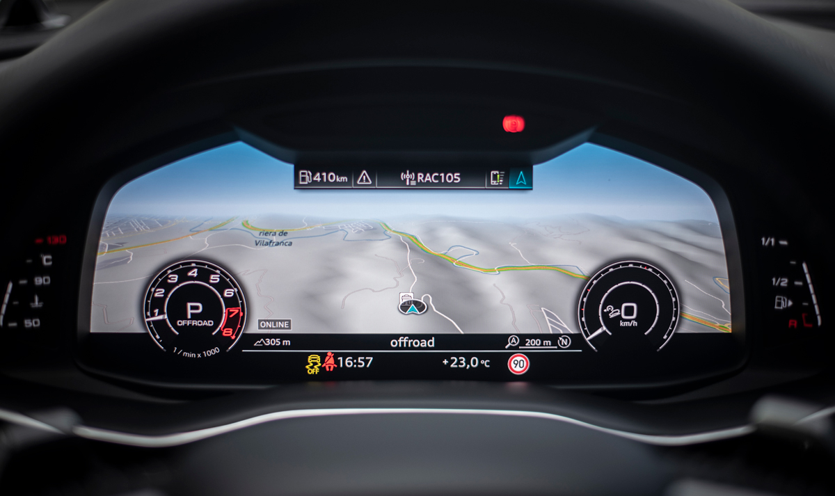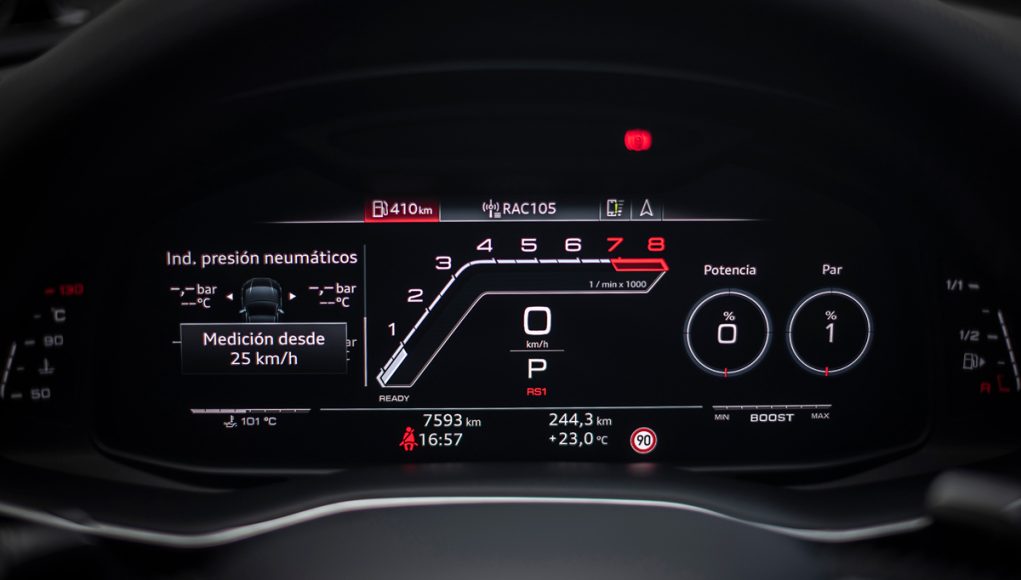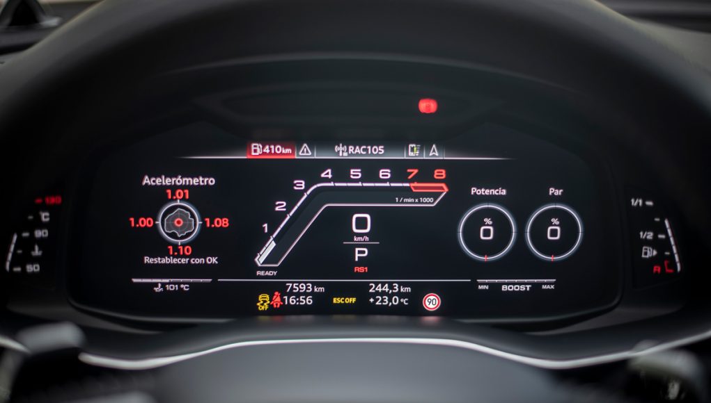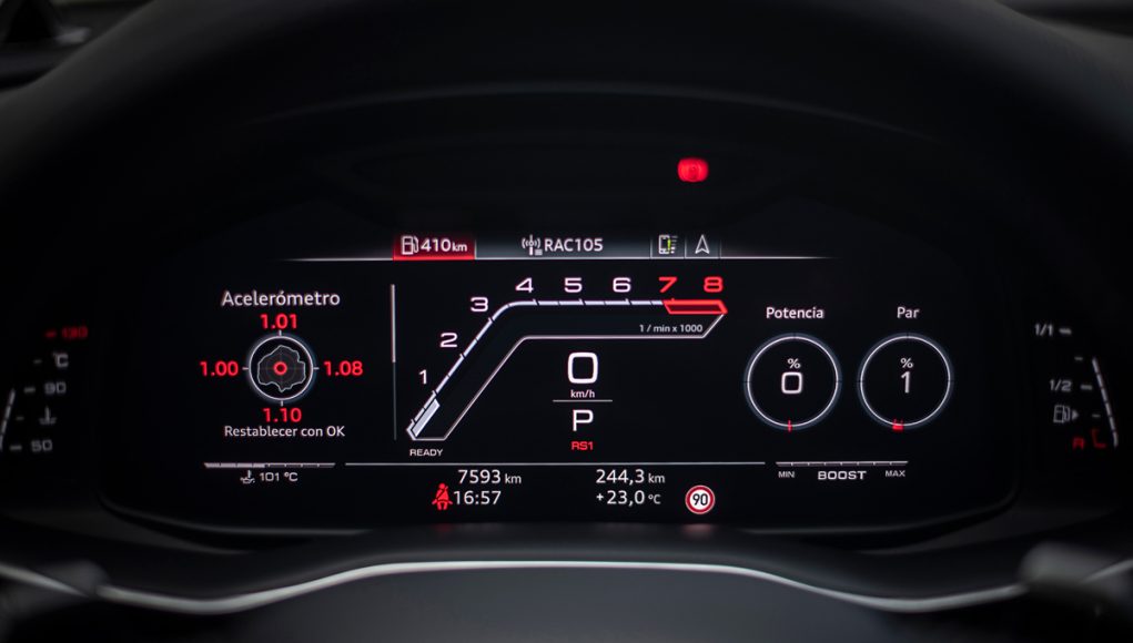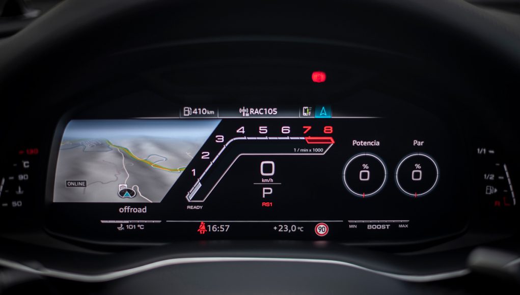 Dejando de lado esta apreciación, personal, el ambiente es realmente premium, así como la calidad y percepción de los materiales usados por la marca. Tras el volante encontramos el Audi Virtual Cockpit, personalizable en lo que a vista e información se refiere por el conductor. En la consola central, encontramos la pantalla de 10,1” táctil desde la que se controla todo el Infotaiment y el MMI Navigation Plus, así como es posible personalizar diversos parámetros que afectan a la conducción, como por ejemplo los modos de conducción RS1 y RS2 que permiten personalizar de forma individual la Propulsión, el Tren de Rodaje o la Dirección.