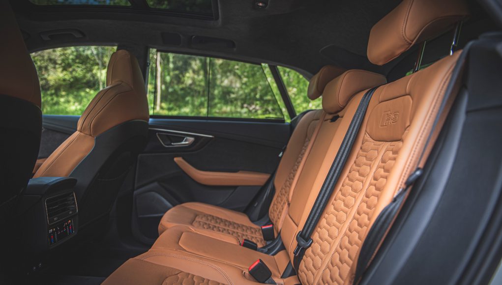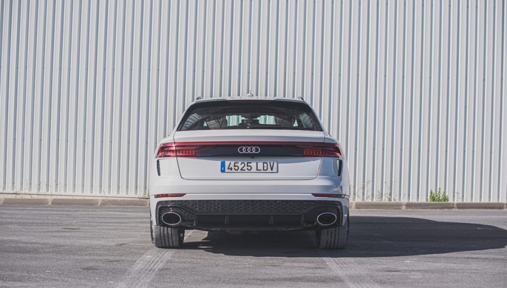 En la parte trasera encontramos espacio para tres plazas, que podrán disfrutar de espacio extra para las piernas, gracias a los más de 3 metros de batalla que ofrece este RS Q8. El maletero por su parte dispone del maletero, que dispone de 605 litros de capacidad, ampliables hasta unos muy generosos 1.755 litros.