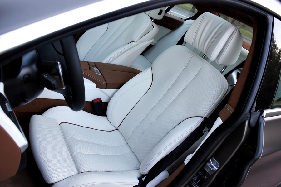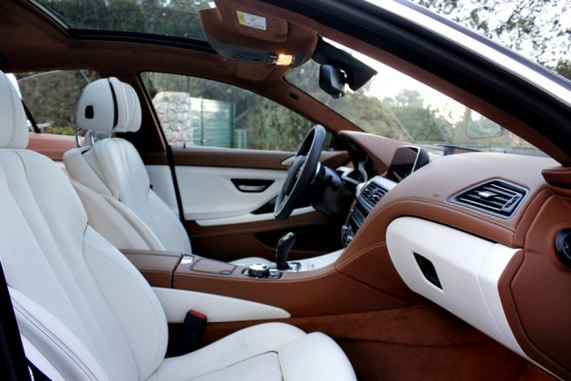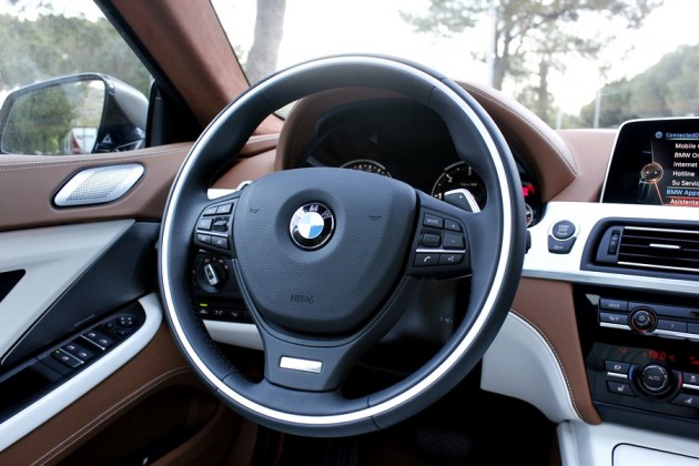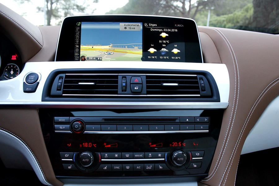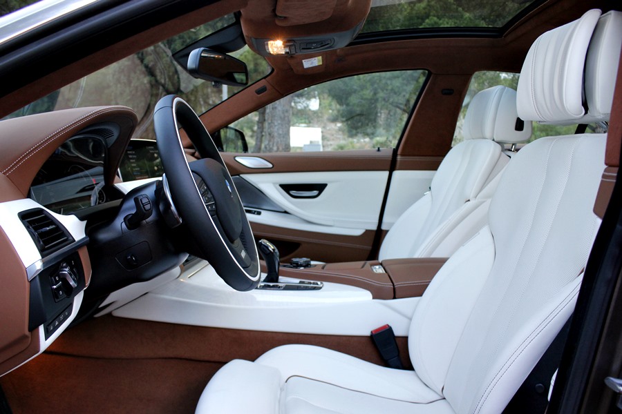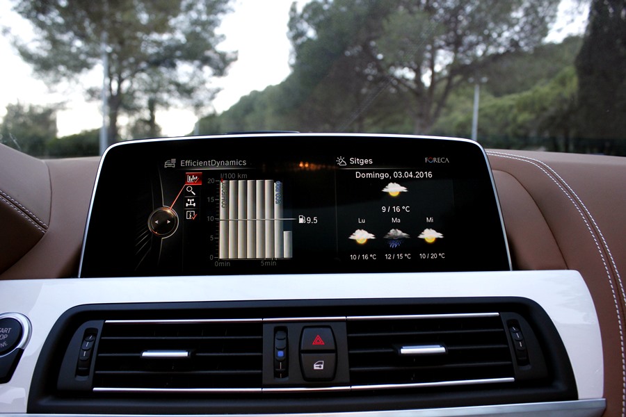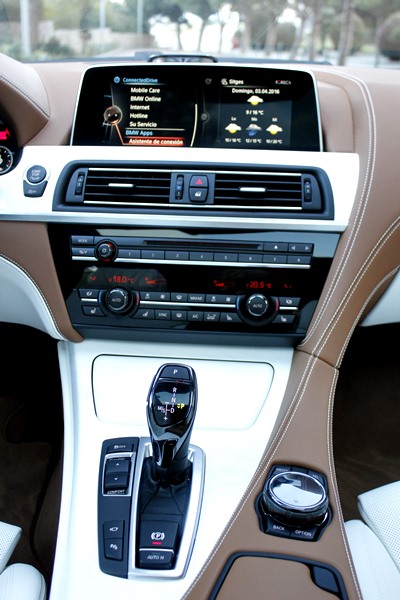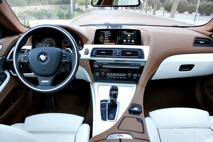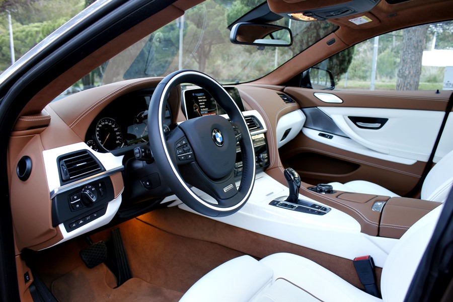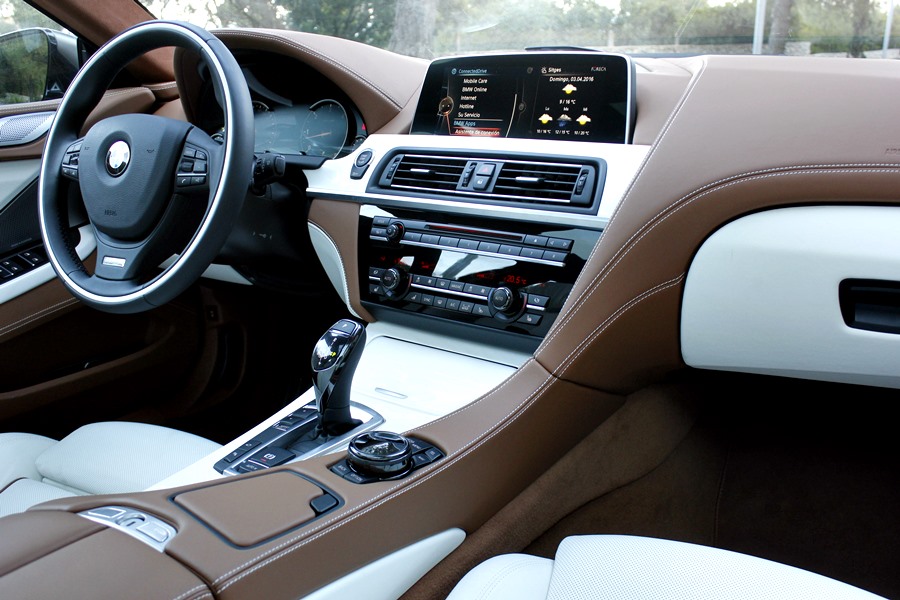 Tras abrir la puerta, lo primero que llama la atención del 640d son los tonos bicolor de la piel de la línea Individual de BMW división que trabaja pajo el paraguas de BMW M Gmbh, y que se dedica a confeccionar estos exclusivos coches bajo esta denominación, utilizando para ello, materiales como la madera de fresno blanco que guarnece el salpicadero o las mejores pieles para recubrir los asientos o la alcántara que podemos encontrar en todo el revestimiento del techo del habitáculo.