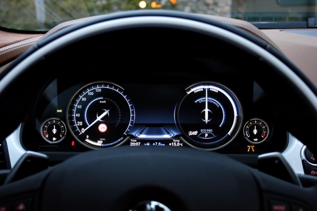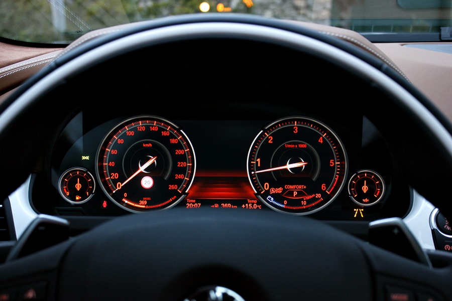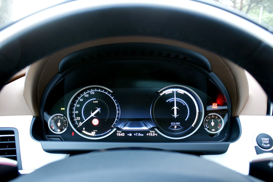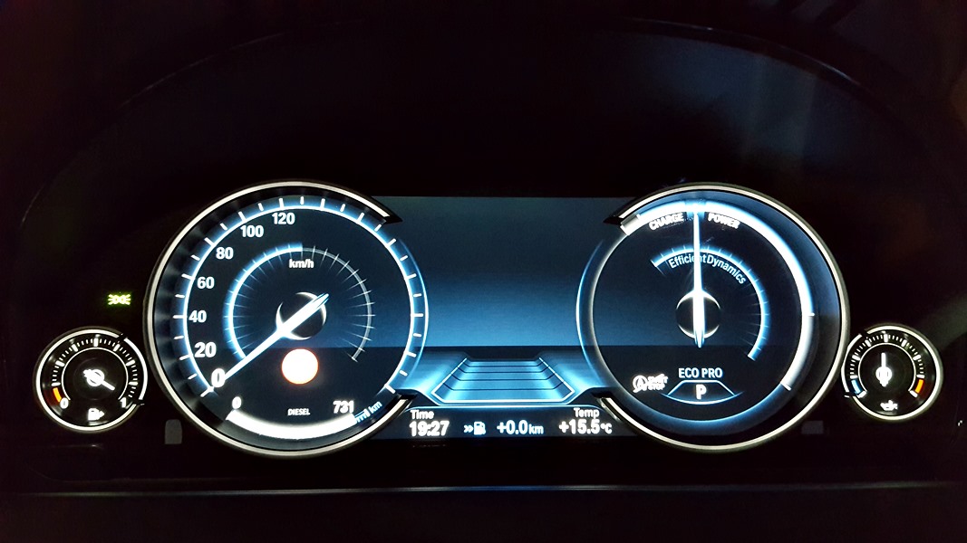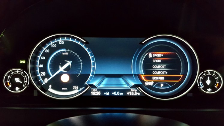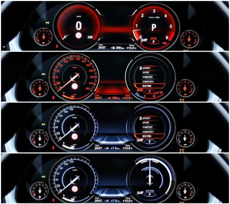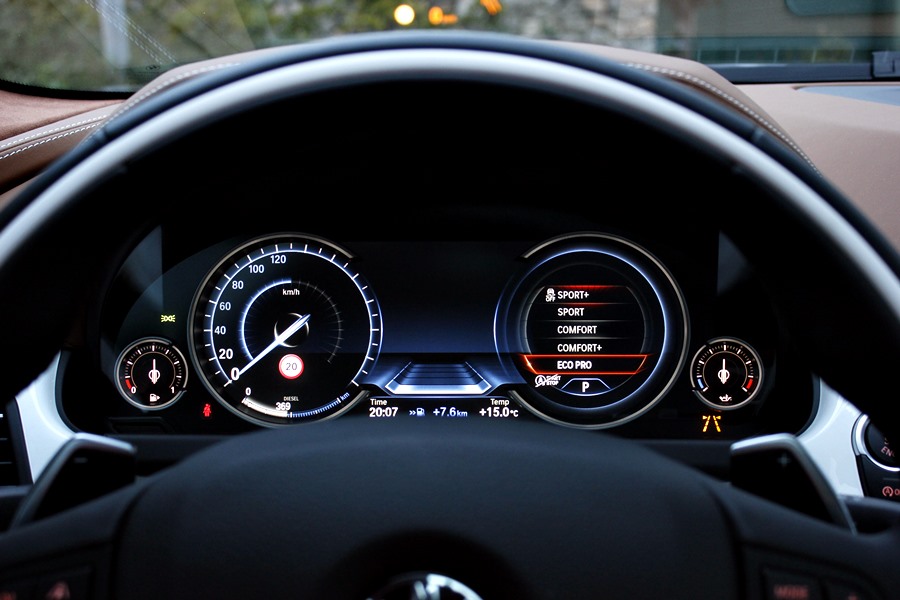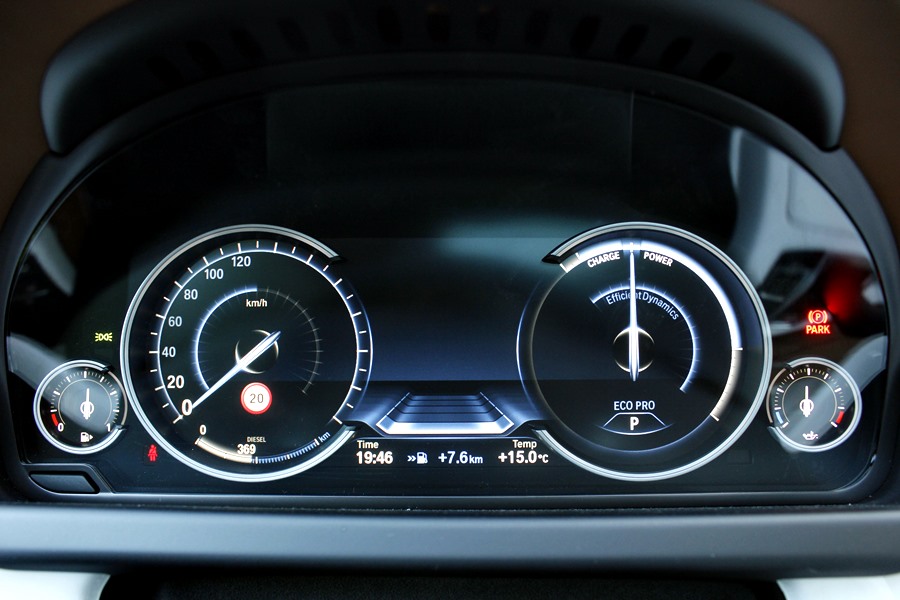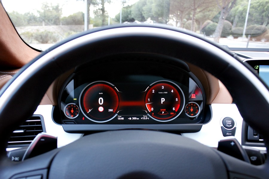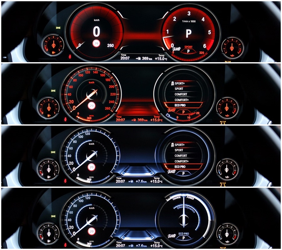 Para poder optimizar la conducción, encontramos el sistema Driving Experience Control que dispone de 5 modos de conducción predeterminados y que son claramente representados en el cuadro de mandos dotado de tecnología Black Panel, ya que al escoger cada uno de ellos cambian las gráficas y la información que se ofrece. En el caso del modo Eco Pro, la gráfica es de color azul, y en ella vemos representados el velocímetro y un indicador del sistema Efficient Dynamics. Con el modo Confort + y Confort, obtenemos dos esferas tradicionales mediadas por el ordenador de a bordo y en un color anaranjado, y con los modos Spot y Sport +, obtenemos una gráfica de un velocímetro donde se representa la velocidad en un gran display y a la derecha un cuentarrevoluciones con un indicador de la potencia que estamos utilizando en cada momento.