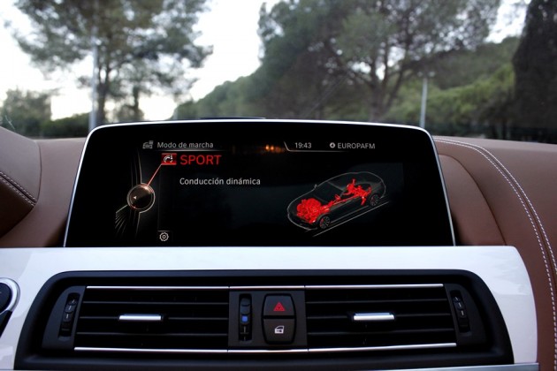 Los modos Eco Pro, Confort y Confort +, están pensados para obtener un alto grado de confort a la hora de conducir, aunque cuando cambiamos a los modos Sport y Spot +, el coche se vuelve más rígido, la dirección se endurece, la sensibilidad del acelerador es notable, se alargan las revoluciones en los cambios, y ya estamos preparados para someter el 640d a una conducción más deportiva, sin perder ese toque de berlina que ofrece un alto grado de confort durante la marcha, para ello se ha combinado el uso del control electrónico de la suspensión EDC, con el Driving Experience Control.