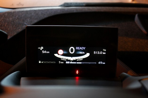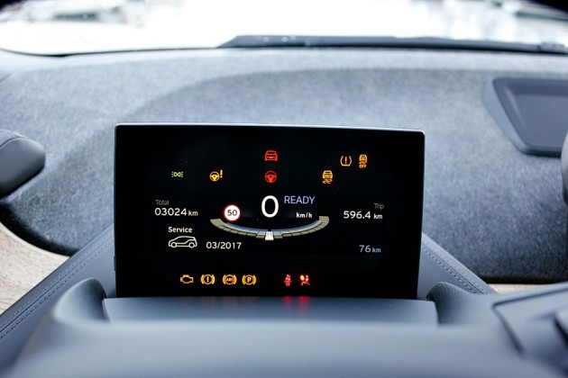 El salpicadero es sencillo, y en él, encontramos dos pantallas de alta definición encargadas de ofrecernos toda la información necesaria. Una tras el volante, en la que podemos ver la velocidad, el nivel de carga de la batería, la autonomía y el rendimiento energético del coche así como el nivel del depósito de gasolina y la autonomía que nos queda con el modo REX.