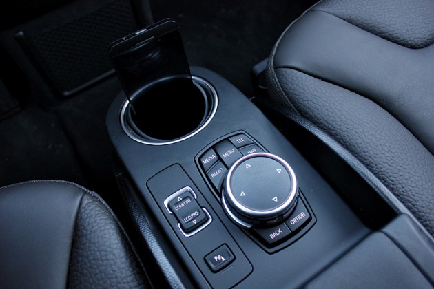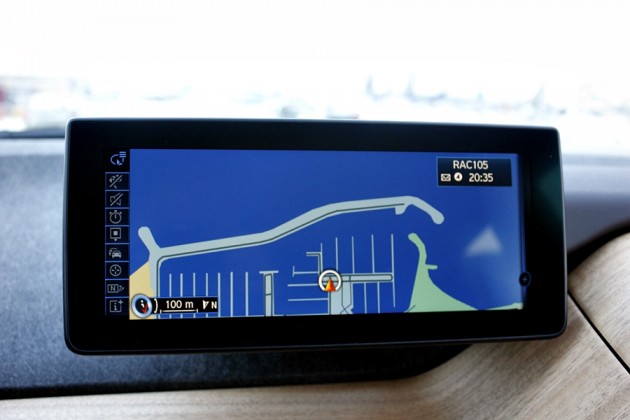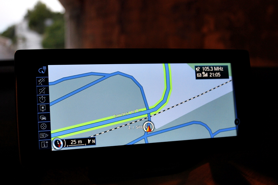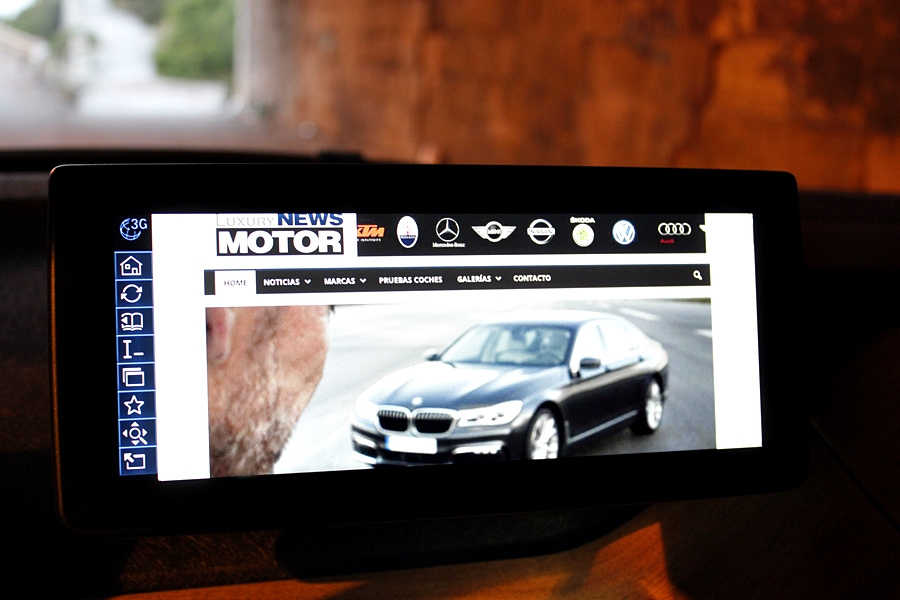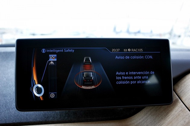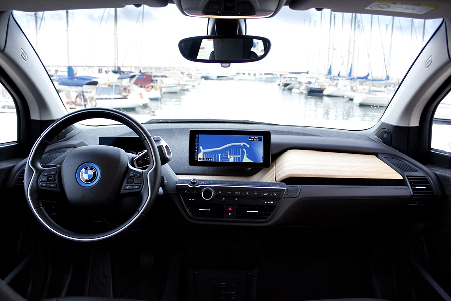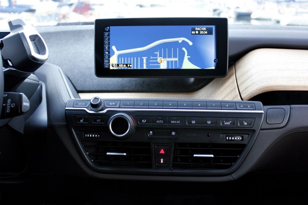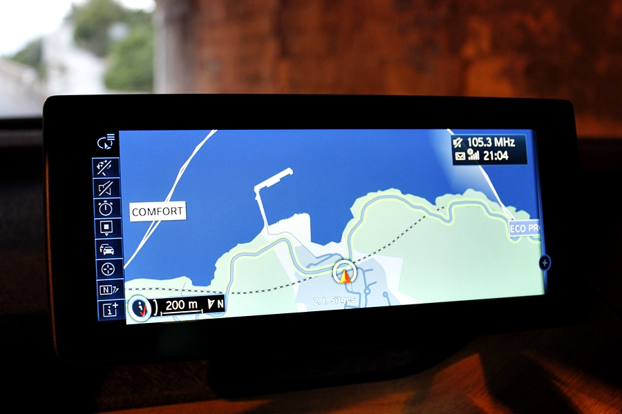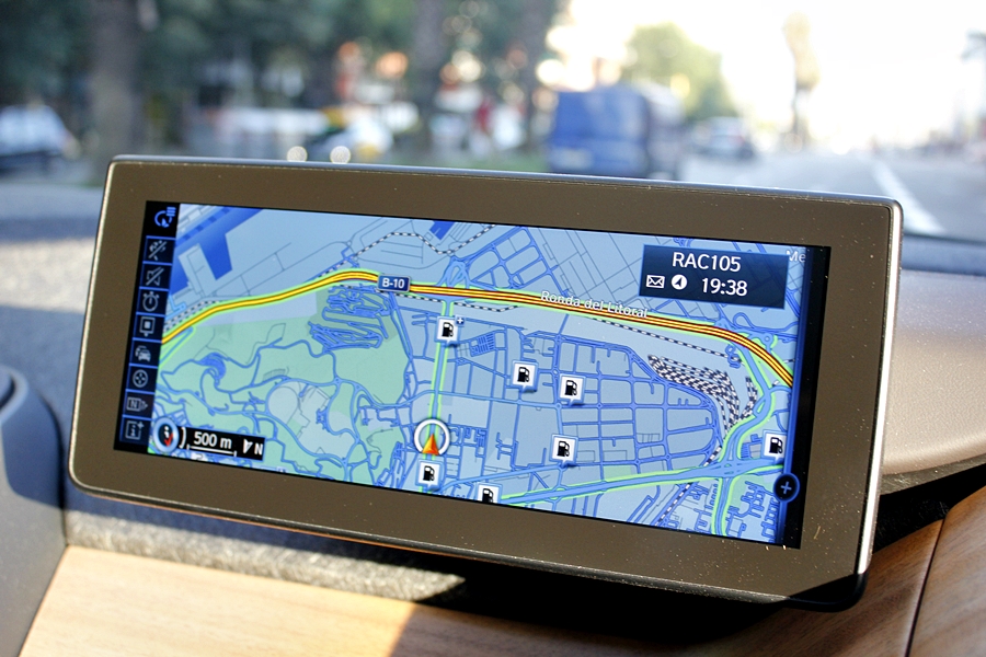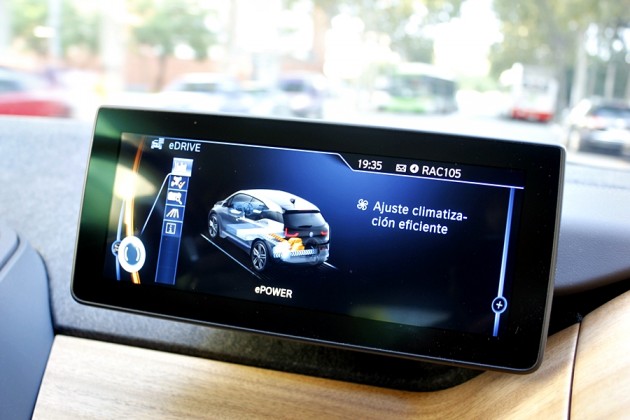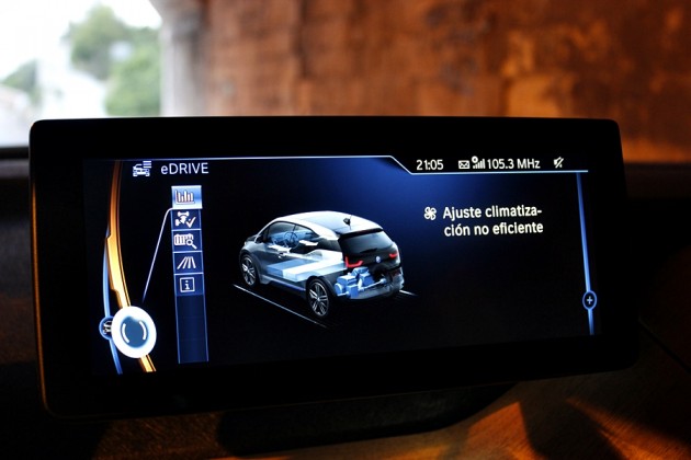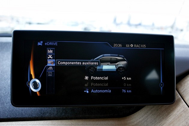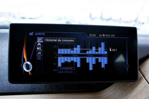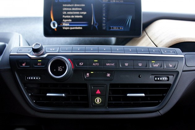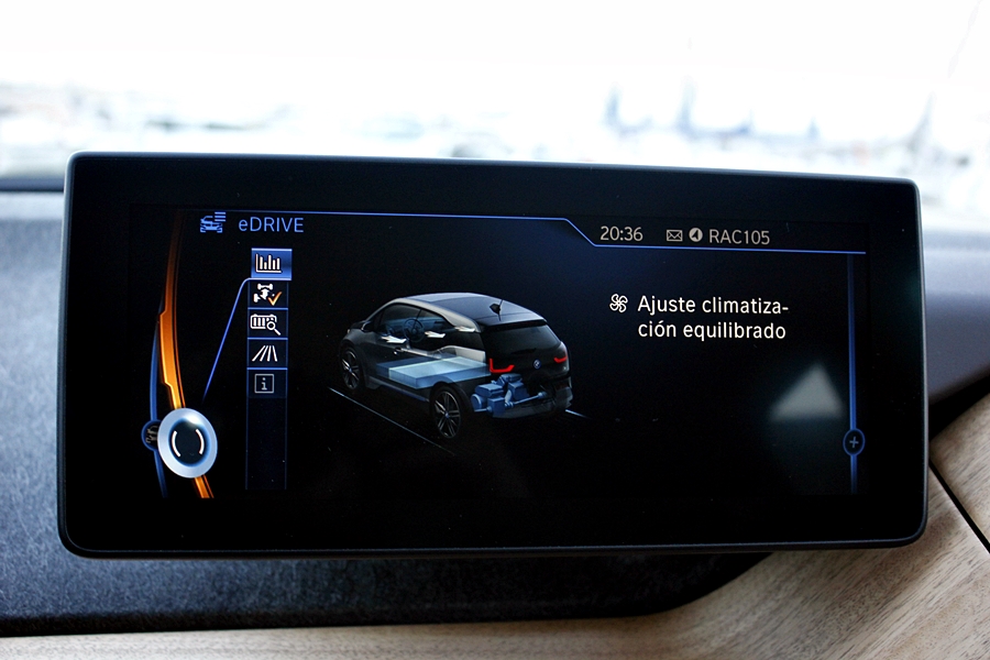 La otra pantalla, como si de una Tablet se tratara por sus medidas, preside la consola central. A través de ella, podemos controlar el ordenador de a bordo, el navegador, cuya cartografía permite ver las rutas Ecopro para optimizar el consumo eléctrico del coche, así como los parámetros de configuración y el modo de conducción, del que podemos optar por tres modos de funcionamiento que más tarde pasaremos a detallar. En la parte más baja de esta consola, encontramos parte del equipo de audio, así como el climatizador heredado de otros modelos de BMW, al menos en cuanto a lo que diseño se refiere.