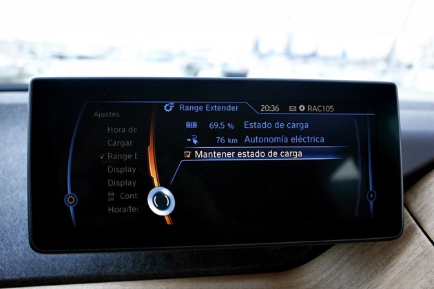 Este, acciona un generador que mantiene la carga de la batería para que el motor eléctrico pueda funcionar, y es sumamente silencioso, tanto, que en el interior del i3 el ruido es imperceptible incluso estando parado. Su puesto en funcionamiento se efectúa en dos casos; el primero, sería al llegar a consumir casi por completo la batería del coche, y en el momento en el que nos quedan exactamente 4 kilómetros de autonomía entra en funcionamiento, reduciendo eso sí, las prestaciones del motor eléctrico que nos limitarán la velocidad hasta 100 km/h. El segundo, es programando mediante una tecla, por ejemplo, una de las que utilizamos para las emisoras de la radio, como era el caso de esta unidad de pruebas. Para accionarlo, se puede establecer un porcentaje a partir del 75% de la carga de la batería y de ahí hasta el 25%, para que con tan solo pulsar un botón y bajo el parámetro “Mantener el estado de carga” el motor de combustión empiece a funcionar. Es en este modo de funcionamiento como podemos conseguir la autonomía de los 300 km que la marca ha homologado.