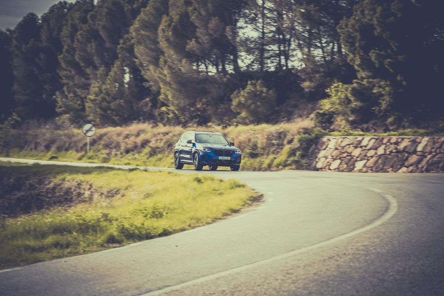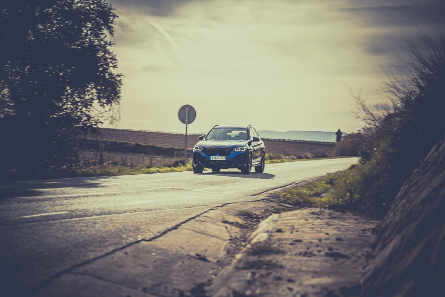 Para que un SUV sea un verdadero deportivo y ofrezca un comportamiento como tal, no solo es cuestión de dotarlo de un motor potente, sino que se precisan otros elementos para garantizar que la dinámica de conducción acompañe. En este caso, encontramos un cambio deportivo Steptronic de 8 relaciones que a través del sistema Drivelogic permite modificar la velocidad de los cambios, así como un el sistema de tracción integral xDrive que han sido optimizados para garantizar en todo momento que ambos elementos, unidos a una puesta a punto específica del chasis sean capaces de soportar no solo las aceleraciones sino también la entrega de la potencia al asfalto, es por ello que el sistema de tracción prima un mayor reparto de par al tren trasero para que el comportamiento de este X3 sea prácticamente igual al de un tracción trasera, lo que en conducción deportiva se traduce en que con el modo Sport + seleccionado, el control de tracción que se vuelve más permisivo, permite dibujar unas pequeñas trazadas antes de entrar en las curvas para colocar el coche y ya puestos, si insistes un poco con el acelerador, a la salida de estas.