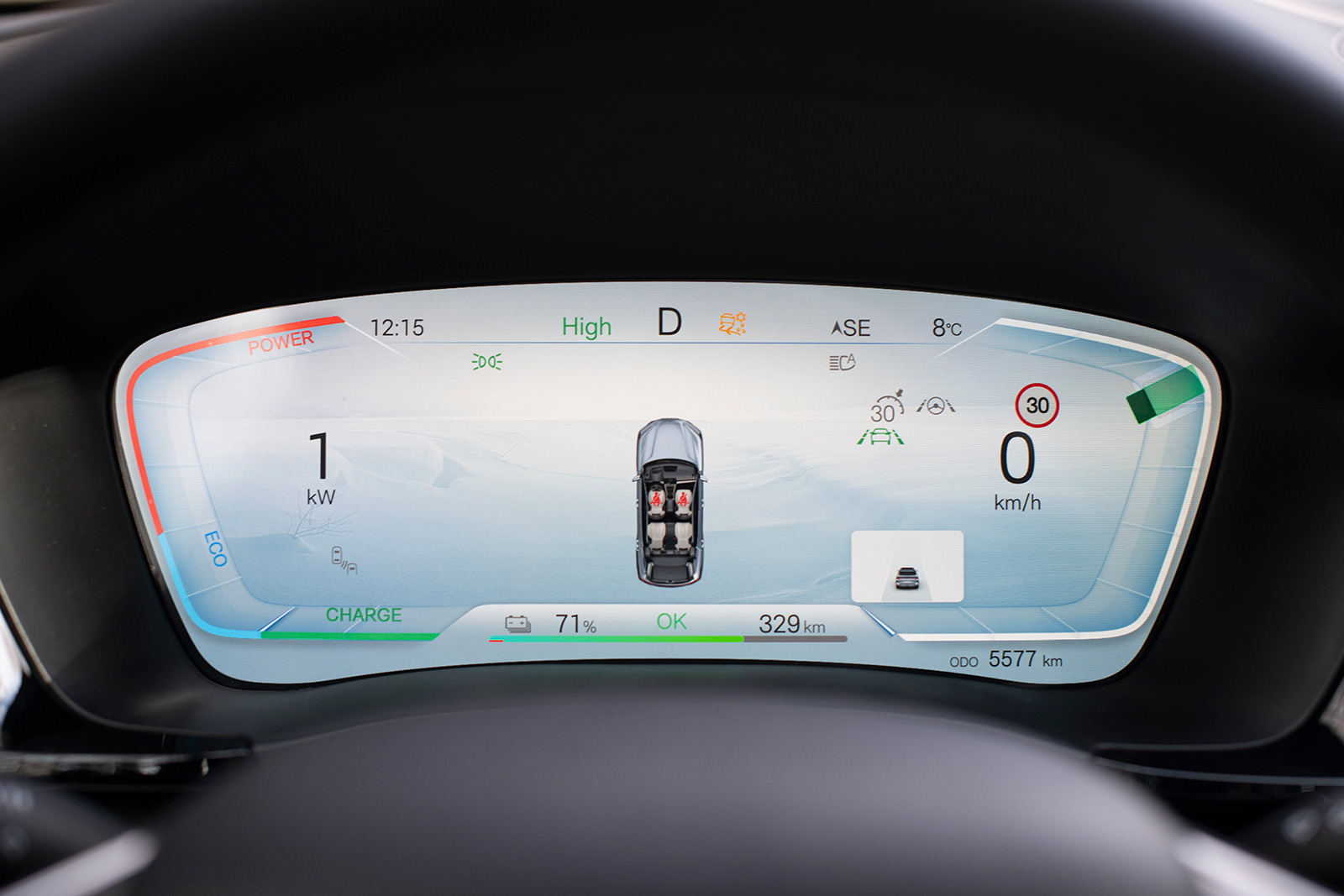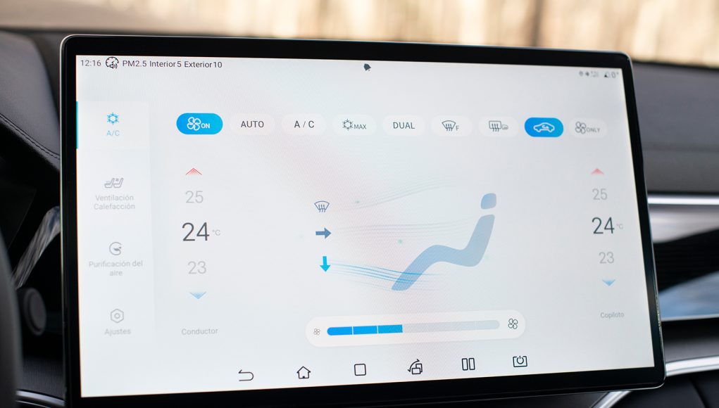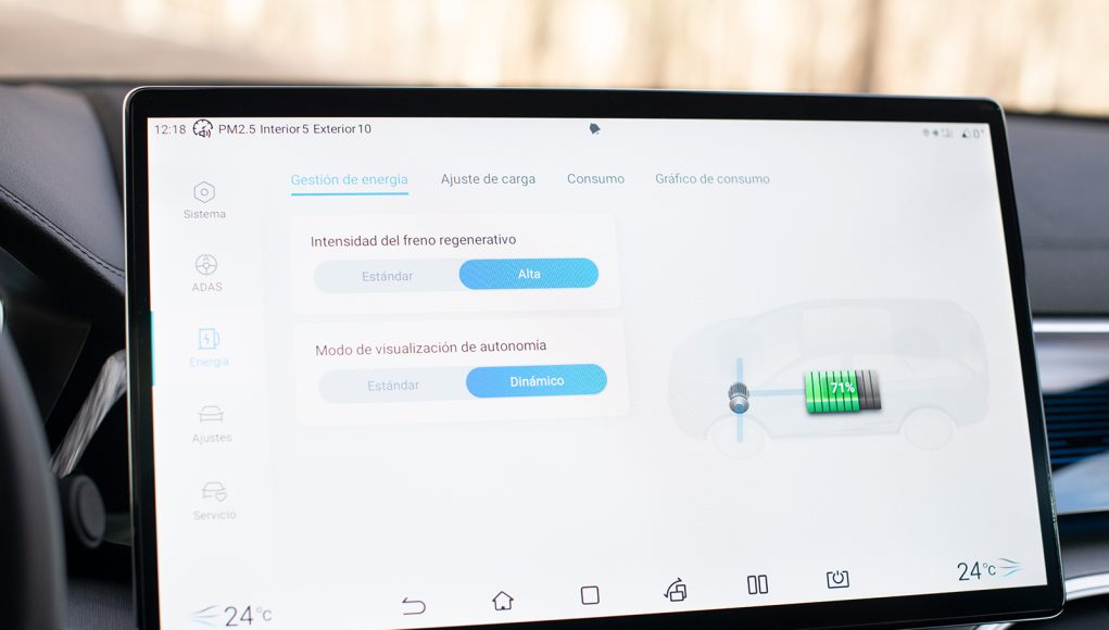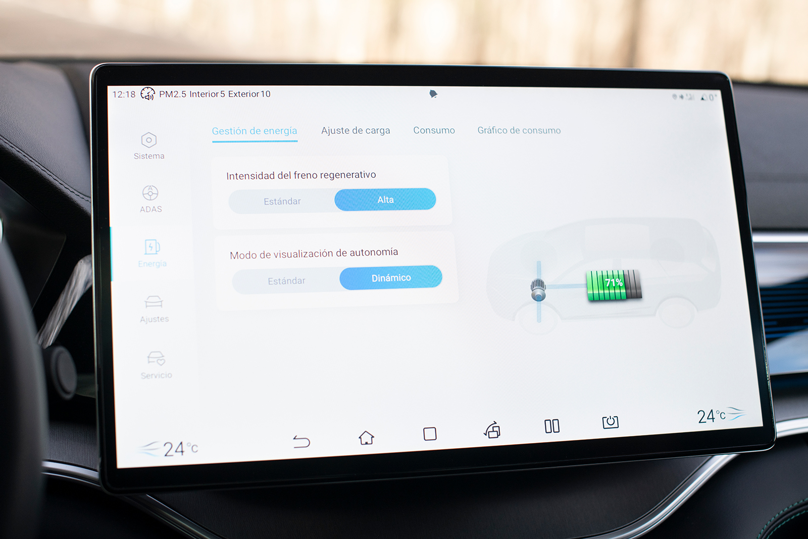 Tras el volante encontramos un cuadro de instrumentos digital de 12,3″ que ofrece niveles de personalización por software OTA y visualiza parámetros en tiempo real –consumo instantáneo, distribución de par y estado térmico– con claridad, aunque la estética de sus gráficos se percibe muy conservadora, lejos de las grafías de sus más directos competidores.