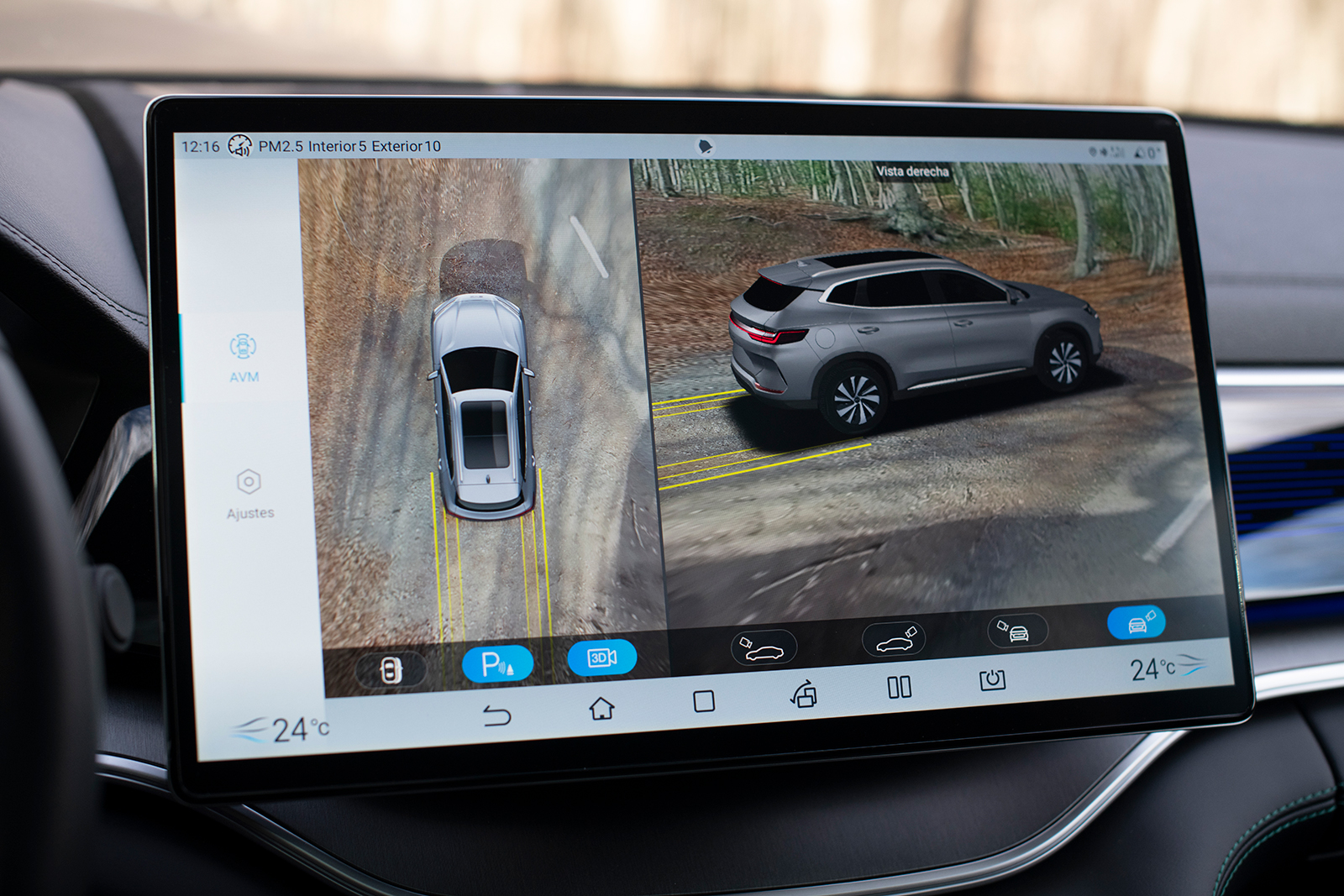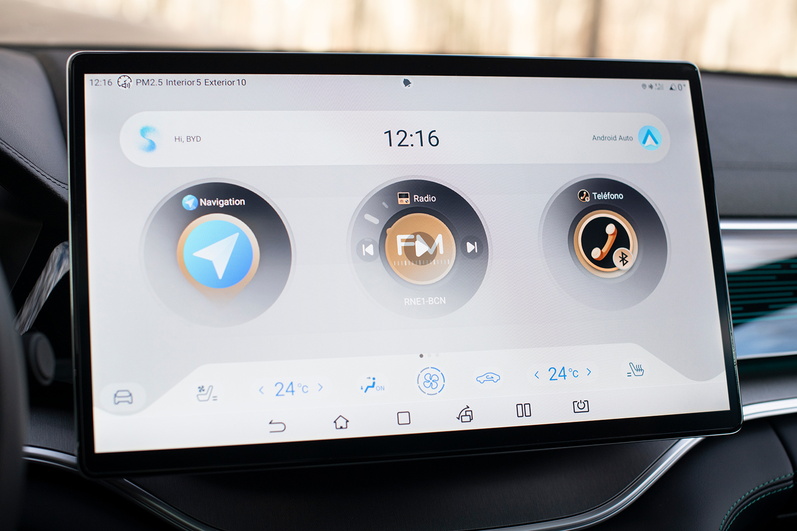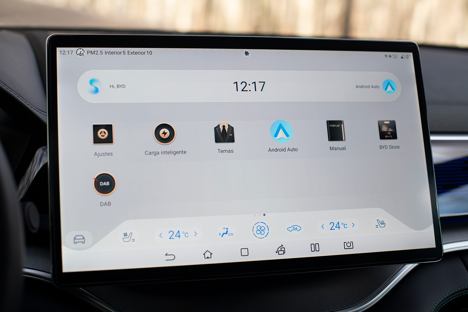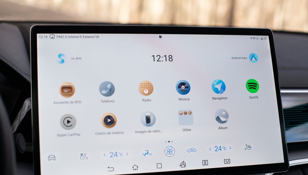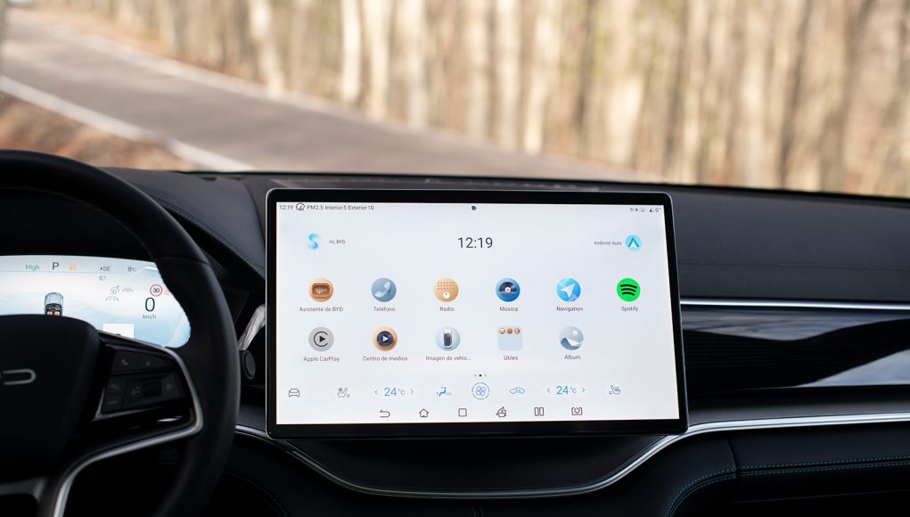 En el habitáculo, como en todos los BYD destaca por encima de todo la pantalla multifunción central de 15,6″ con soporte motorizado que permite moverla de posición horizontal a vertical y que dispone de una interfaz es ágil, compatible con protocolos MirrorLink, Apple CarPlay y Android Auto. Quizás no es la pantalla más intuitiva del mundo, porque dispone de muchos menús secundarios, está muy bien resuelta a nivel de funcionalidad. Una de las cosas que queremos destacar con respecto a otras unidades de BYD que hemos probado es que el sistema de radio funciona si interrupciones en las zonas de difícil cobertura, asociado además a un sistema de audio firmado por Infinity lo que garantiza una experiencia auditiva en el interior del coche de alto nivel.