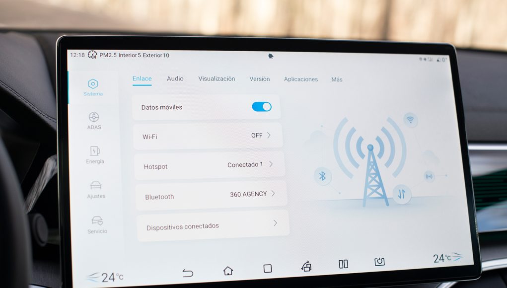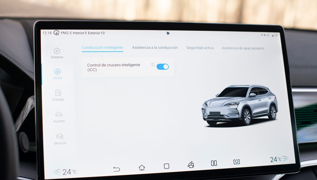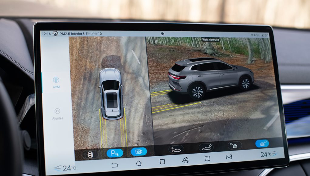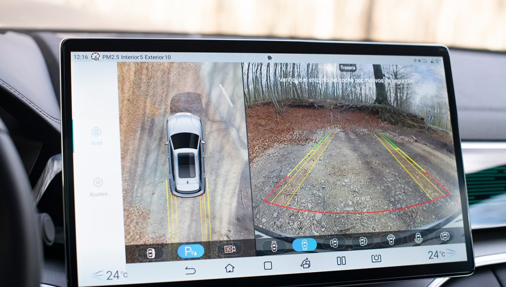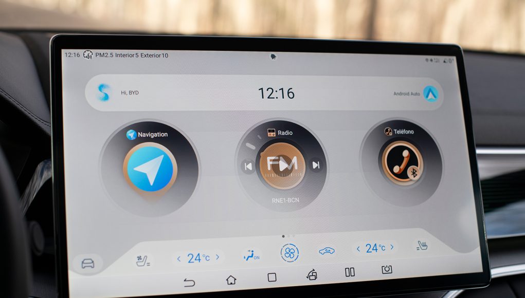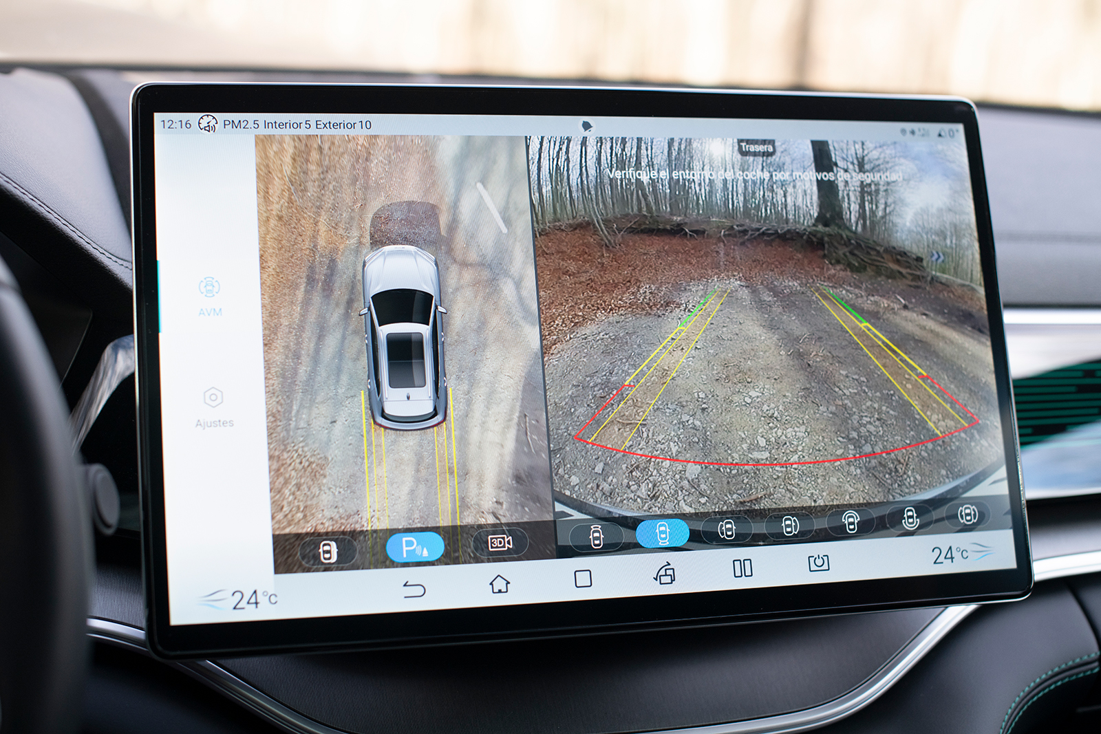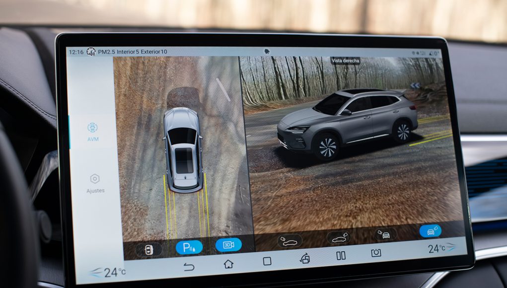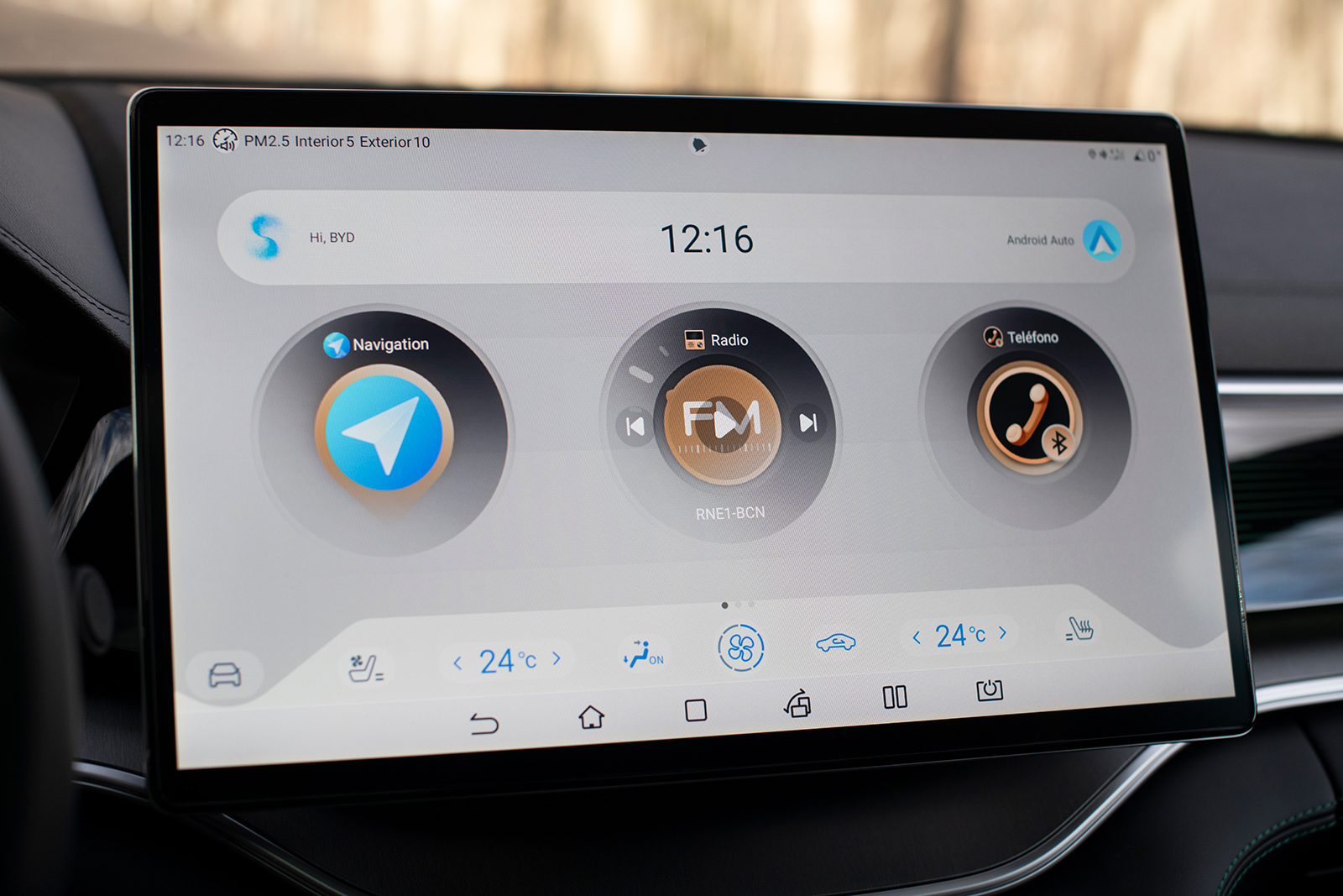 En el habitáculo, como en todos los BYD destaca por encima de todo la pantalla multifunción central de 15,6″ con soporte motorizado que permite moverla de posición horizontal a vertical y que dispone de una interfaz es ágil, compatible con protocolos MirrorLink, Apple CarPlay y Android Auto. Quizás no es la pantalla más intuitiva del mundo, porque dispone de muchos menús secundarios, está muy bien resuelta a nivel de funcionalidad. Una de las cosas que queremos destacar con respecto a otras unidades de BYD que hemos probado es que el sistema de radio funciona si interrupciones en las zonas de difícil cobertura, asociado además a un sistema de audio firmado por Infinity lo que garantiza una experiencia auditiva en el interior del coche de alto nivel.