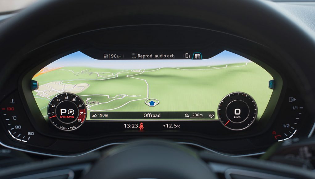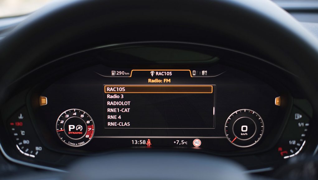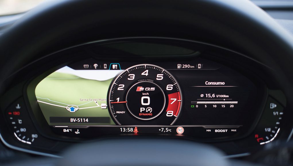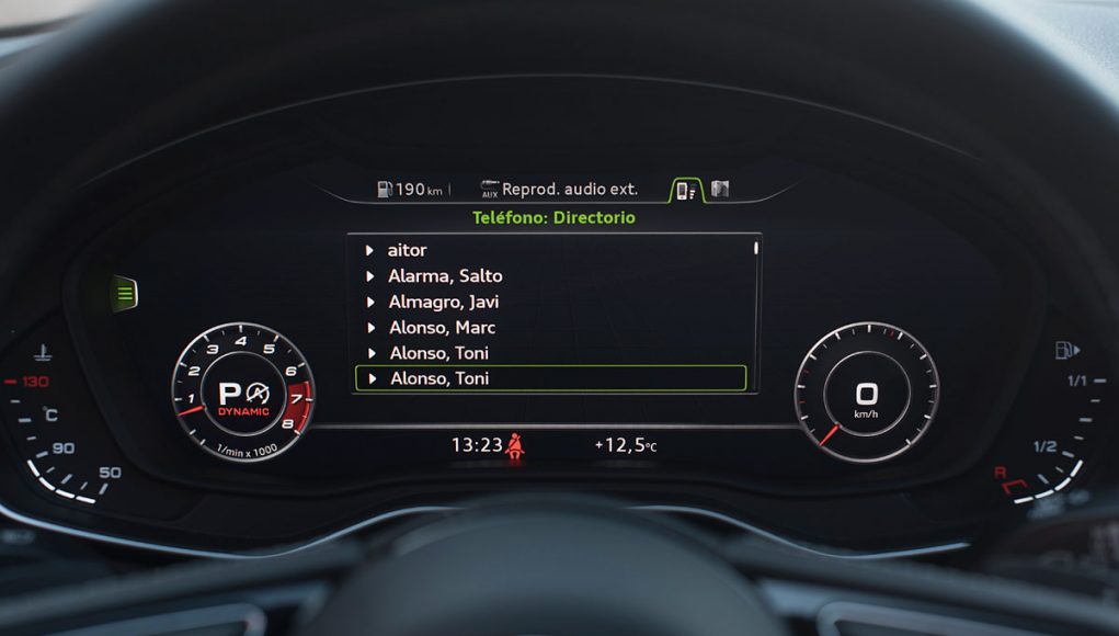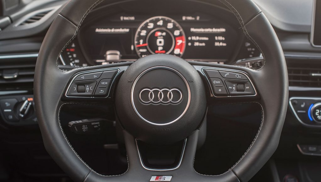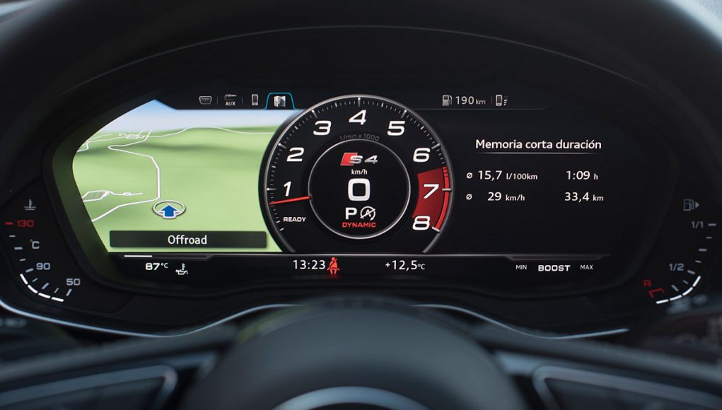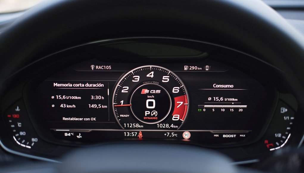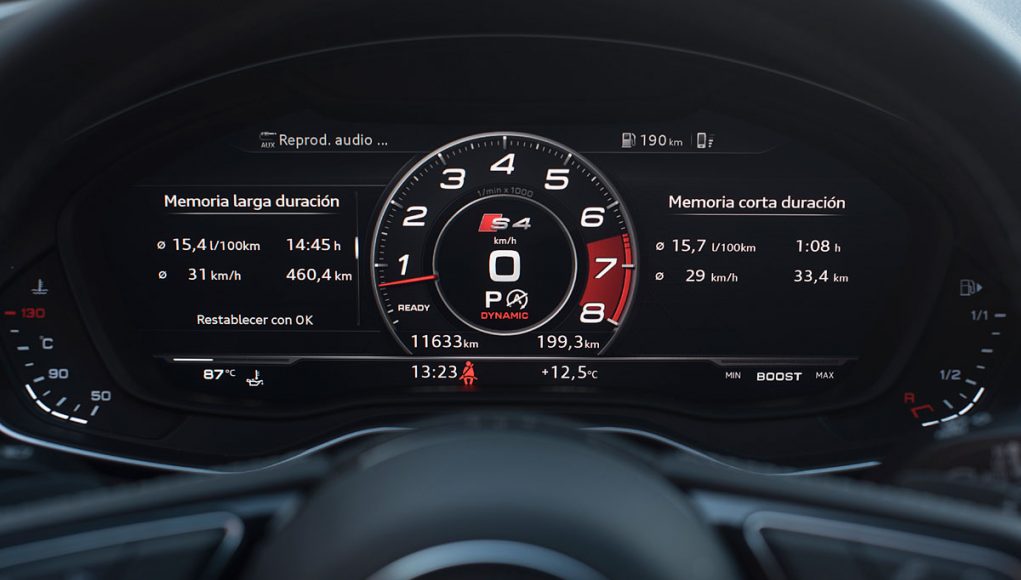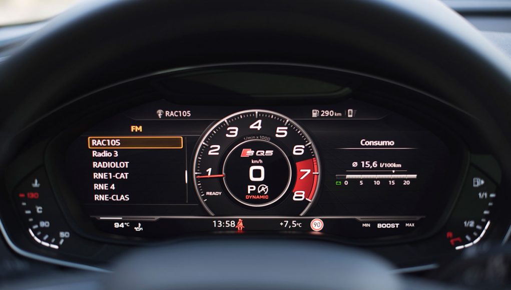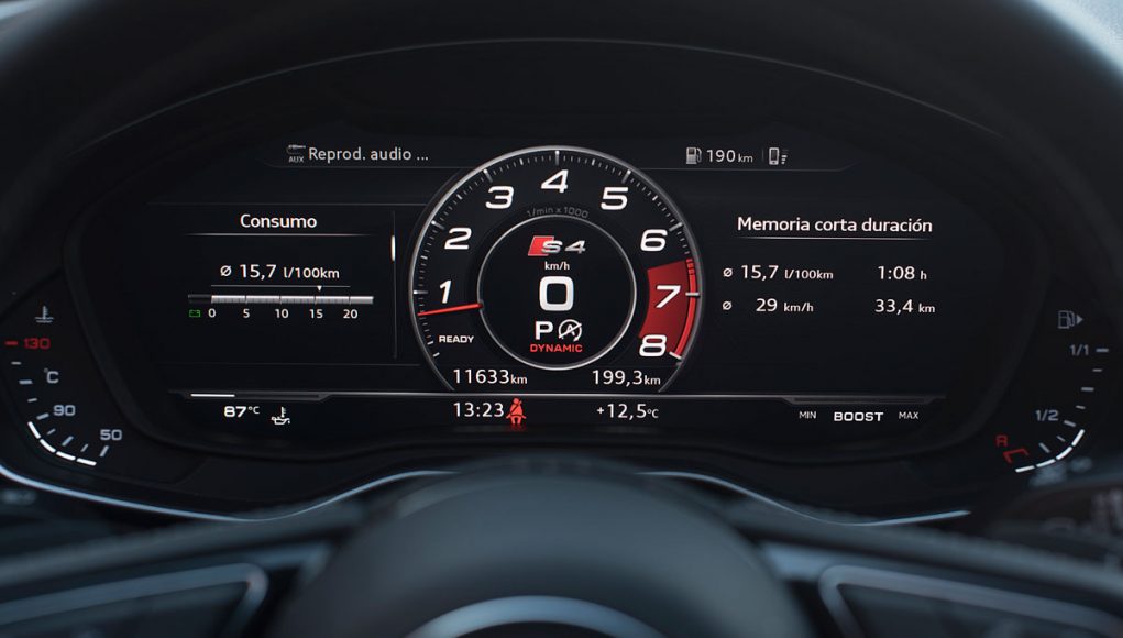 Ambos volantes deportivos de tres radios son multifunción y disponen de las levas para el manejo del cambio de forma secuencial. Tras estos encontramos el Audi Virtual Cockpit, que permite configurar la pantalla a gusto del conductor y dispone de unas grafías específicas en los modelos S o RS como es este caso, además de posicionar el cuenta revoluciones en el centro de la pantalla a modo de primar su atención como rasgo más característico dentro de los modelos más deportivos de Audi.