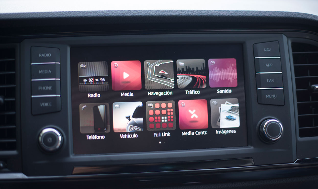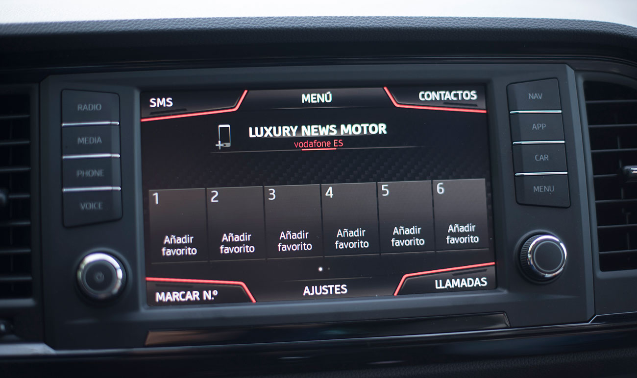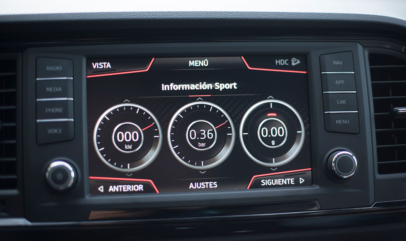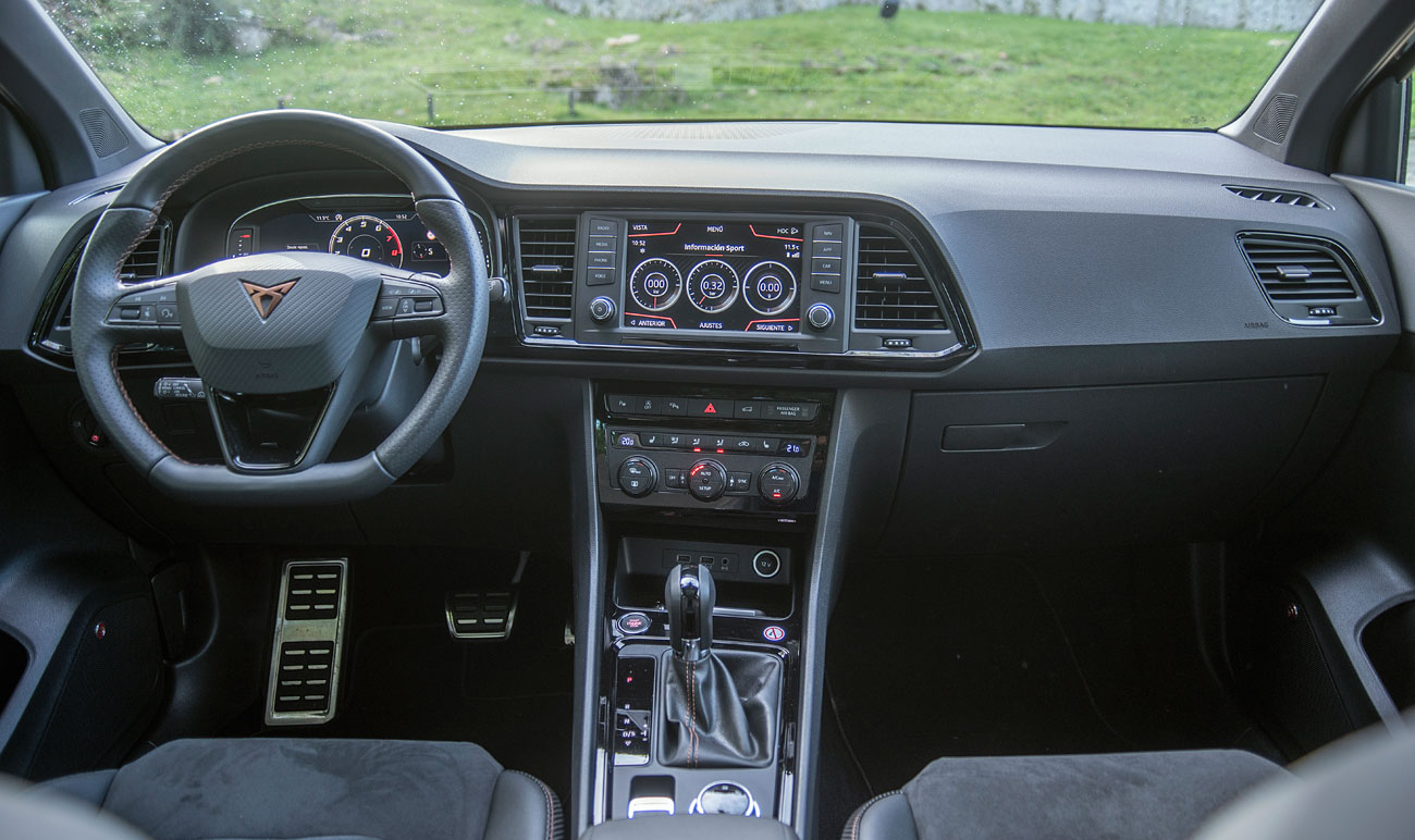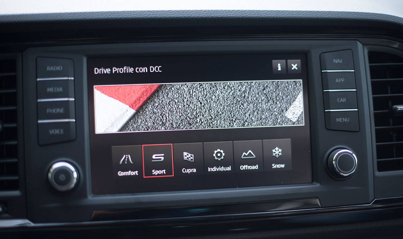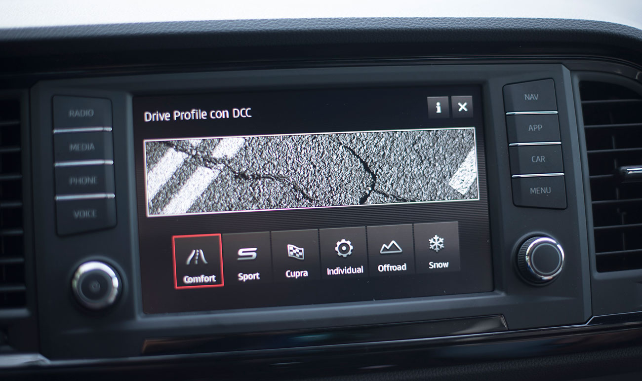 En el salpicadero, encontramos una pantalla táctil de 20,3 centímetros, desde la que se maneja todo el sistema de infoentretenimiento a la vez que el navegador, el sistema de sonido y que dispone de conectividad con los smartphones a través del sistema Mirror Link, Apple CarPlay y Android Auto. Tras el selector del cambio DSG, encontramos el mando giratorio SEAT Drive Profile, desde el que podemos escoger entre 6 modos de conducción prestablecidos: Comfort, Sport, CUPRA, Individual, nieve y off road.