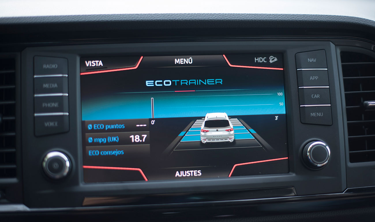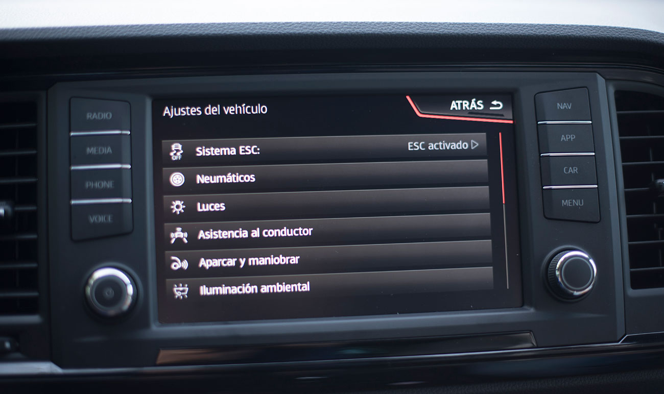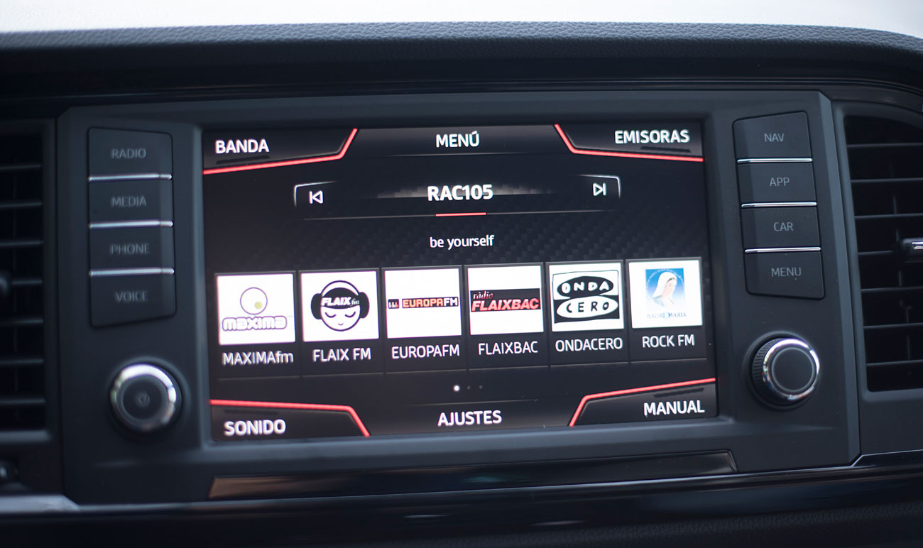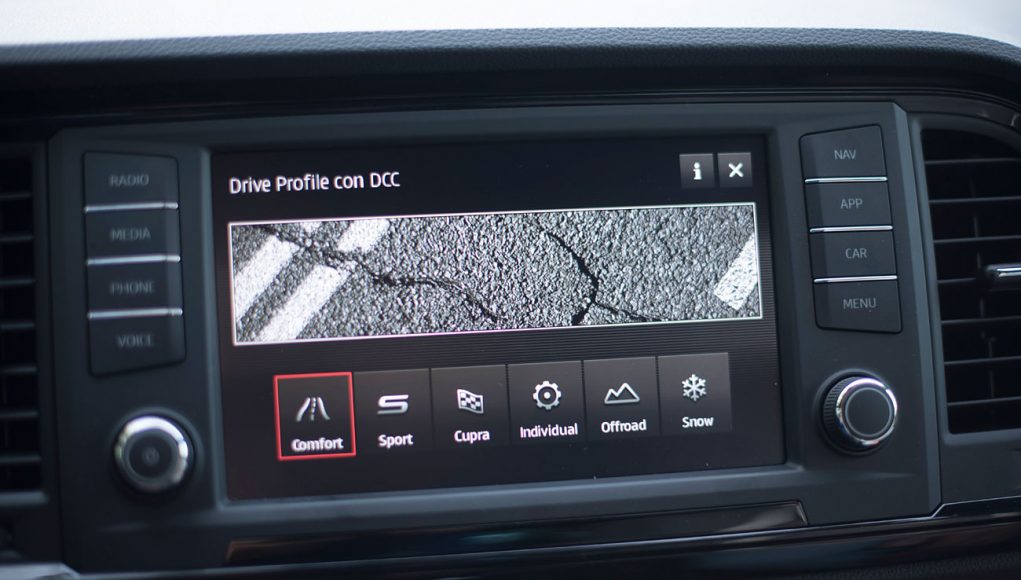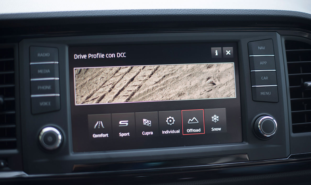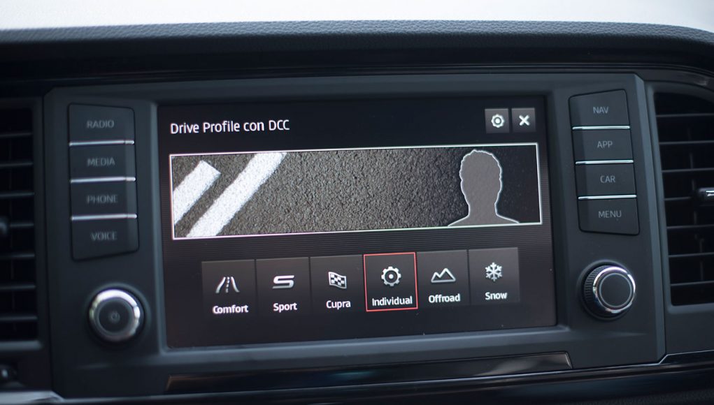 En el salpicadero, encontramos una pantalla táctil de 20,3 centímetros, desde la que se maneja todo el sistema de infoentretenimiento a la vez que el navegador, el sistema de sonido y que dispone de conectividad con los smartphones a través del sistema Mirror Link, Apple CarPlay y Android Auto. Tras el selector del cambio DSG, encontramos el mando giratorio SEAT Drive Profile, desde el que podemos escoger entre 6 modos de conducción prestablecidos: Comfort, Sport, CUPRA, Individual, nieve y off road.