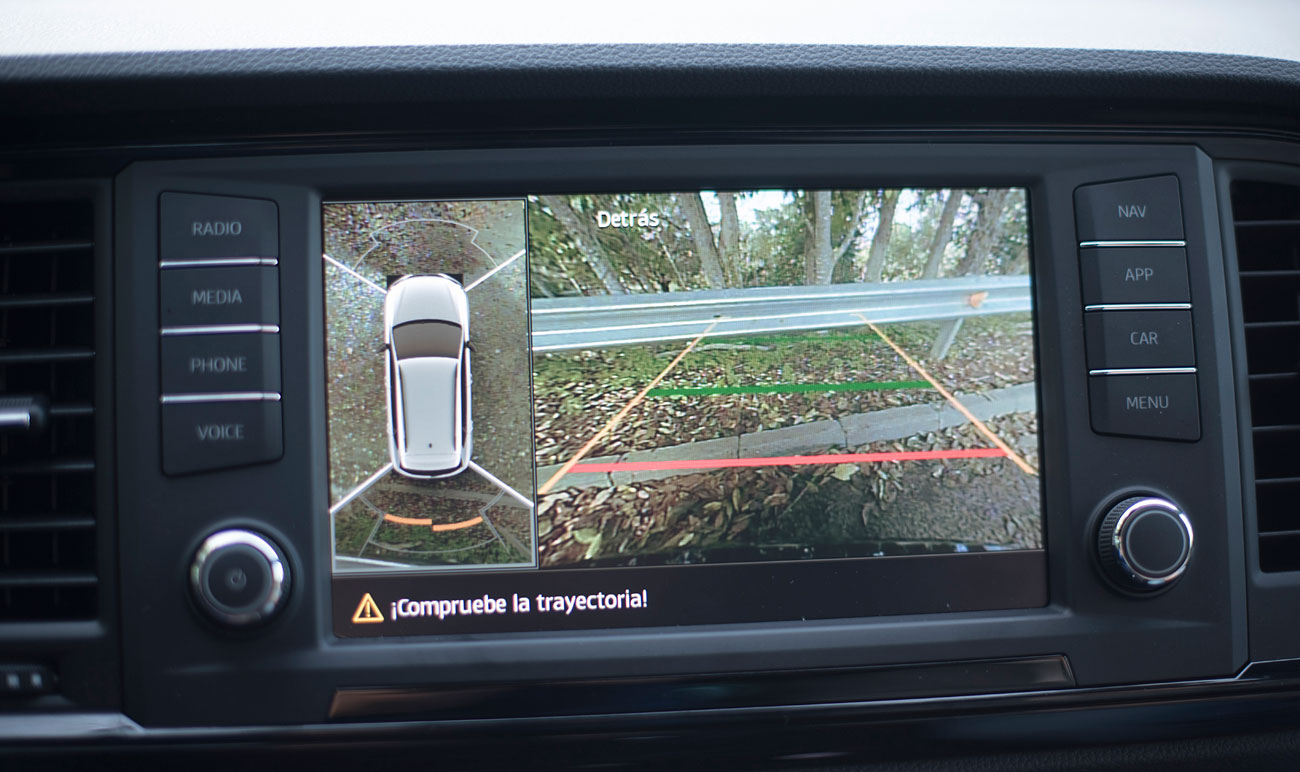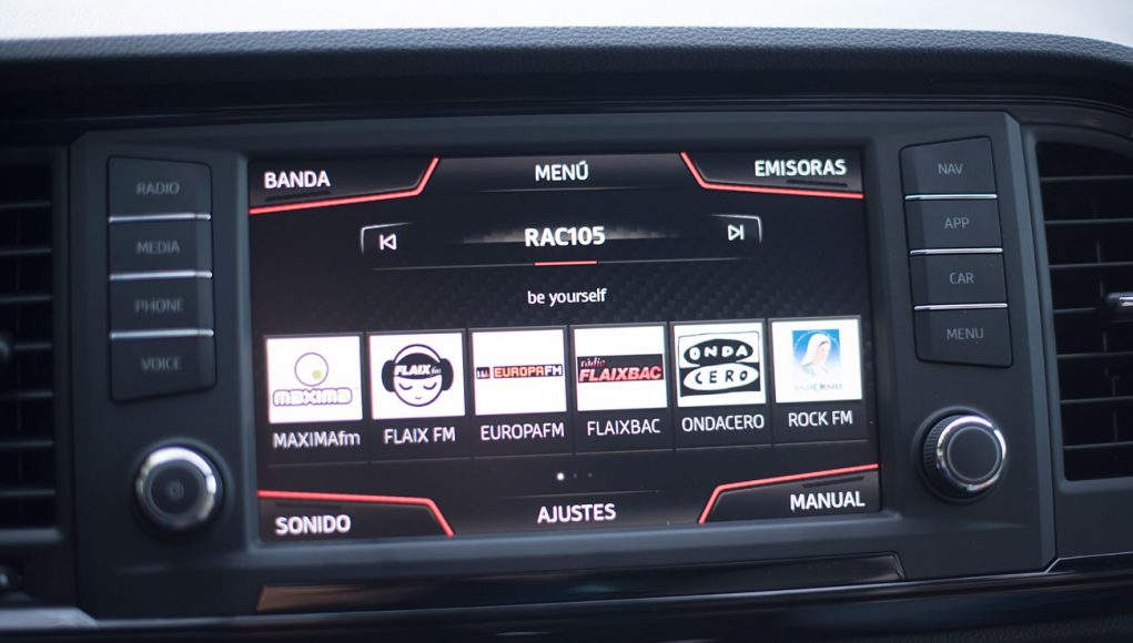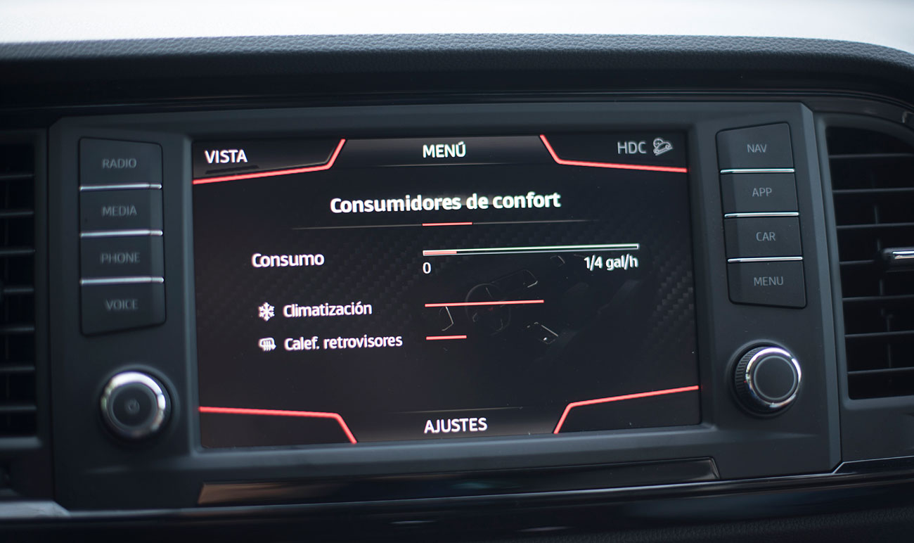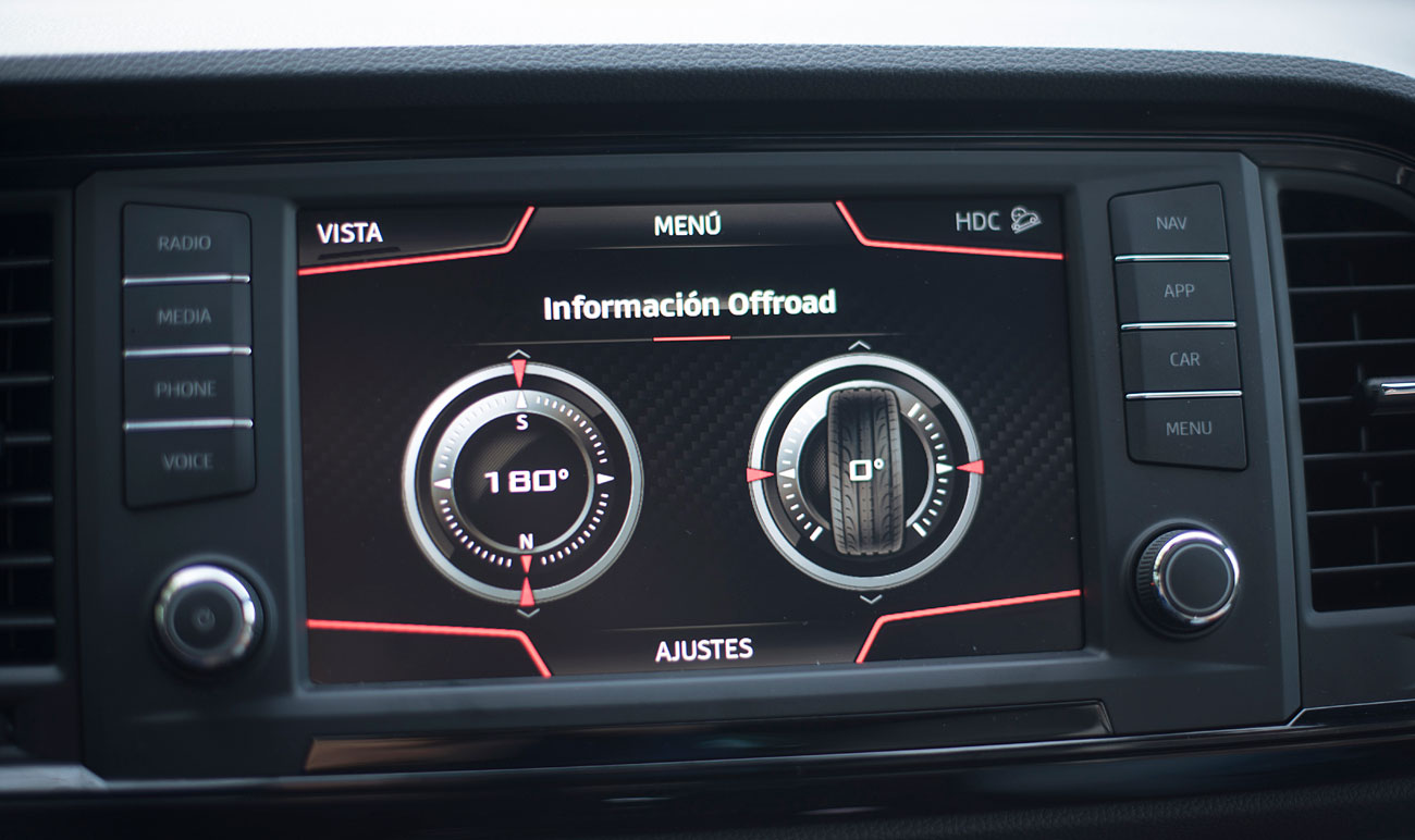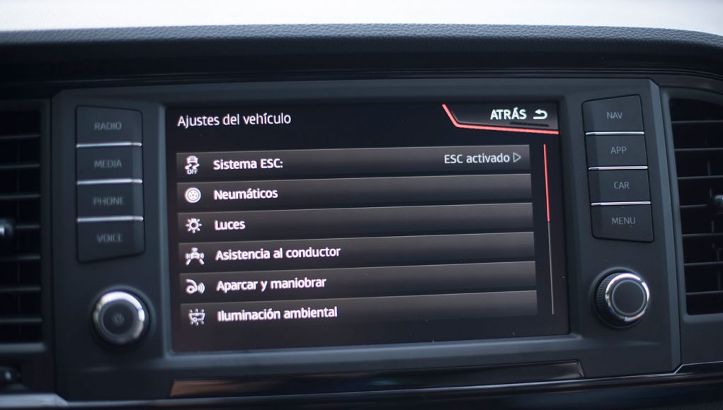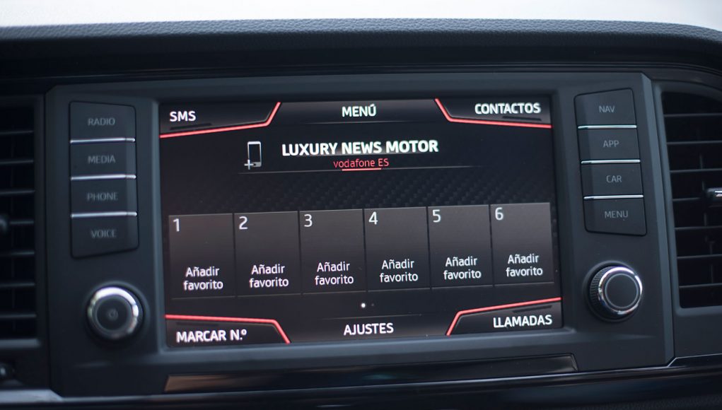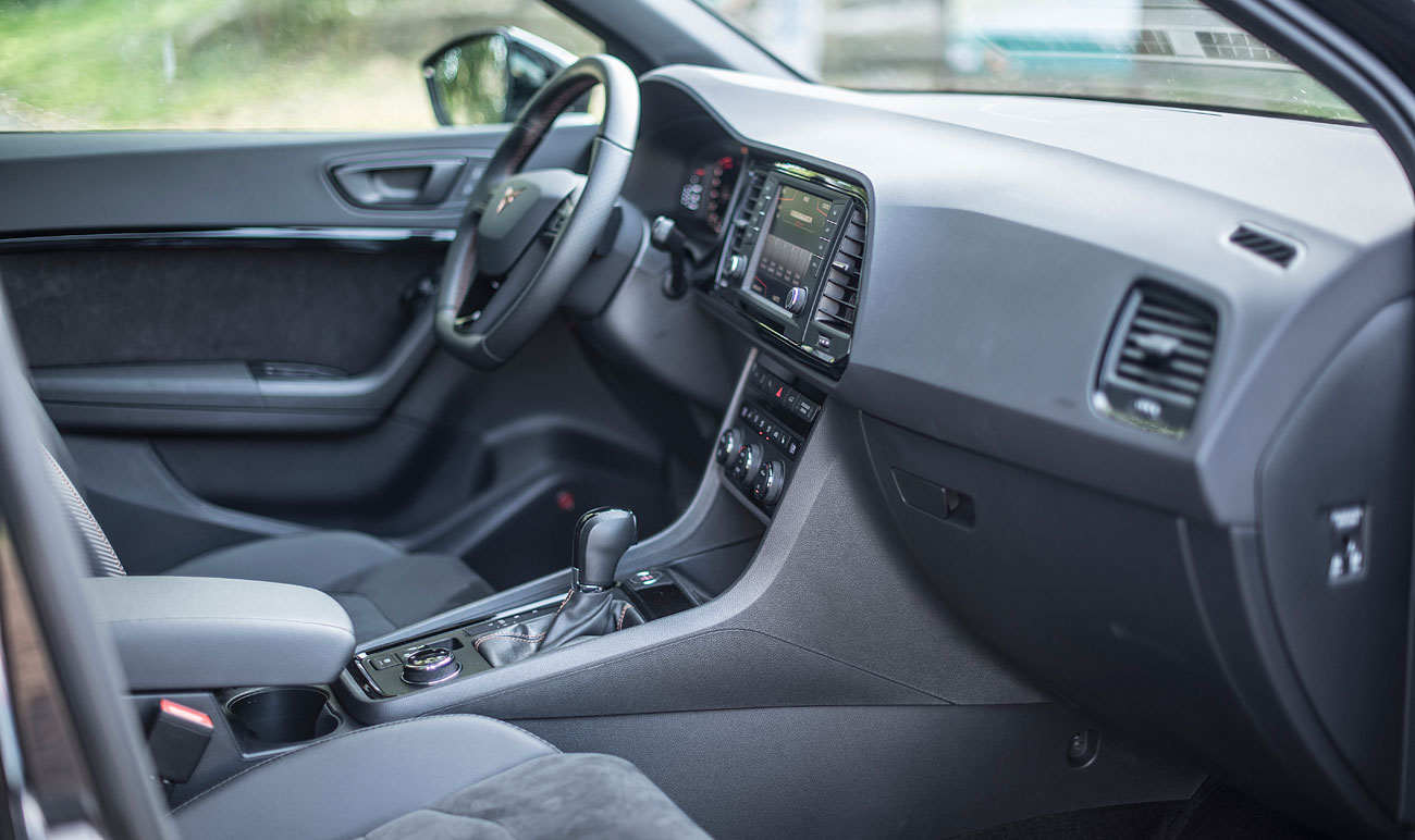 En el salpicadero, encontramos una pantalla táctil de 20,3 centímetros, desde la que se maneja todo el sistema de infoentretenimiento a la vez que el navegador, el sistema de sonido y que dispone de conectividad con los smartphones a través del sistema Mirror Link, Apple CarPlay y Android Auto. Tras el selector del cambio DSG, encontramos el mando giratorio SEAT Drive Profile, desde el que podemos escoger entre 6 modos de conducción prestablecidos: Comfort, Sport, CUPRA, Individual, nieve y off road.