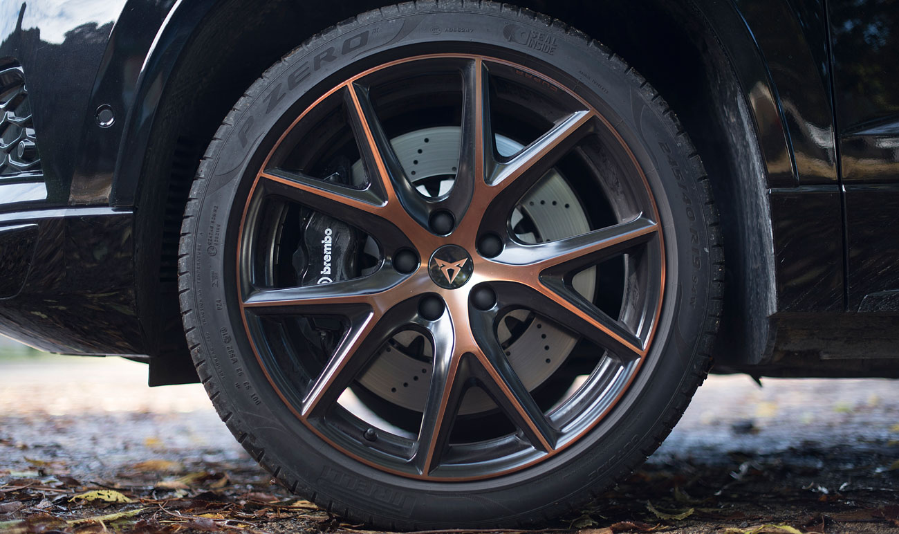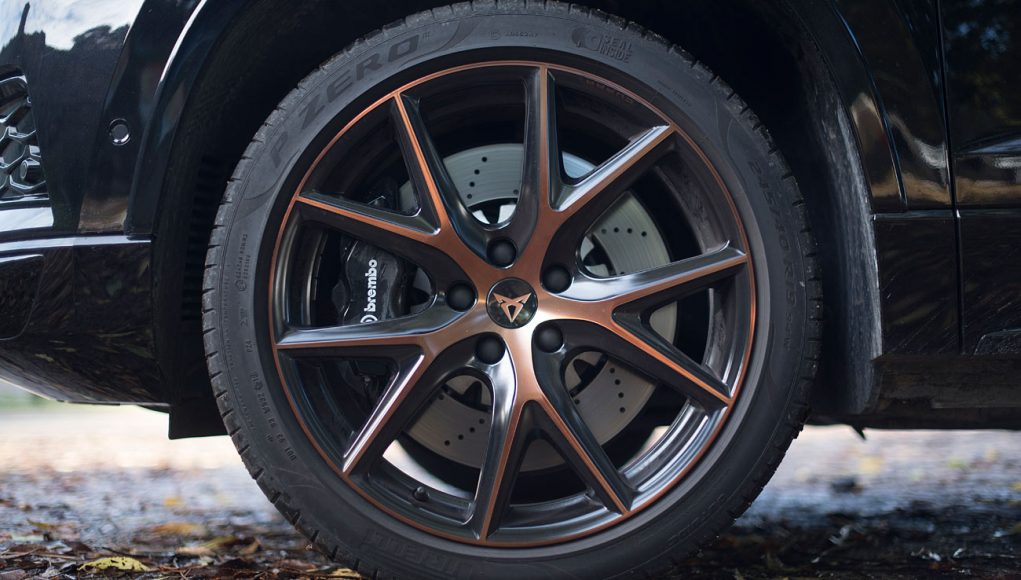 Visto de frente, el CUPRA Ateca, destaca por todos esos detalles que le confieren un empaque muy deportivo, y por la palabra CUPRA que podemos encontrar casi esculpida en color en aluminio mate en la parte inferior de la parrilla, evocando a los modelos más deportivos de la gama RS de Audi, pero es quizás en la vista lateral, dónde más se aprecian, gracias en parte a los pasos de rueda sobredimensionados a la vez que por las llantas de 19” que forman parte del paquete Performance Pack que es opcional.