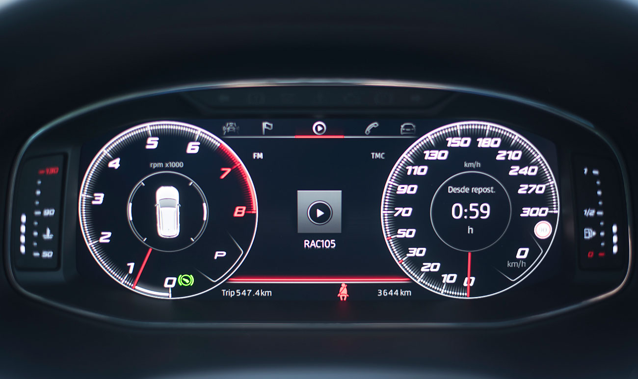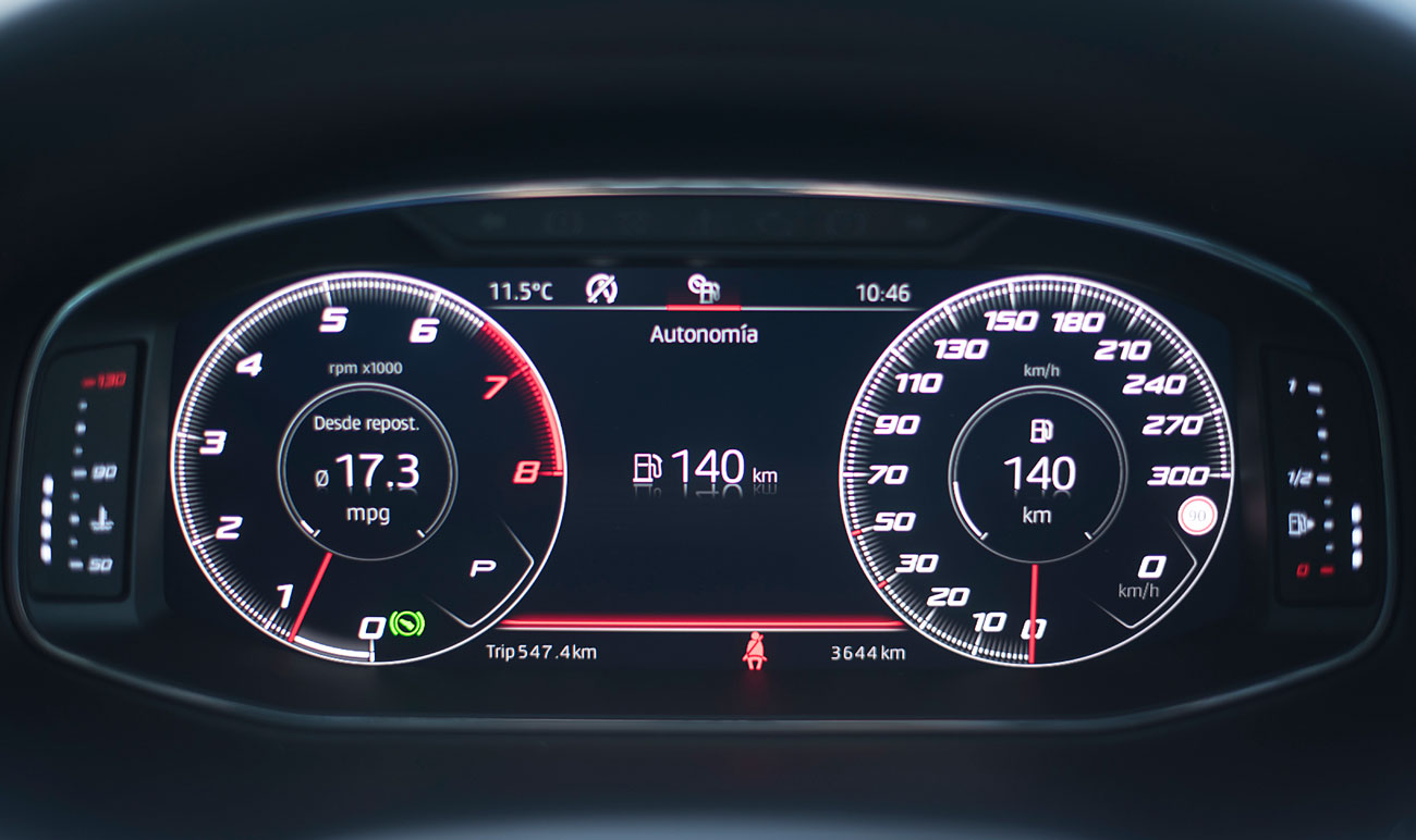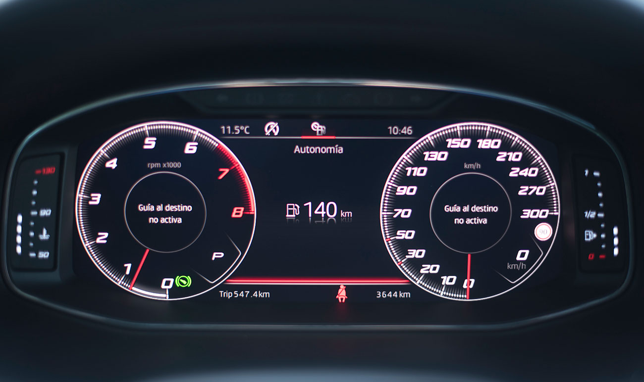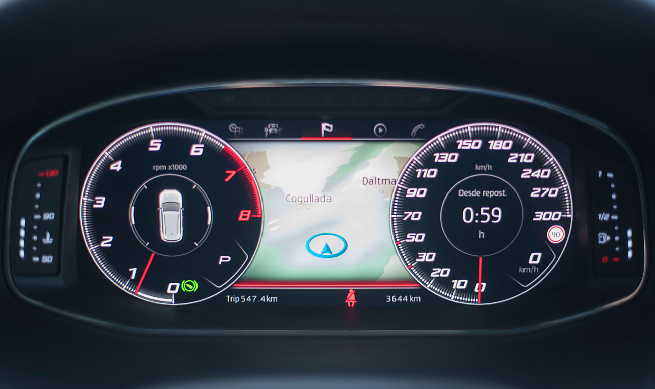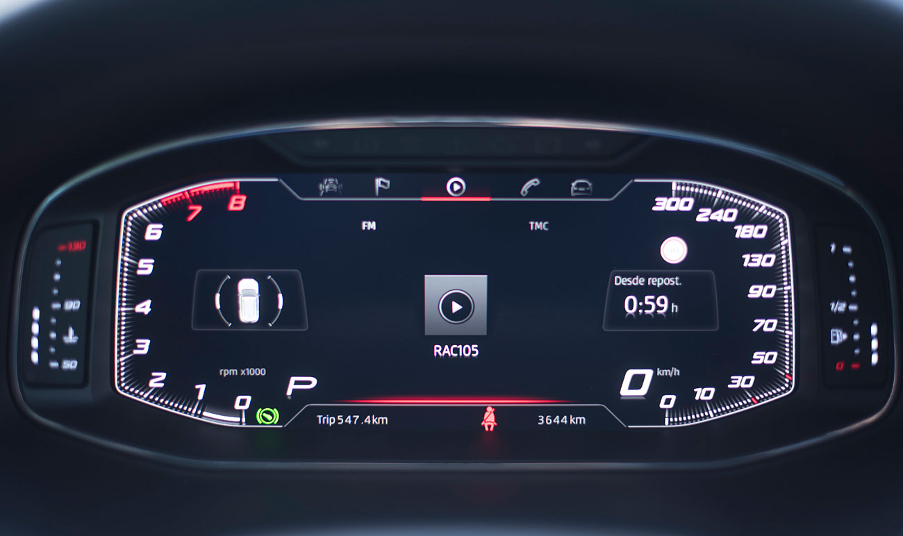 El volante deportivo, dispone de la parte inferior achatada, e integra las levas para el manejo del cambio de forma secuencial. Tras este, encontramos el Digital Cockpit de 10”, que ya habíamos visto en Ateca, pero que en este modelo cuenta con unas grafías propias que enfatizan más si cabe su enfoque deportivo y que es totalmente personalizable por el conductor.
