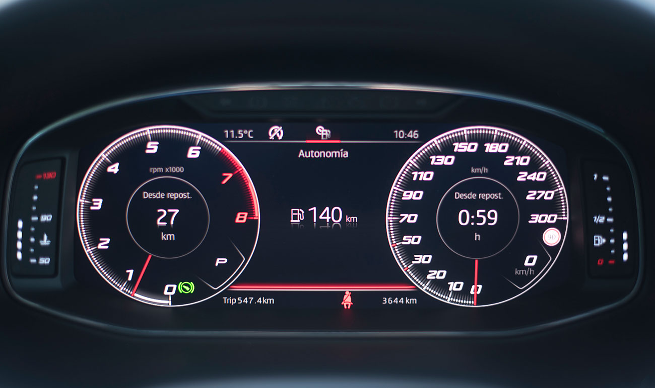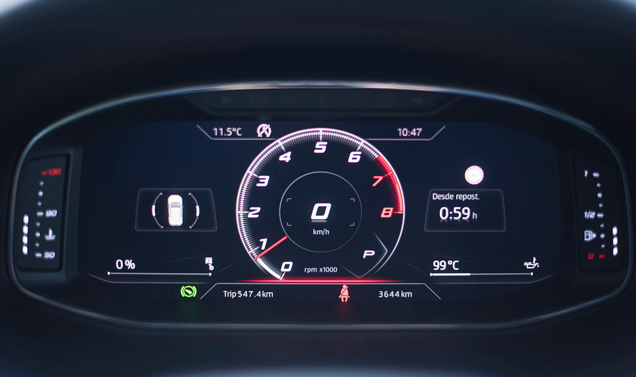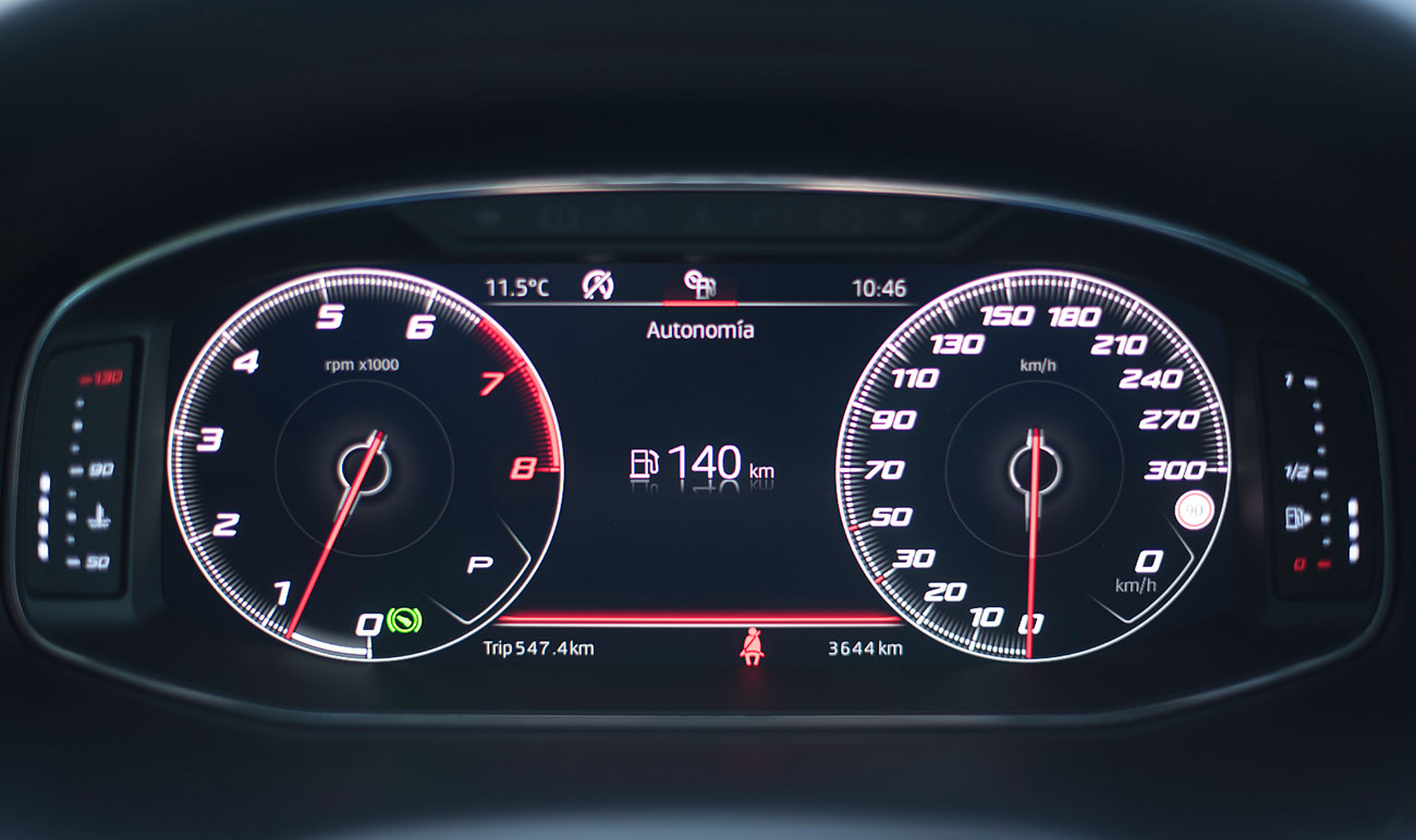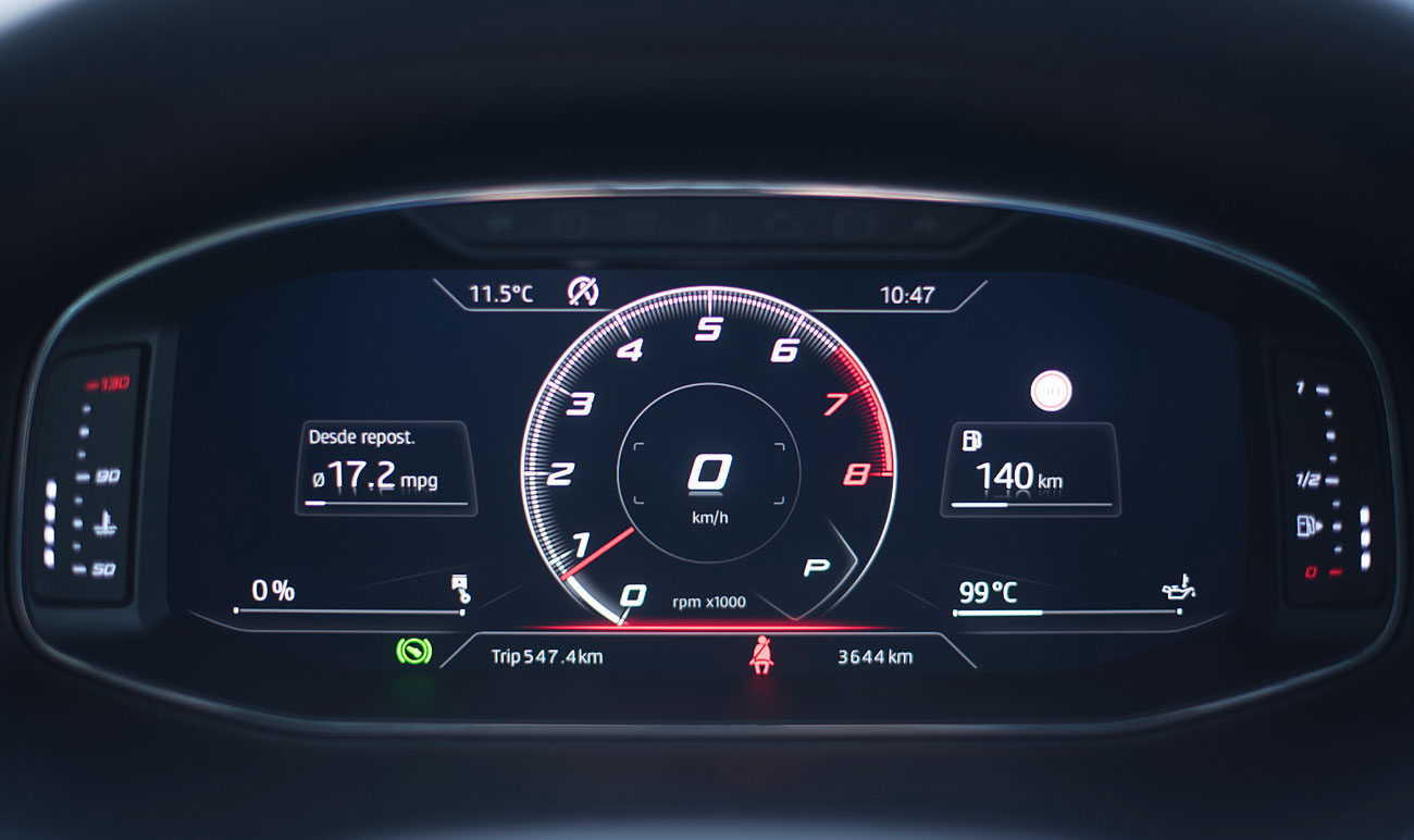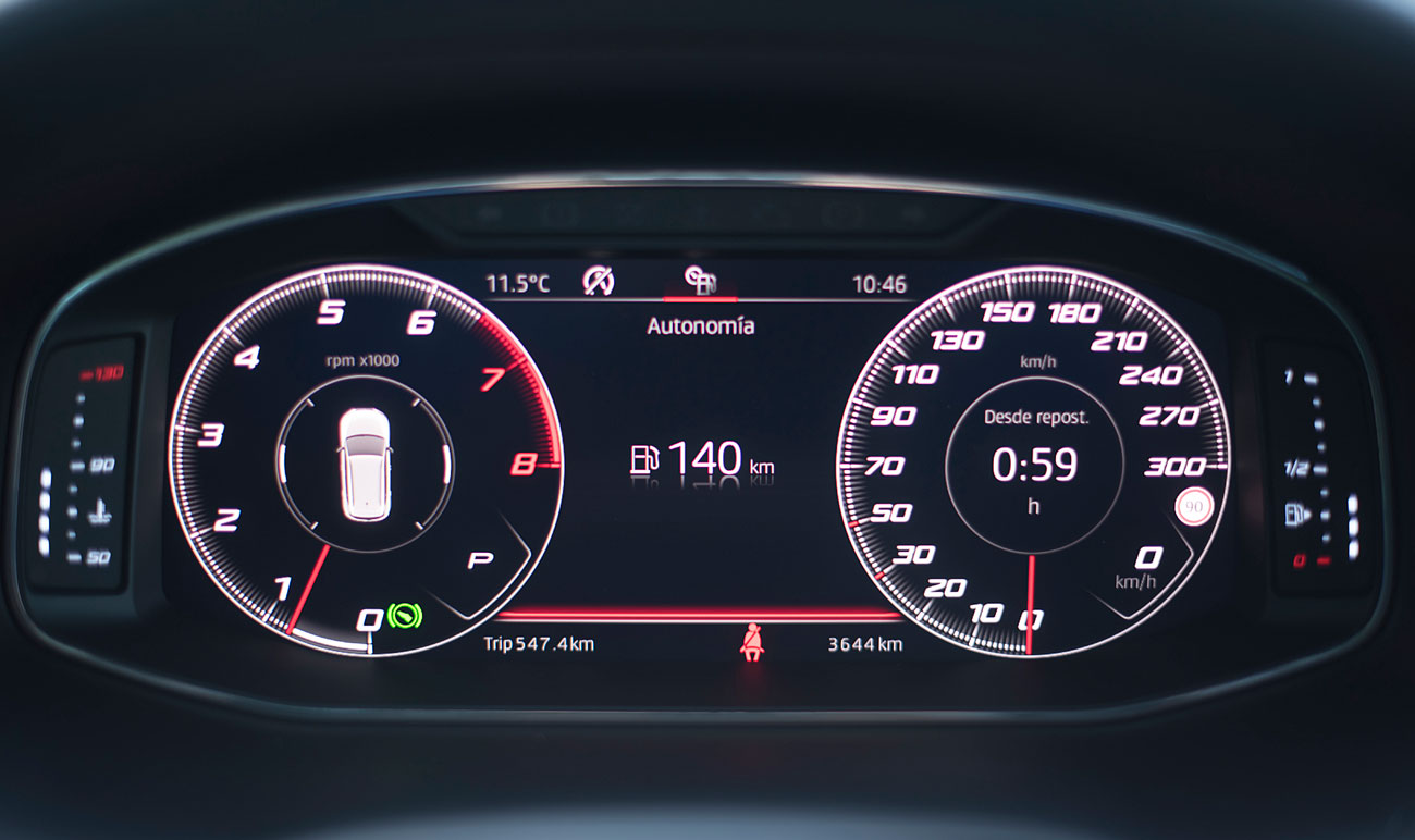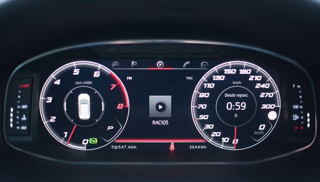 El volante deportivo, dispone de la parte inferior achatada, e integra las levas para el manejo del cambio de forma secuencial. Tras este, encontramos el Digital Cockpit de 10”, que ya habíamos visto en Ateca, pero que en este modelo cuenta con unas grafías propias que enfatizan más si cabe su enfoque deportivo y que es totalmente personalizable por el conductor.