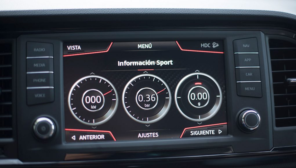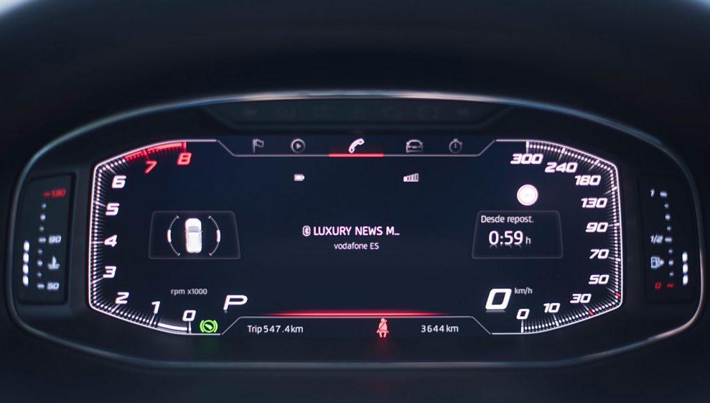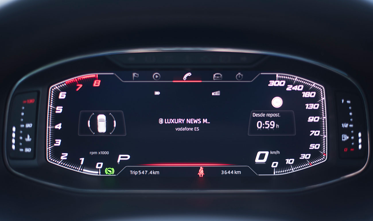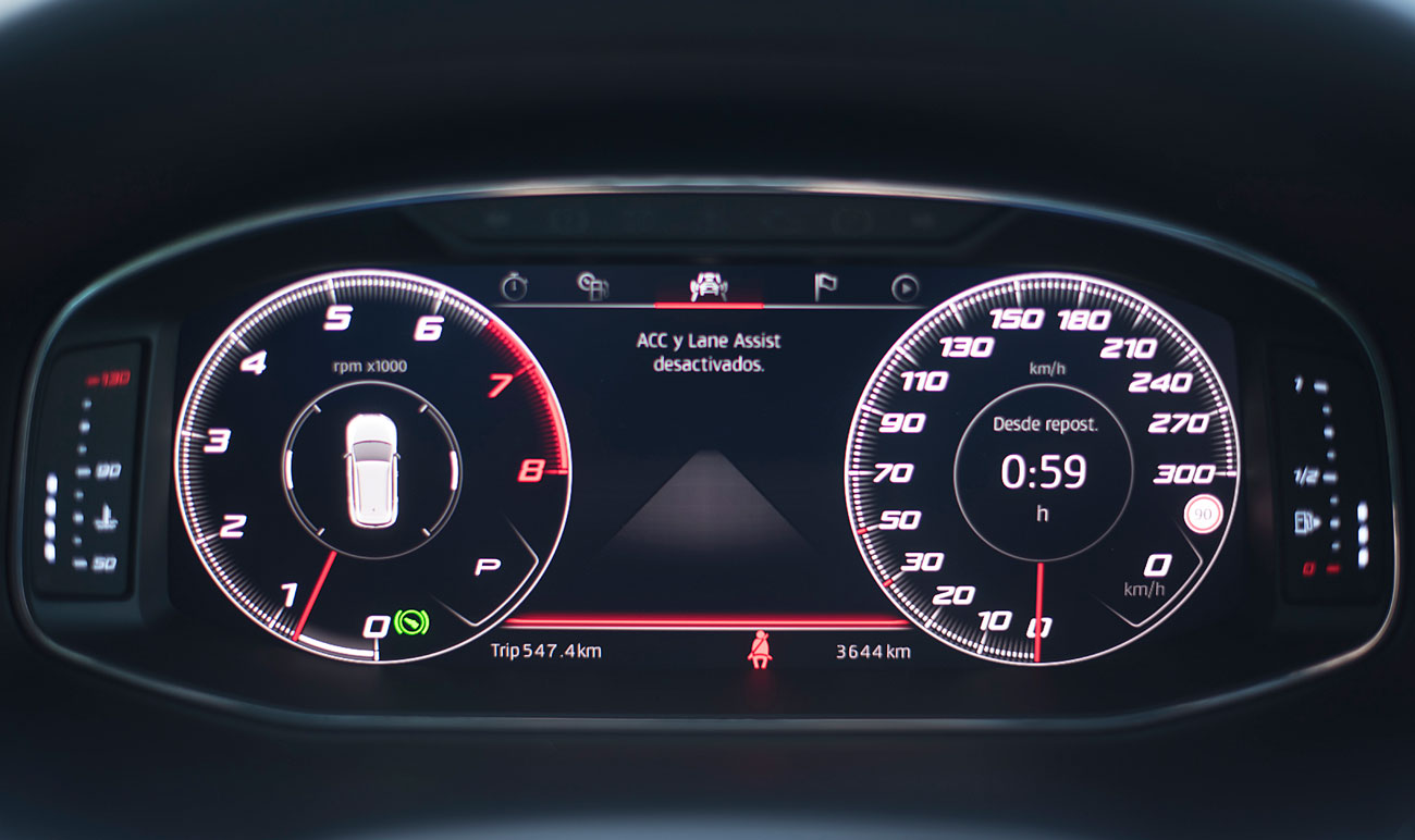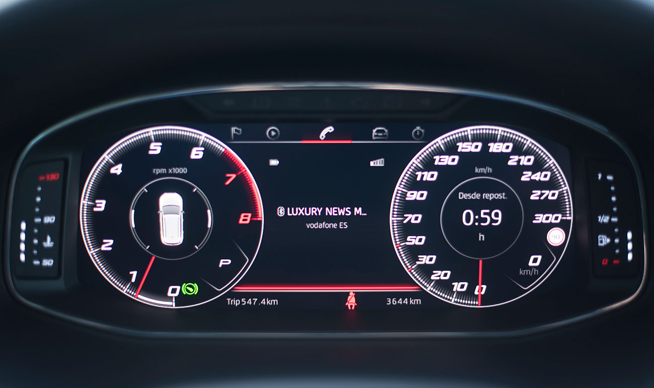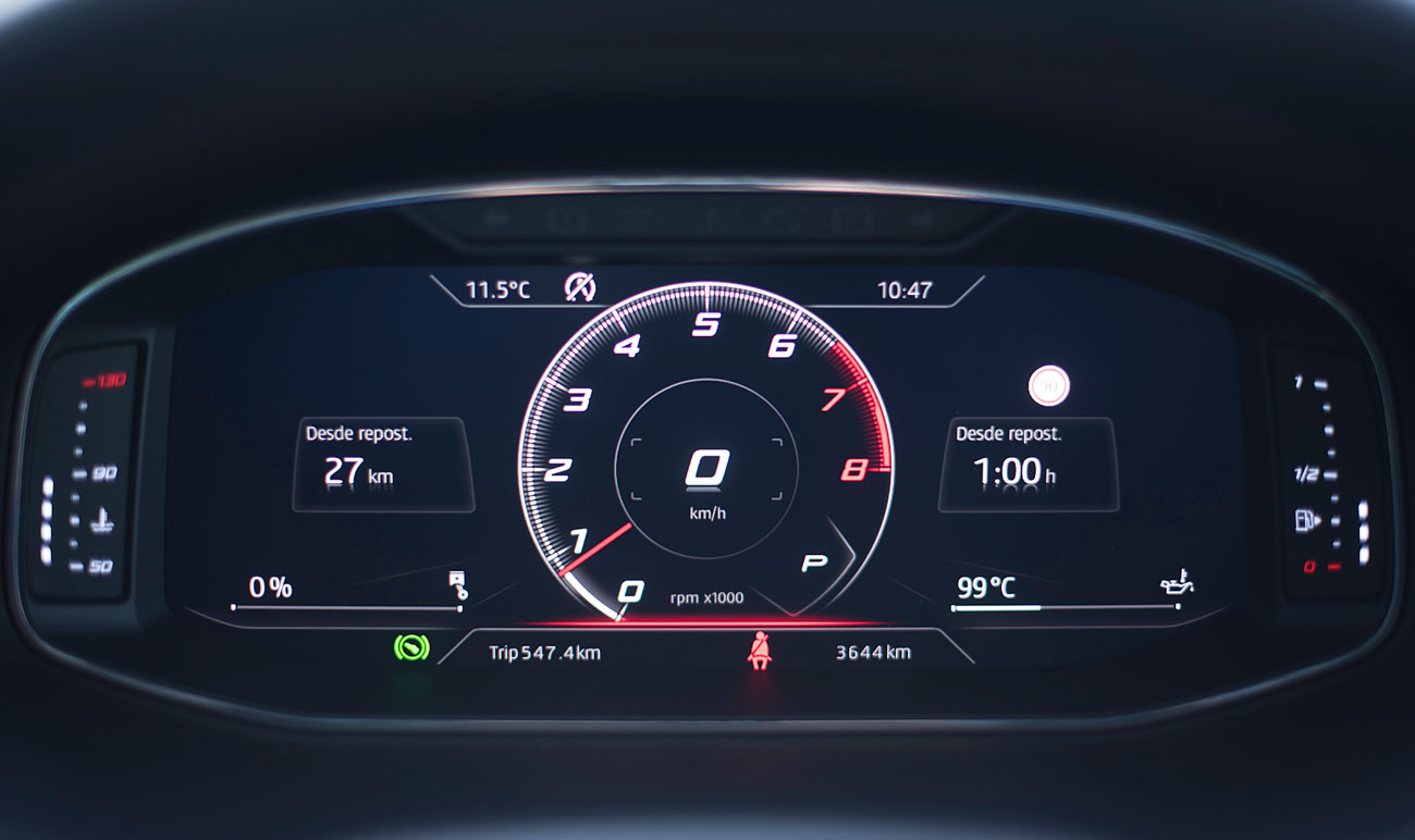El volante deportivo, dispone de la parte inferior achatada, e integra las levas para el manejo del cambio de forma secuencial. Tras este, encontramos el Digital Cockpit de 10”, que ya habíamos visto en Ateca, pero que en este modelo cuenta con unas grafías propias que enfatizan más si cabe su enfoque deportivo y que es totalmente personalizable por el conductor.