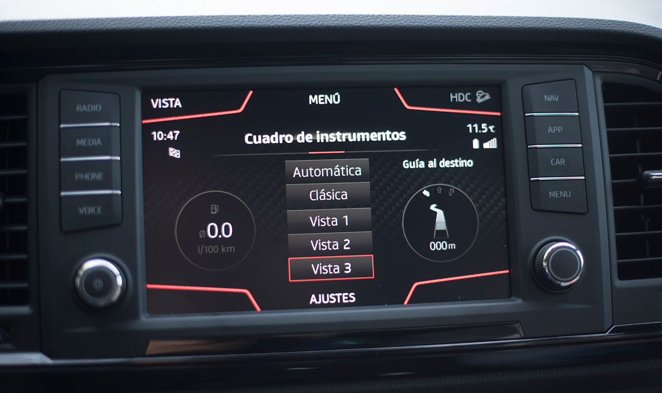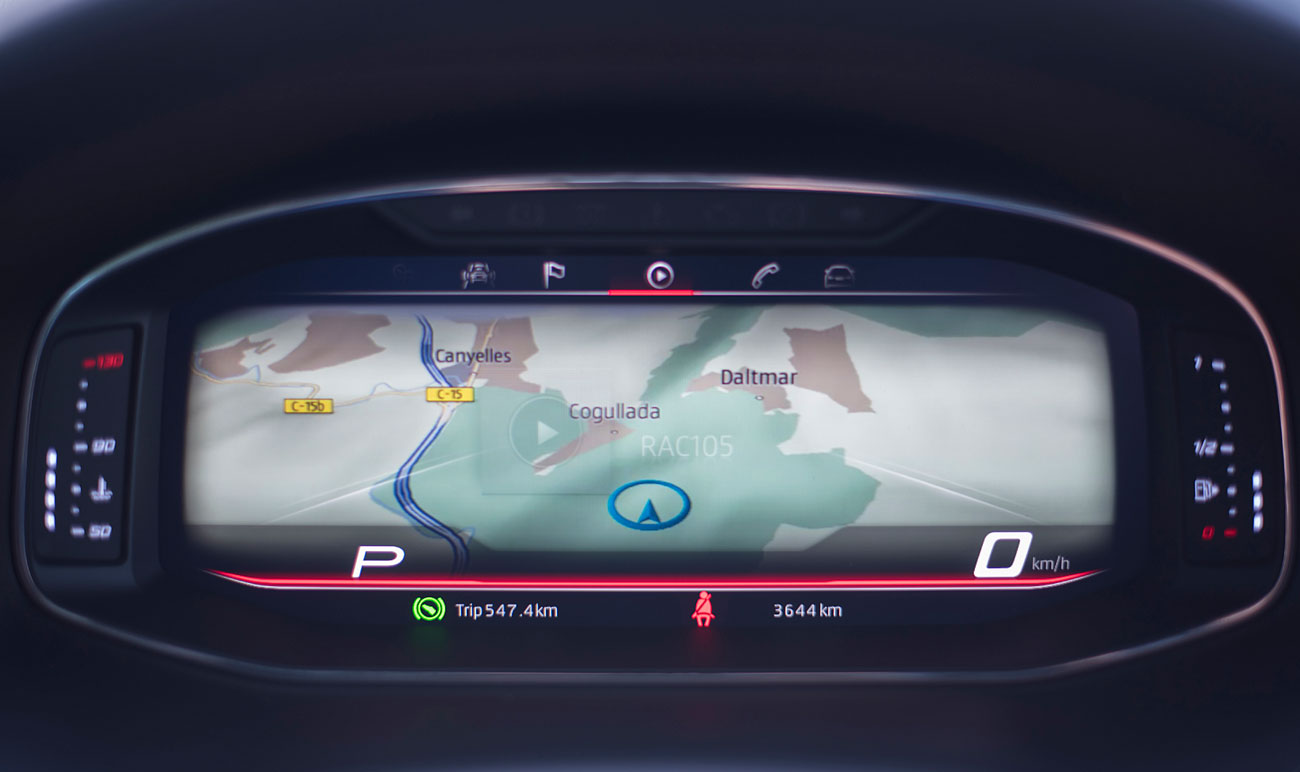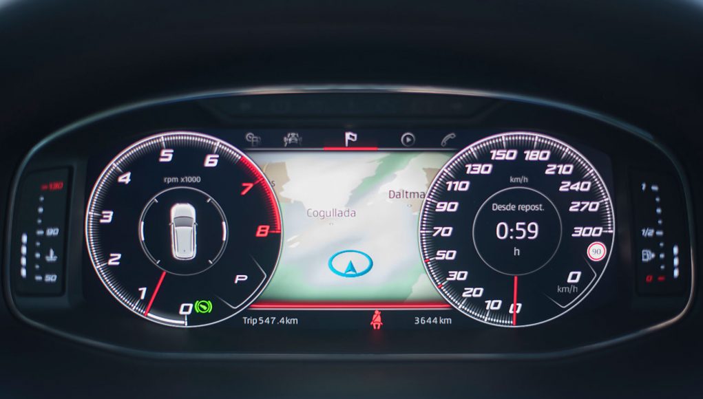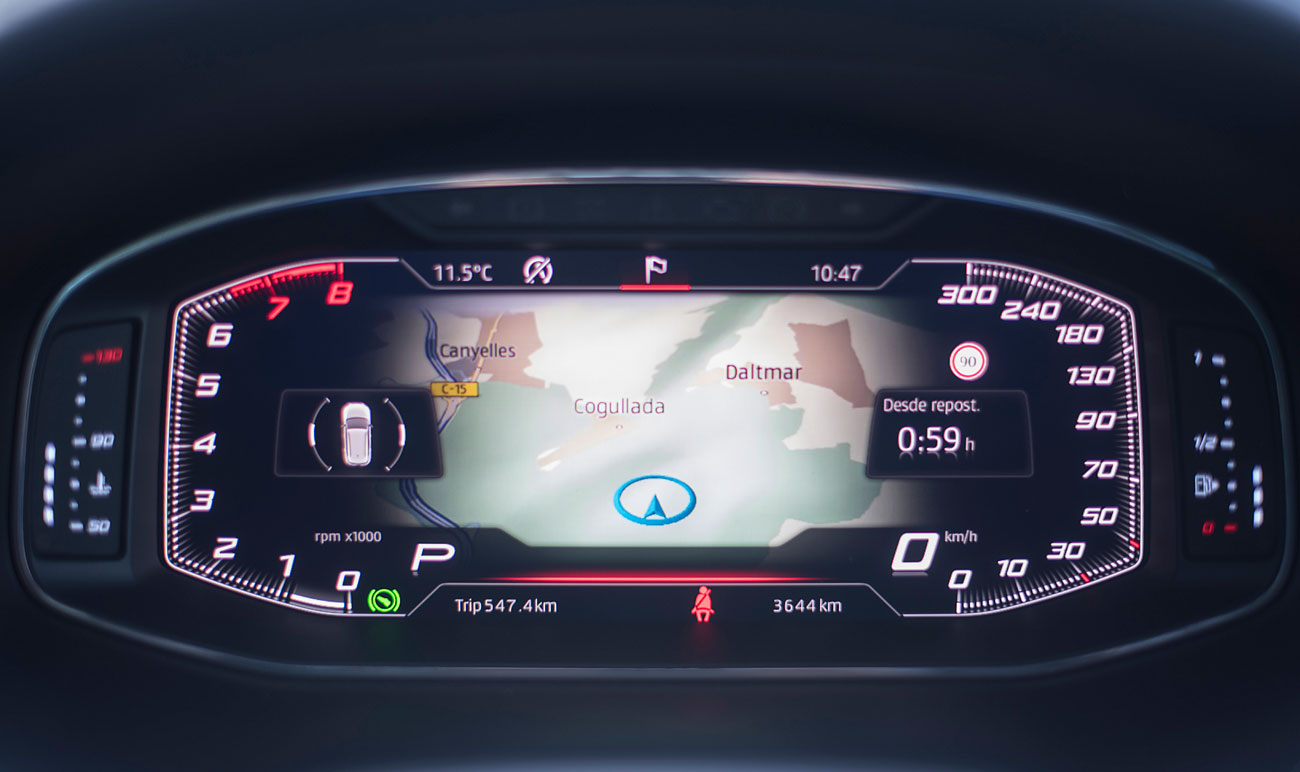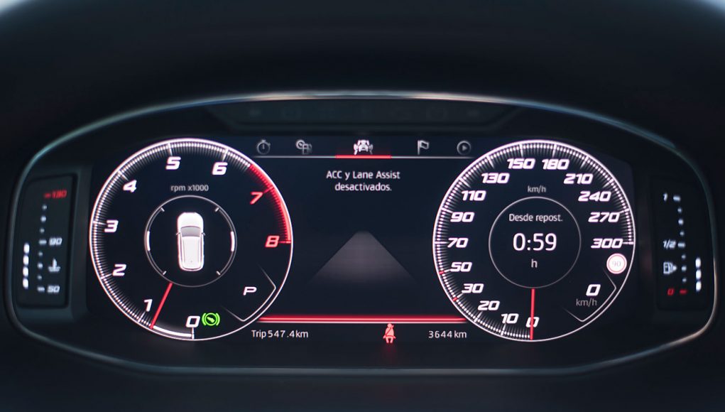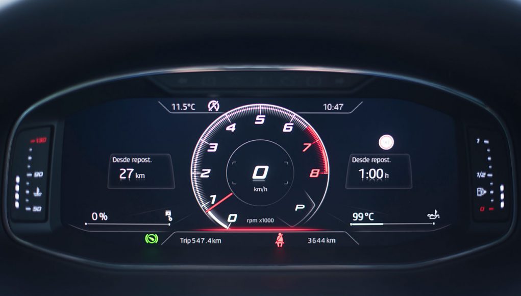 El volante deportivo, dispone de la parte inferior achatada, e integra las levas para el manejo del cambio de forma secuencial. Tras este, encontramos el Digital Cockpit de 10”, que ya habíamos visto en Ateca, pero que en este modelo cuenta con unas grafías propias que enfatizan más si cabe su enfoque deportivo y que es totalmente personalizable por el conductor.