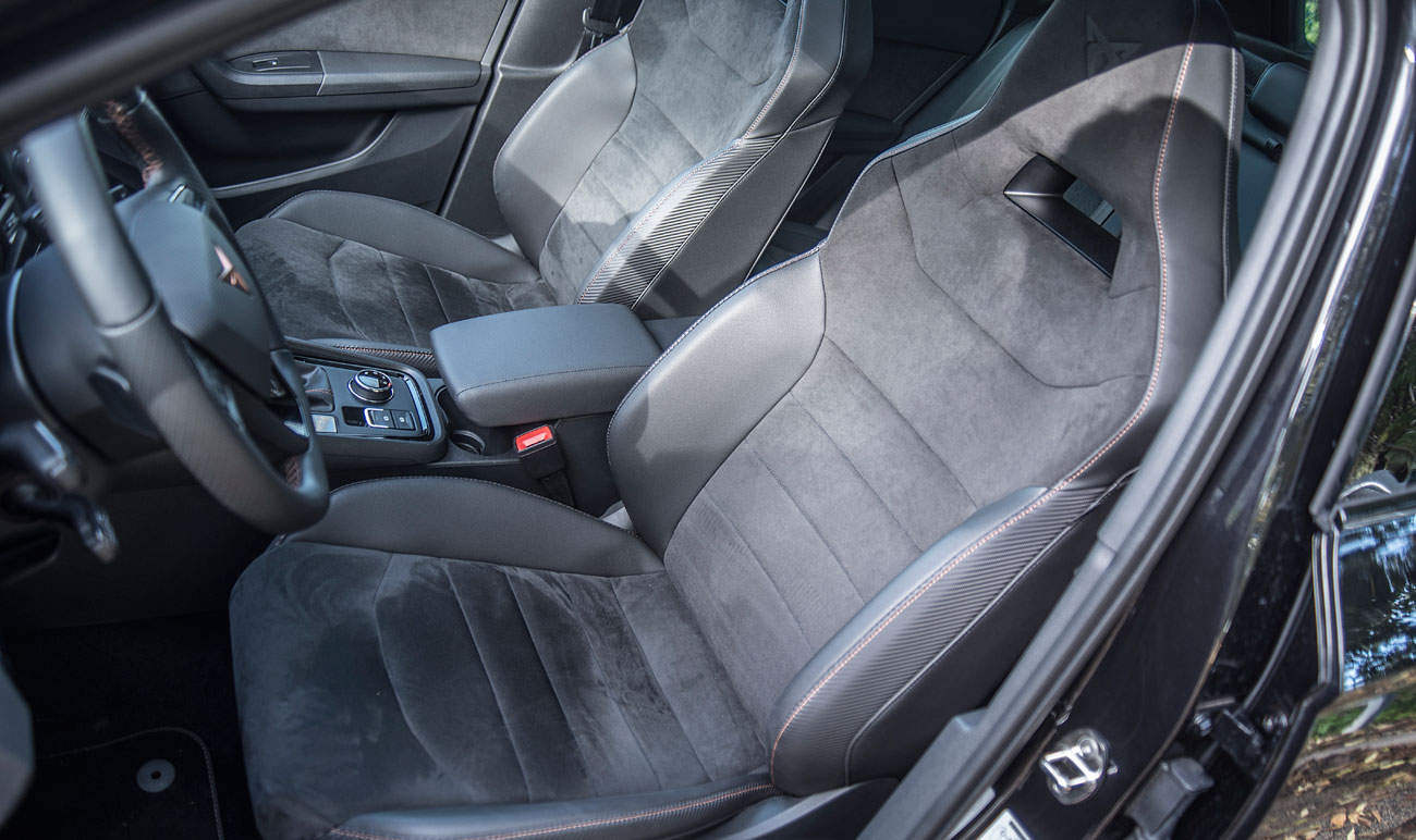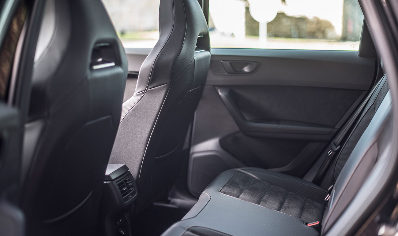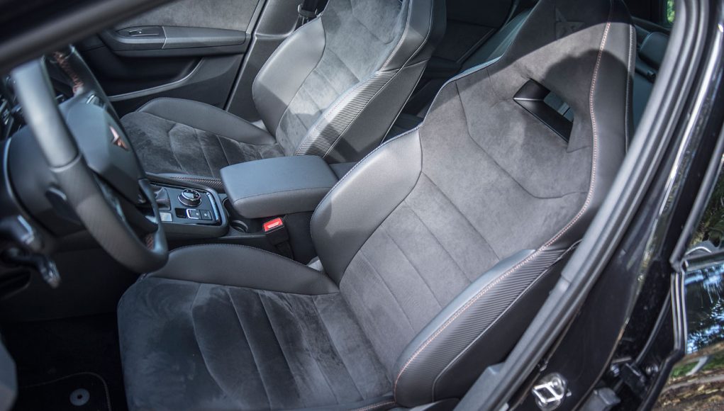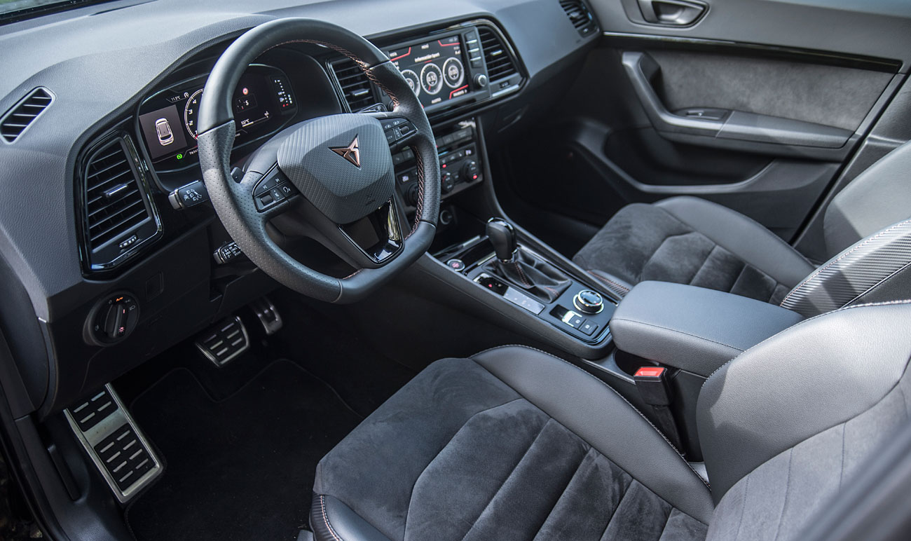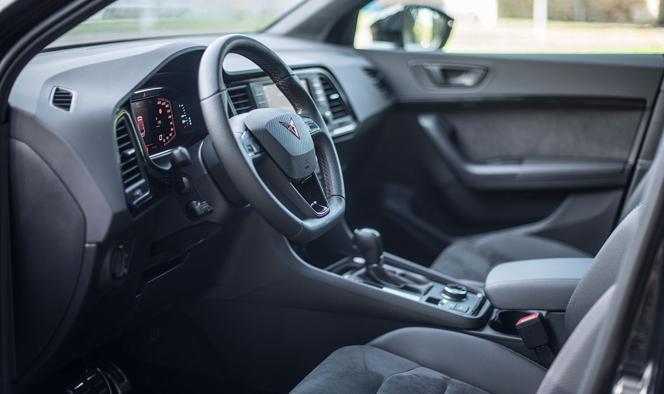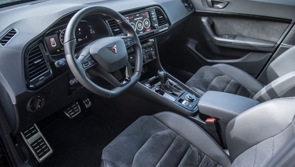 Cuando abres la puerta para acceder al interior, a tu cabeza vienen elementos conocidos de la marca, de hecho, el habitáculo es exactamente igual al de un Ateca convencional, pero mejorado, y no solo en lo que a estética se refiere, sino también a la calidad de materiales utilizados. La moldura que da la bienvenida lo hace con la palabra CUPRA retroiluminada, detalle que a priori no parece nada espectacular, pero que ya apunta a maneras. Ahora bien, todo aquello que puedes palpar, es lo que te hacer ver que esto no es un SEAT más, sino que aquí, se han tomado muy enserio que esta marca navegue por si sola despuntando como un vehículo deportivo de ambiente premium.