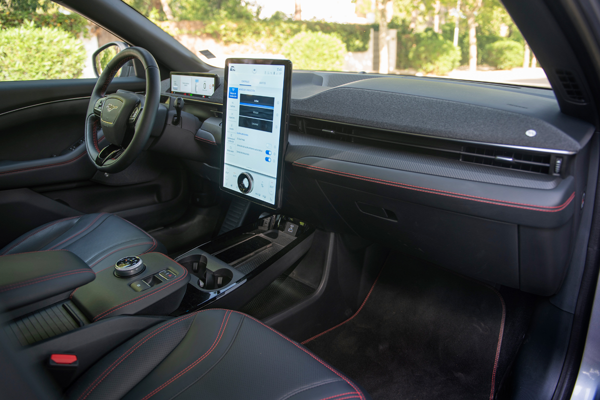 Su diseño es cautivador, y es evidente que llevando el apellido que lleva, haya guiños hacia el diseño que todos conocemos de un Mustang, aunque en este caso todo se lleve para mejorar su eficiencia y su coeficiente aerodinámico en aras de mejorar su autonomía eléctrica. En el frontal destaca la parrilla cerrada en la que como no, encontramos su sello de distinción, así como unos faros que dotan a esta parte del coche de una mirada atractiva y unas nervaduras en el capó propias para alojar a un V8.