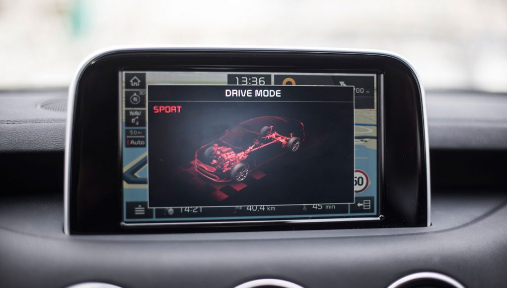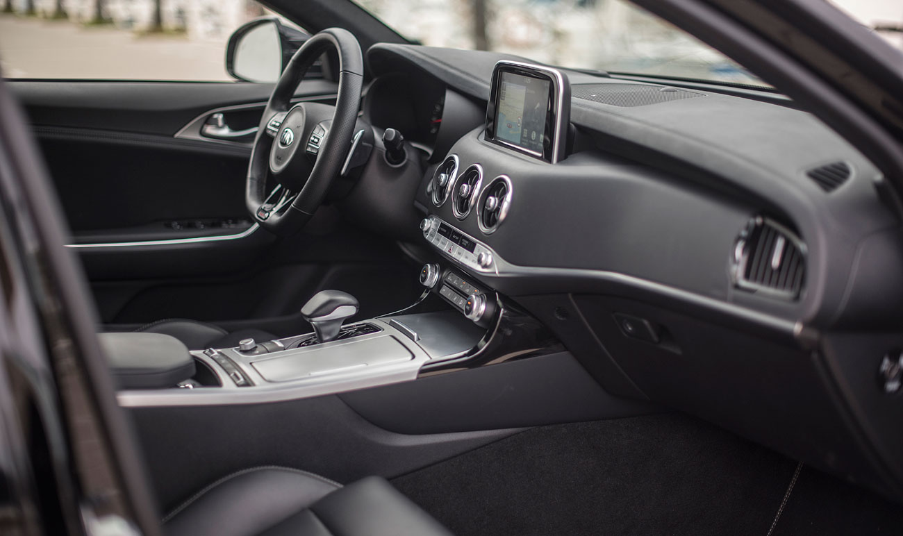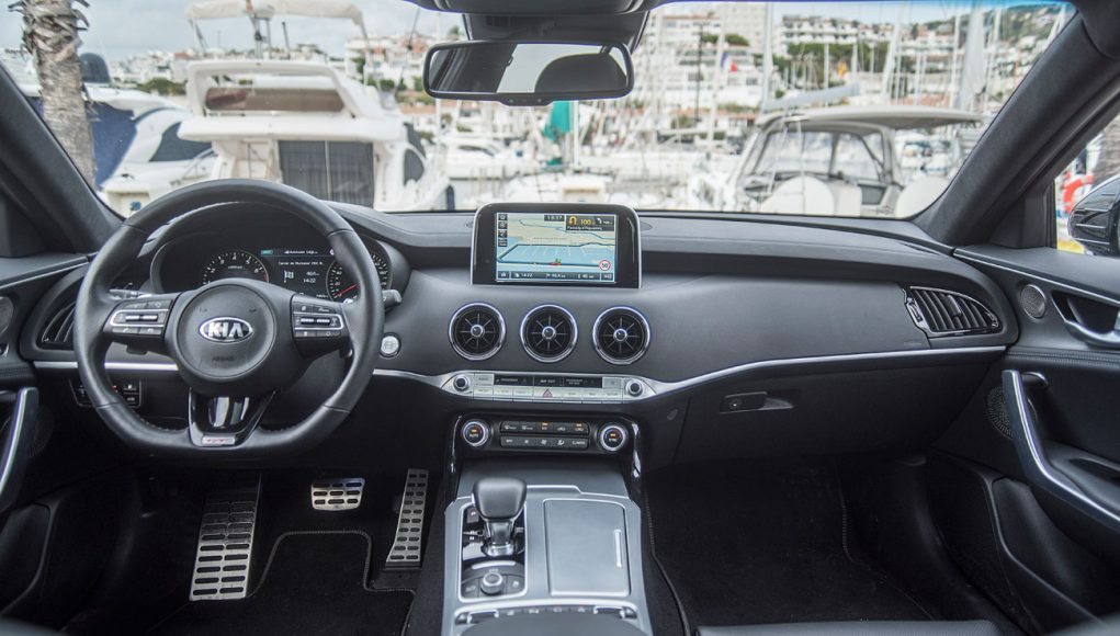 El atractivo del Stinger, no solo el visible en el exterior, sino también en el habitáculo, que según dicen sus diseñadores, ha recibido una clara inspiración aeronáutica. Tras abrir la puerta, lo primero que destaca es su ambiente premium, así como unos asientos tapizados en piel de corte deportivo, que recogen el cuerpo muy bien a la vez que lo sustentan con firmeza en los apoyos laterales. La posición de conducción es acertada y deportiva, ya que vas sentado muy abajo, en un asiento en el que gracias a sus numerosos reglajes es fácil acomodarse.