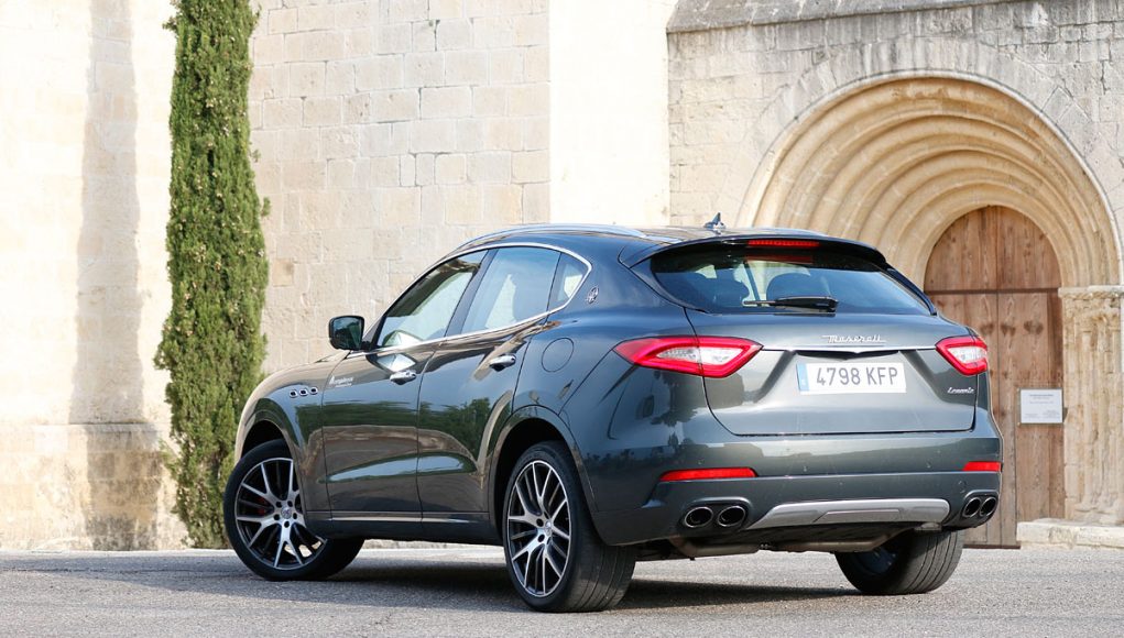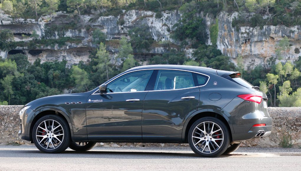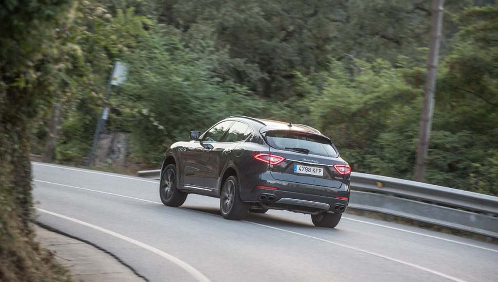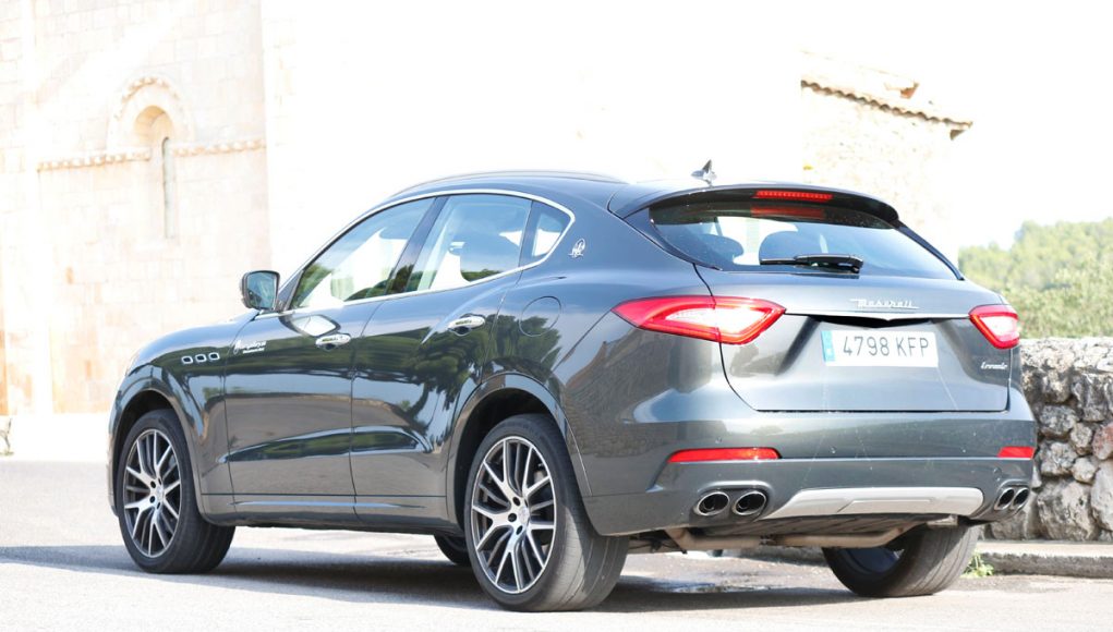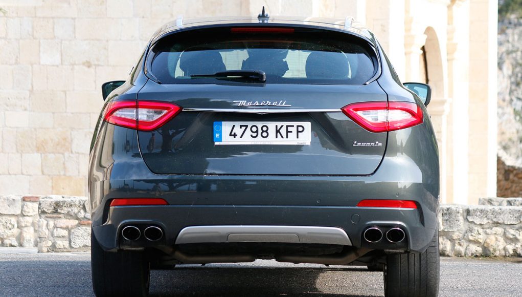 La vista lateral es quizás la que más define al Levante, donde vemos en primer lugar las originales tomas de aire comunes en toda la gama de la marca, así como una línea de media cintura que recorre los casi 5,5 metros y que finaliza en la musculosa trasera, en la que encontramos el logo “Saetta” en el pilar C, otro de los signos más distintivos de la marca. Y por último en la zaga unos pilotos LED dan la forma lumínica a esta parte del coche, donde destaca también el difusor-protector cromado que aloja las dobles salidas de escape y un spoiler que corona el portón trasero.