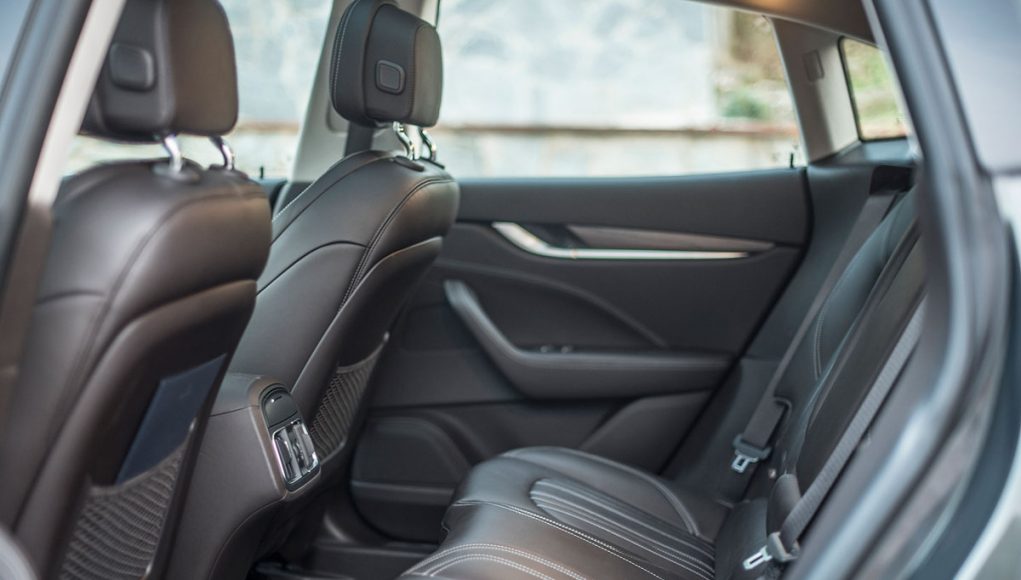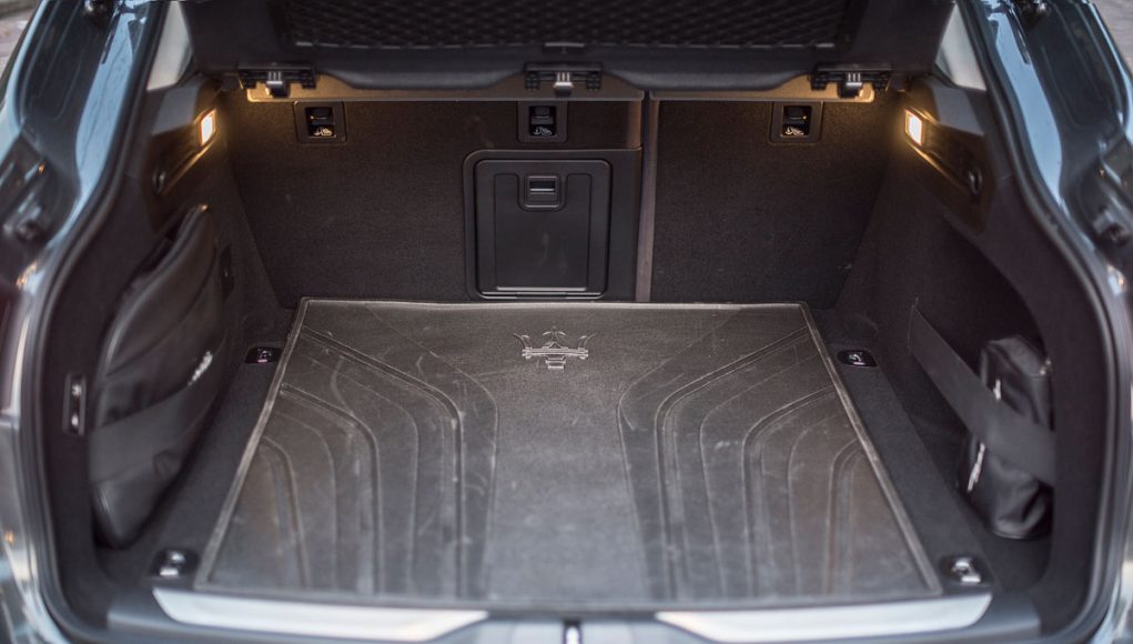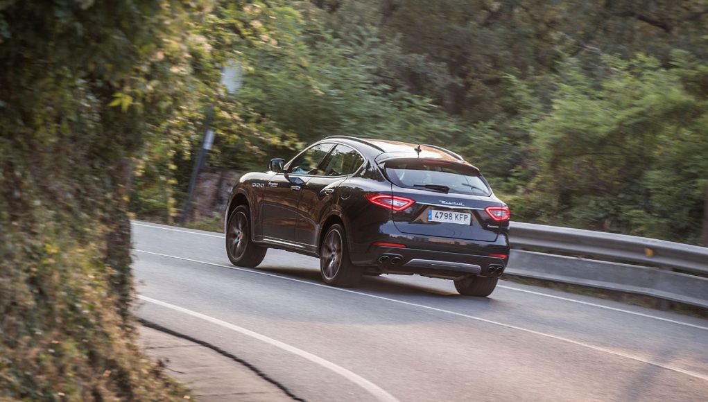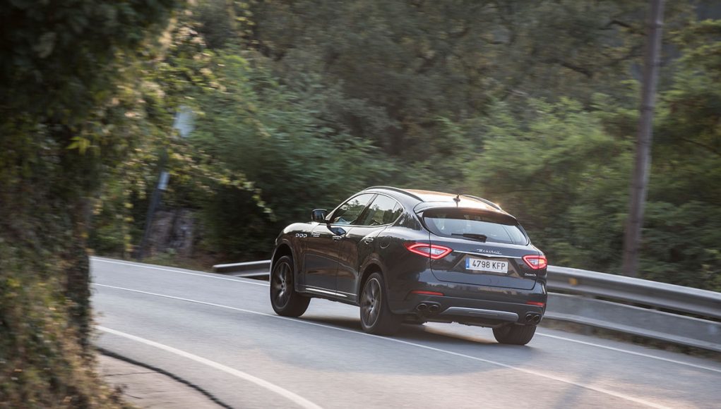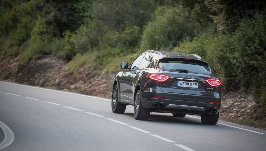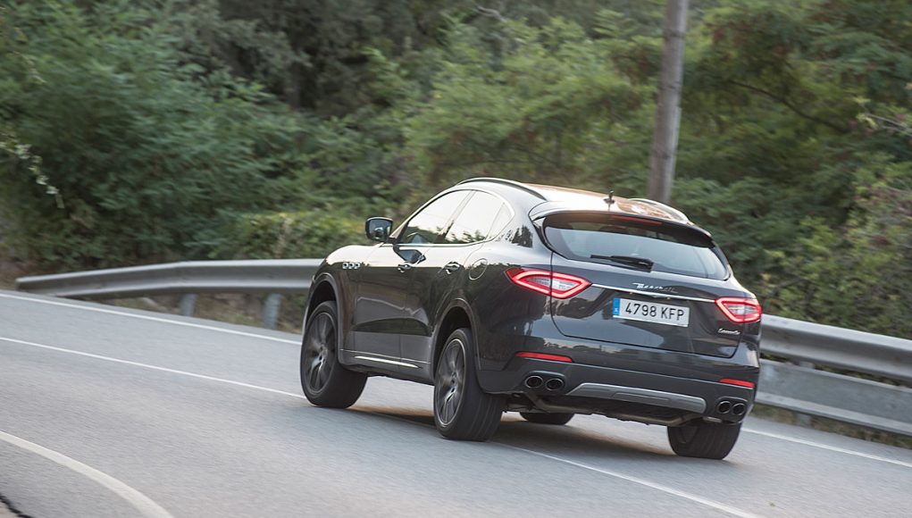 La vista lateral es quizás la que más define al Levante, donde vemos en primer lugar las originales tomas de aire comunes en toda la gama de la marca, así como una línea de media cintura que recorre los casi 5,5 metros y que finaliza en la musculosa trasera, en la que encontramos el logo “Saetta” en el pilar C, otro de los signos más distintivos de la marca. Y por último en la zaga unos pilotos LED dan la forma lumínica a esta parte del coche, donde destaca también el difusor-protector cromado que aloja las dobles salidas de escape y un spoiler que corona el portón trasero.