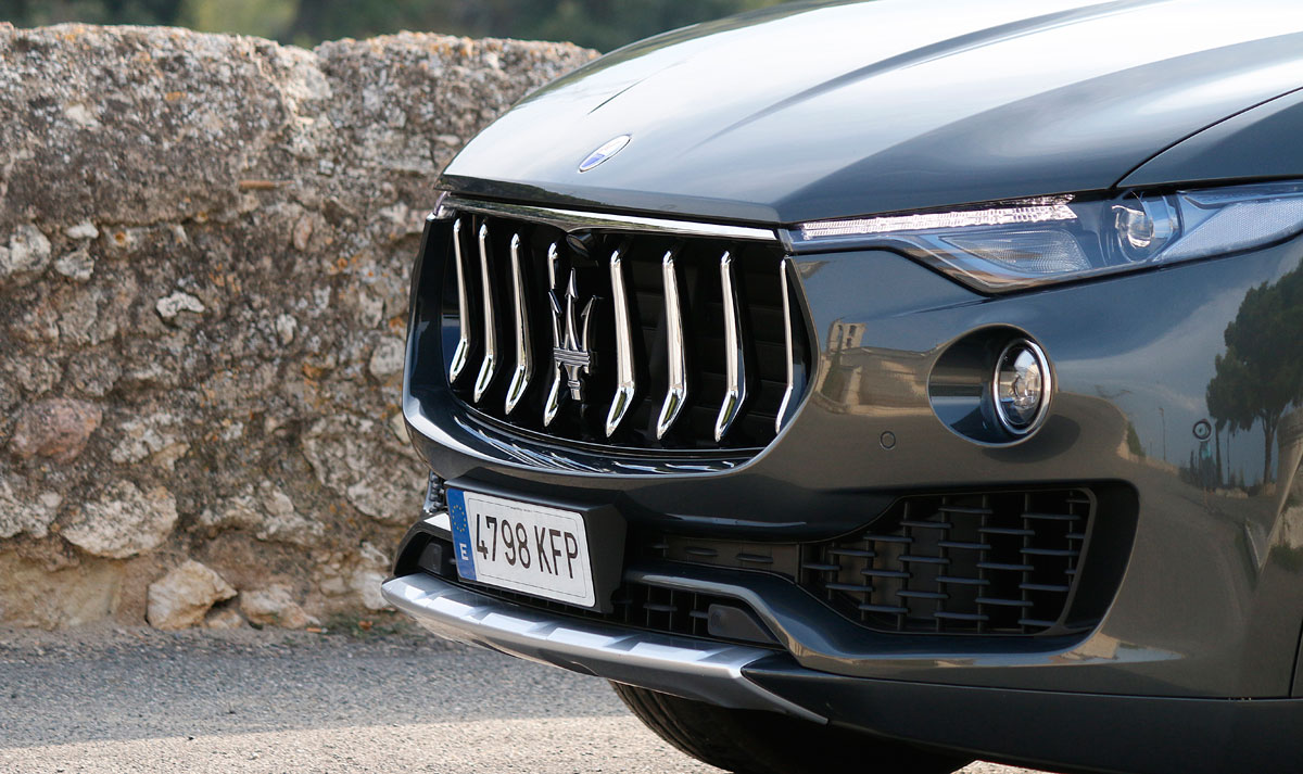 Su frontal, dispone de una parrilla que le da un aspecto imponente, en la que encontramos su signo de identidad, el Tridente. Tras esta, hay unas lamas activas que se abren y se cierran de forma automática para ofrecer mayor o menor flujo del aire al motor, a la vez qua ayudan en la mejora del coeficiente aerodinámico que cuya cifra en el Levante es de (Cx) de 0,31, siendo esta una de las mejores de su clase.