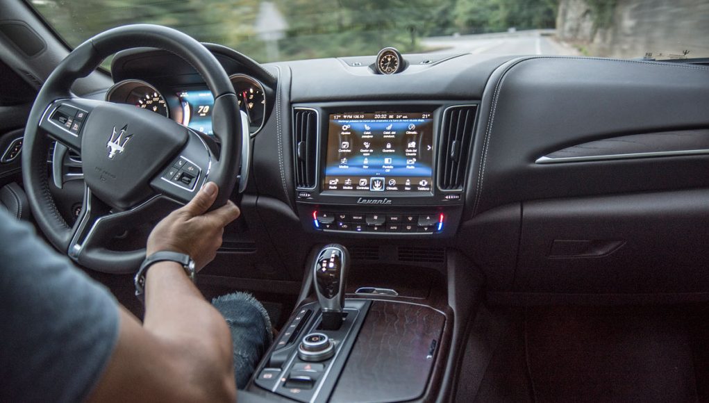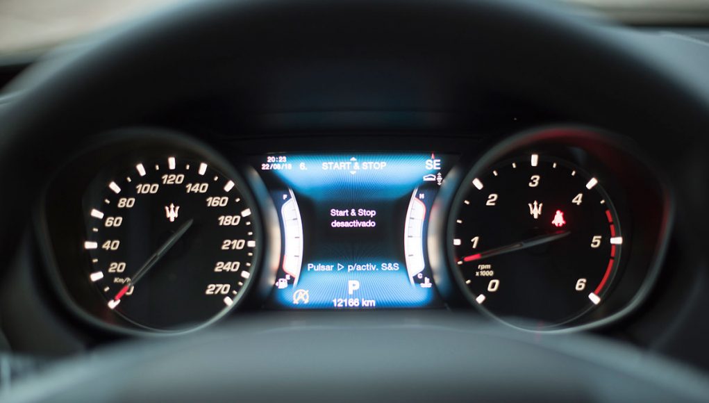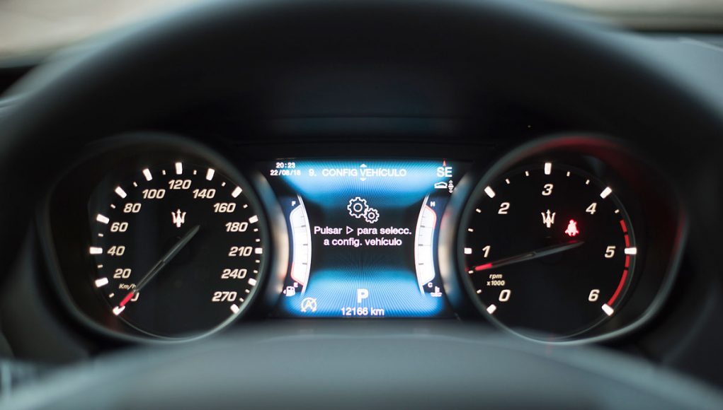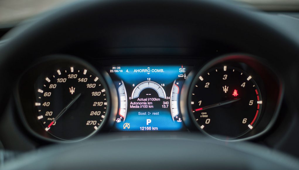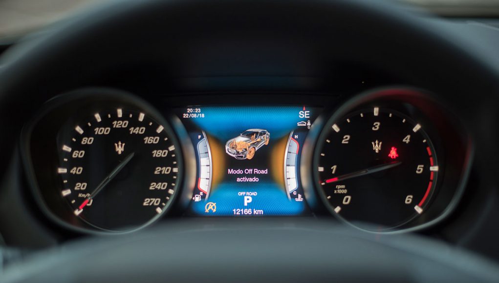 Tras el volante deportivo de tres radios que es multifunción e incorpora dos enormes levas para el manejo del cambio de forma secuencial, encontramos el cuadro de mandos que presenta dos esferas analógicas (como tiene que ser), separadas por una pantalla TFT de 7” en la que se pueden ver representados datos del ordenador de abordo o bien, la posición de la suspensión neumática, así como una grafía que muestra el porcentaje de par que el Levante entrega a cada uno de sus ejes entre otra información.