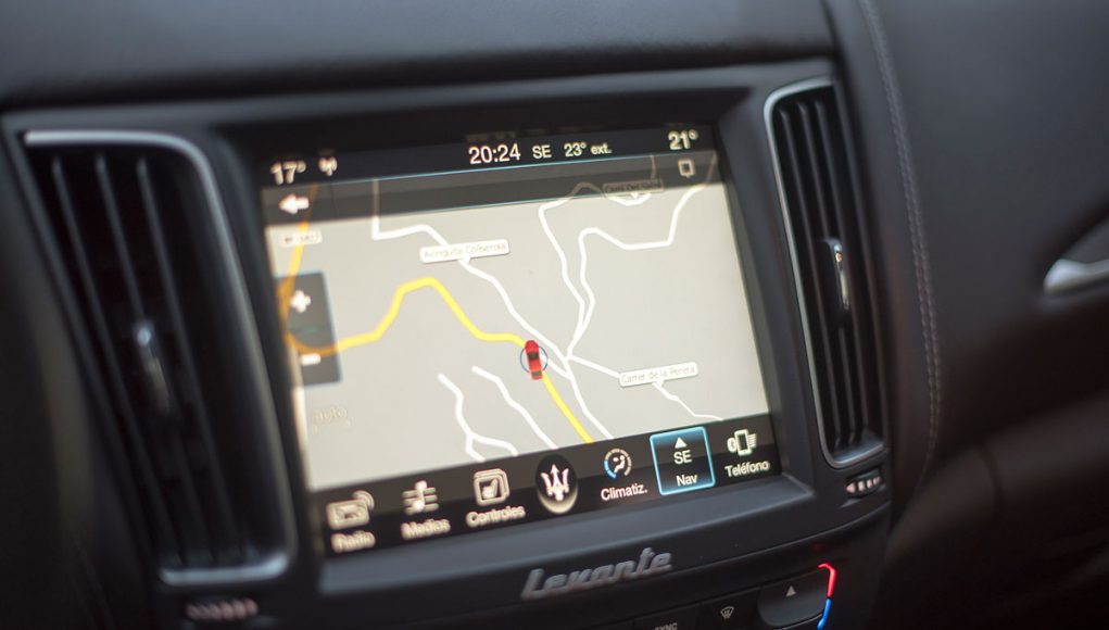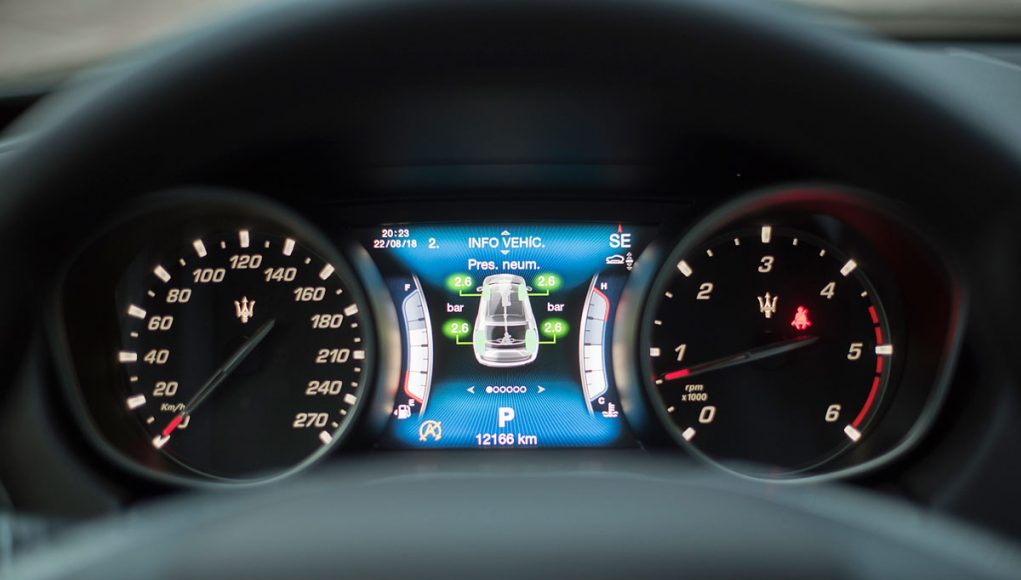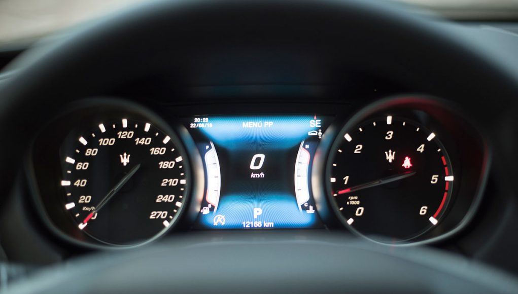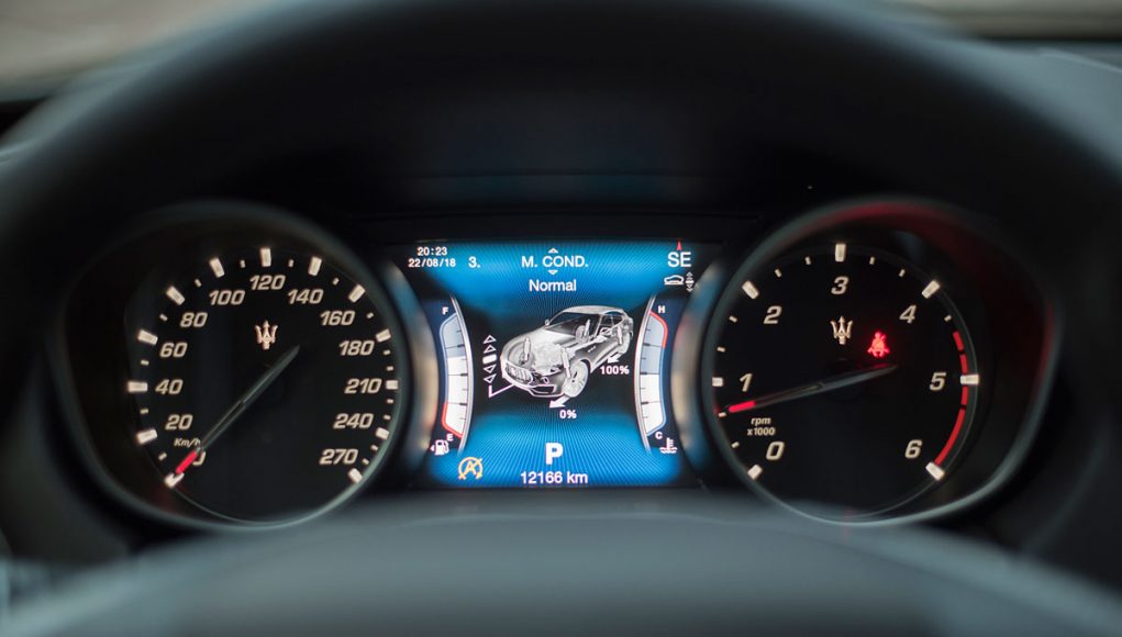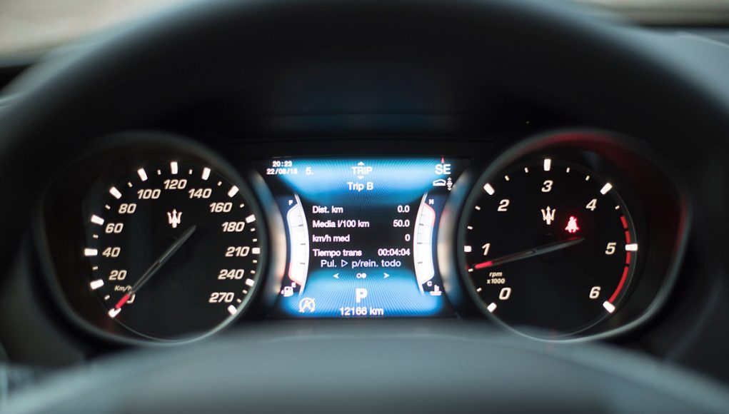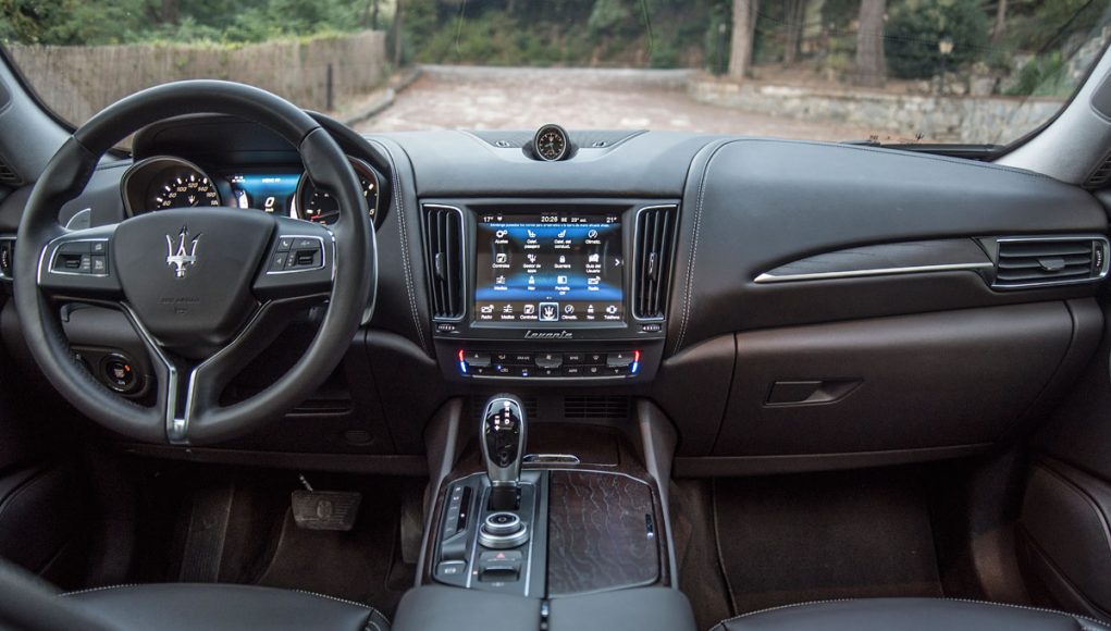 Tras el volante deportivo de tres radios que es multifunción e incorpora dos enormes levas para el manejo del cambio de forma secuencial, encontramos el cuadro de mandos que presenta dos esferas analógicas (como tiene que ser), separadas por una pantalla TFT de 7” en la que se pueden ver representados datos del ordenador de abordo o bien, la posición de la suspensión neumática, así como una grafía que muestra el porcentaje de par que el Levante entrega a cada uno de sus ejes entre otra información.
