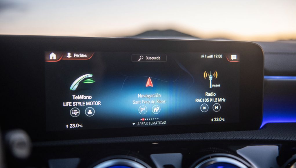 En el modelo probado, ambas pantallas miden 10,27 pulgadas y no tienen salpicadero ni protección por la zona superior. Si optas por un acabado más básico tendrás la misma distribución pero con superficies de 7 pulgadas. La pantalla central es táctil pero puede gestionarse a través del touchpad del panel central o a través de órdenes de voz naturales. Este último aspecto es uno de los más destacables de los nuevos Mercedes, más incluso que su sofisticado diseño.