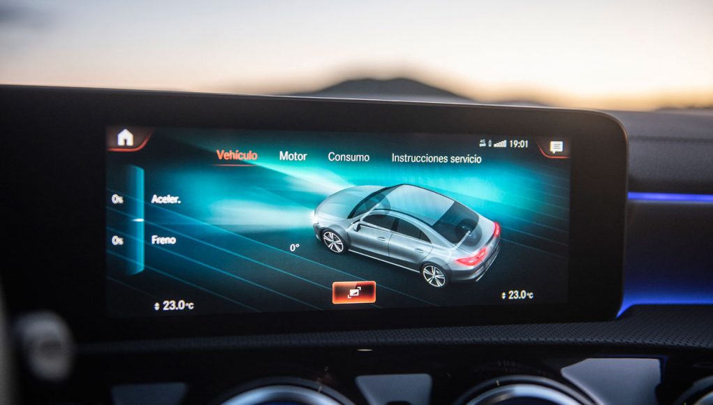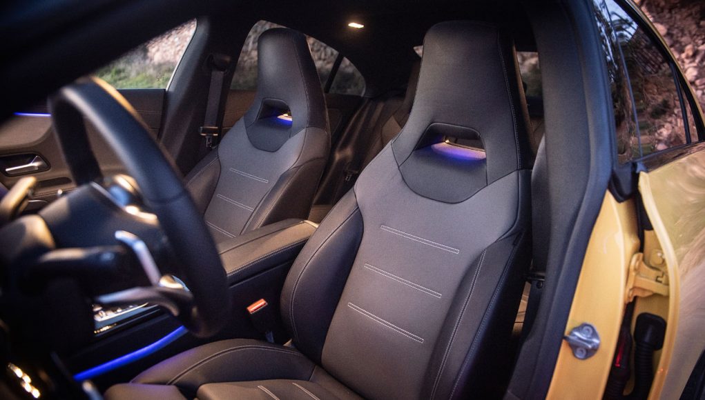 Antes de pasar a describir nuestras sensaciones al volante deberemos tener en cuenta los extras que incluía nuestra unidad. El Paquete Premium de 2 341 euros incluye ciertos sistemas de confort y ADAS (ayuda a la conducción y seguridad) como: cámara 360 grados para aparcar, control de distancia para aparcamiento, retrovisor antideslumbrante y plegables eléctricamente, acceso sin llave, asientos calefactados e iluminación ambiente, entre otros. También contaba con el techo corredizo panorámico de 1.252,35 euros, un extra 100% recomendable para mejorar la sensación de espacio en el interior. Los asientos deportivos del CLA probado cuestan 314 euros y no deberían ser una opción, su agarre en curva es casi perfecto para cualquier tamaño pero no renuncian a cierto confort para trayectos más largos.