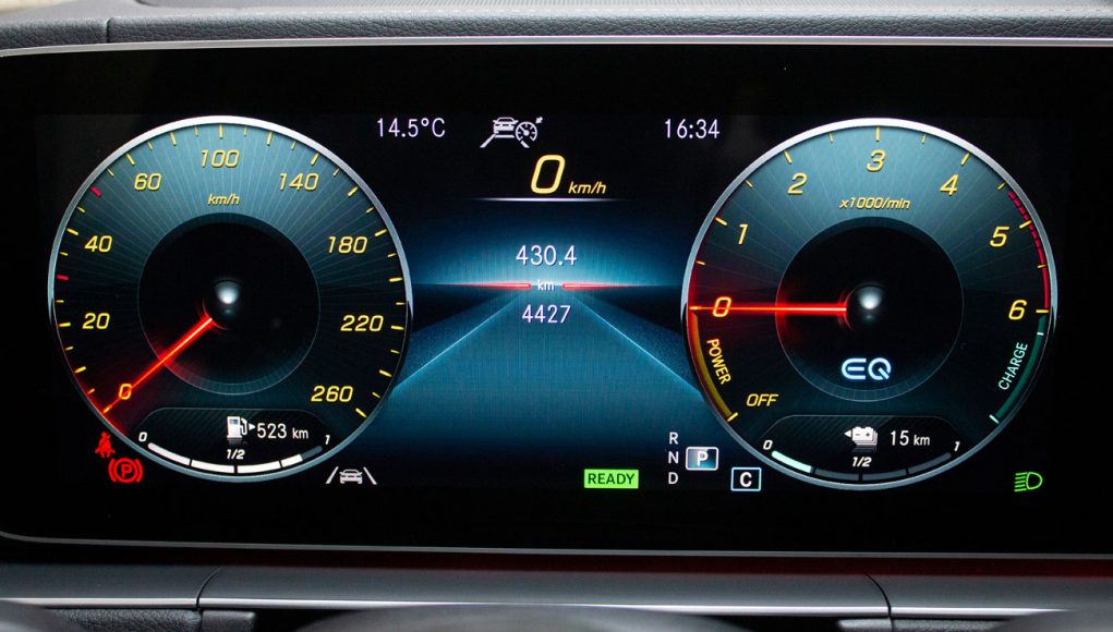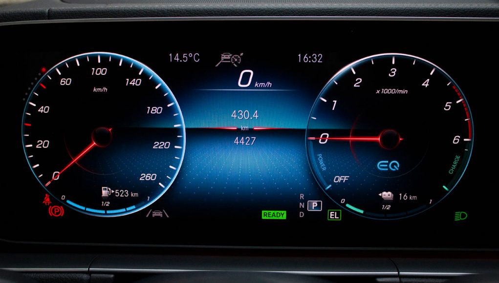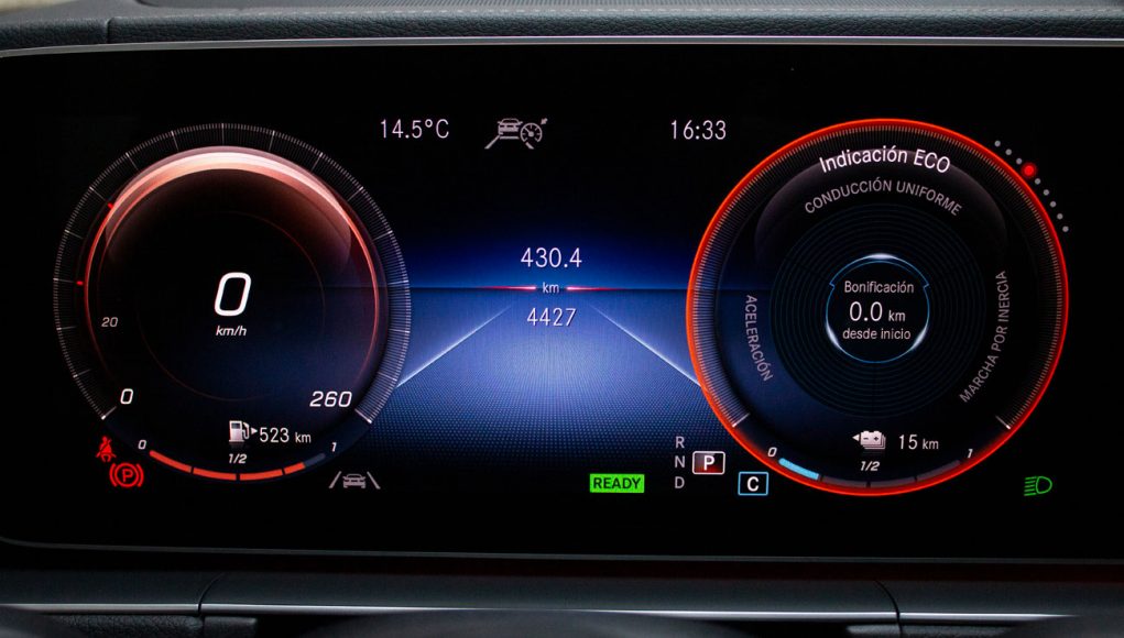 Como sucede con el Clase A 250e, el compacto híbrido enchufable de la marca, las levas dejan de activar las marchas en el modo Electric. Durante ese tipo de conducción sirven para regular el nivel de intensidad con la que actuará el motor eléctrico para retener el coche y recuperar energía de la desaceleración y la frenada. Existen los modos D+, D, D- y D–, además del D Auto que recurre a las cámaras frontales y la navegación para recomendar un tipo de retención u otra de forma instantánea. Personalmente descarté circular con este modo automático por su imprecisión, prefiero escoger la máxima retención para ciudad y liberarme de ella parcialmente para un tramo de curvas. Es más, no renunciaría completamente y aprovecharía esa retención para no desgastar tanto el sistema de frenos.