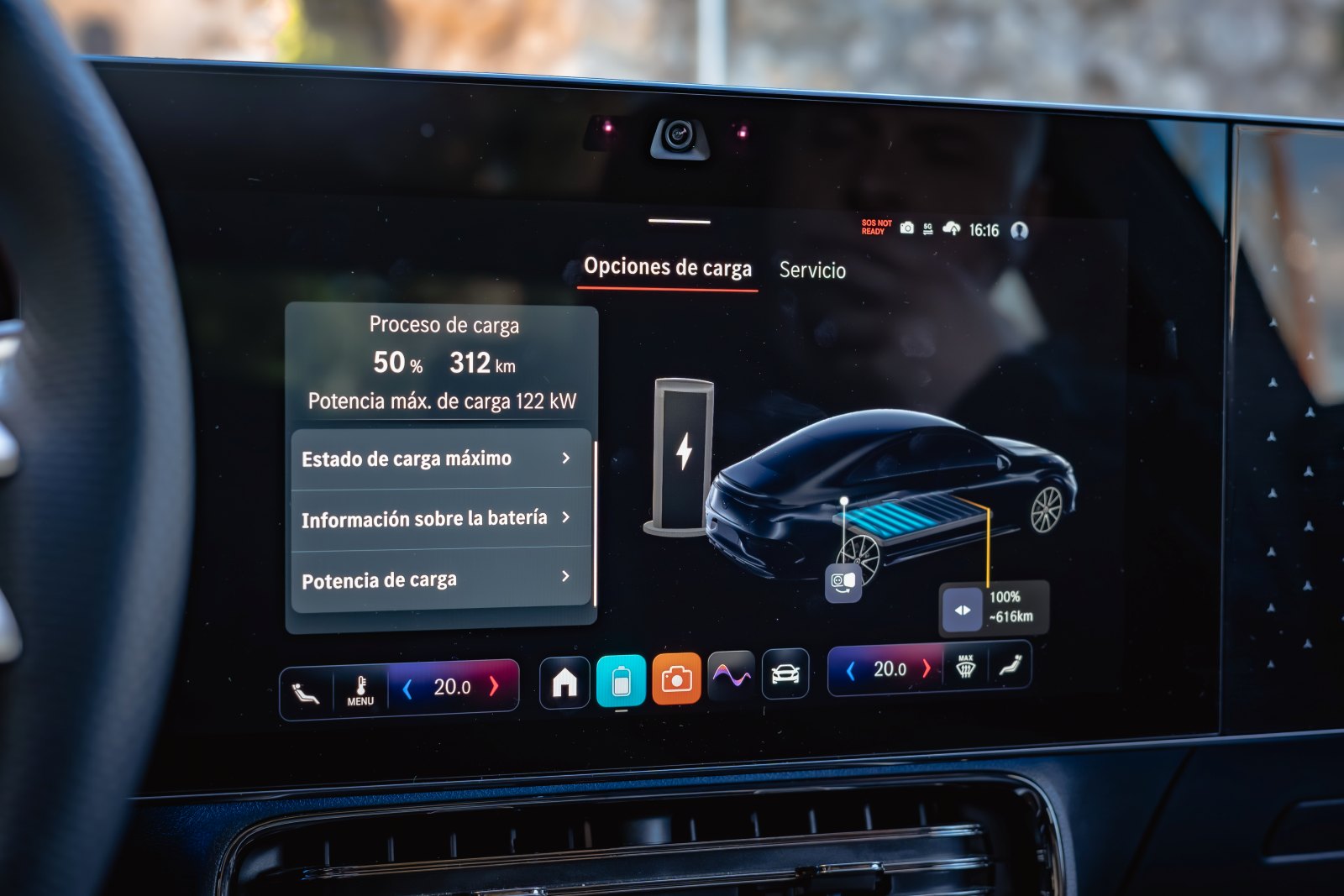 La toma de carga está situada en el lateral derecho y , alimenta una batería de níquel, manganeso y cobalto desarrollada por Mercedes-Benz, preparada para asumir ritmos de carga realmente serios ya que en corriente alterna admite hasta 22 kW, lo que permite completar una carga en unas nueve horas a 11 kW, ideal para dejarlo listo durante la noche en un cargador de casa, donde a mejores, cada 100 kms tendrían un coste aproximado de casi dos euros. Pero donde realmente saca pecho es en corriente continua, gracias a esos 320 kW máximos permiten pasar del 10 al 80% en solo 22 minutos, o recuperar 325 kilómetros de autonomía en apenas 10 minutos.