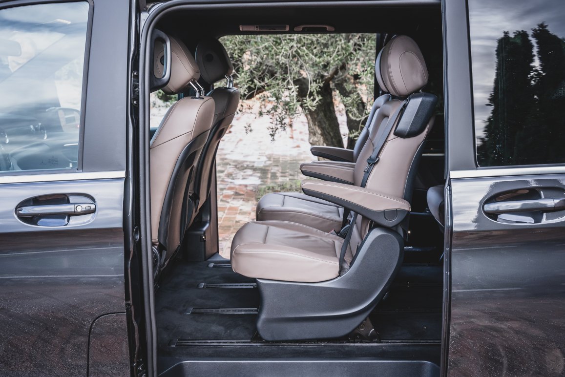 Para el interior del Clase V, se ofrecen diferentes configuraciones que pueden variar entre las 5 y las 8 plazas ya que la parte trasera es totalmente modulable pudiendo escoger entre opciones 2+2+3, 2+3+3, 2+3 o 2+2+2, aunque la más racional por así decirlo sea la de nuestra Clase V, 2+2+3. Opcionalmente los asientos traseros y con un sobre coste de 4.391€ pueden ser individuales y con las mismas funciones que encontraríamos en un Clase S, es decir con reglaje eléctrico completo, masaje, calefacción y ventilación. Todos estos asientos además permiten una modularidad interior impresionante, ya que podemos desplazarlos longitudinalmente en función del espacio que podamos precisar del maletero, podemos quitarlos o bien incluso podemos hasta girar en sentido de contra marcha el asiento del copiloto, o bien, dejarla sin asientos para tener una capacidad de carga que nada tendría que envidiar a su hermana la Vito.